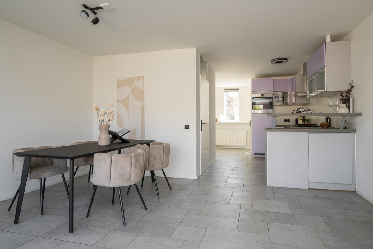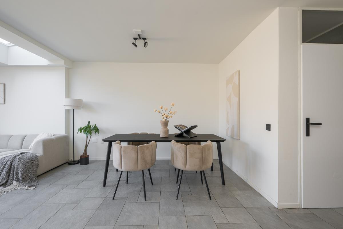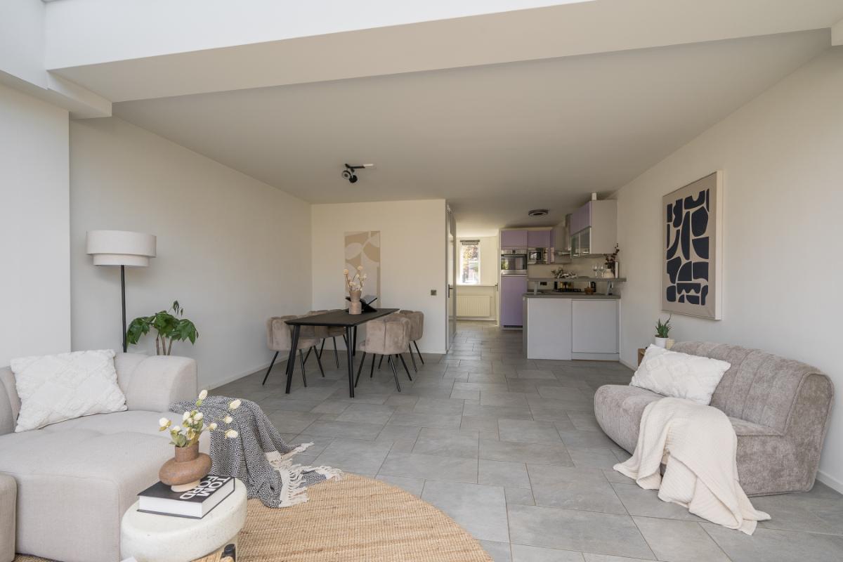 Indeling: Entree, hal, meterkast, aan de voorzijde de eetkamer en aansluitend de moderne keuken voorzien van diverse inbouwapparatuur met o.a. koelkast, vaatwasser, oven, magnetron en 5 pits gaskookplaat. Uitgebouwde tuingerichte woonkamer met lichtstraat en openslaande deuren naar de tuin. De vloer is voorzien van tegels met vloerverwarming (bijverwarming) en het plafond is strak gestukt. Tussenhal alwaar een modern vrijhangend toilet met fontein en de trapopgang;