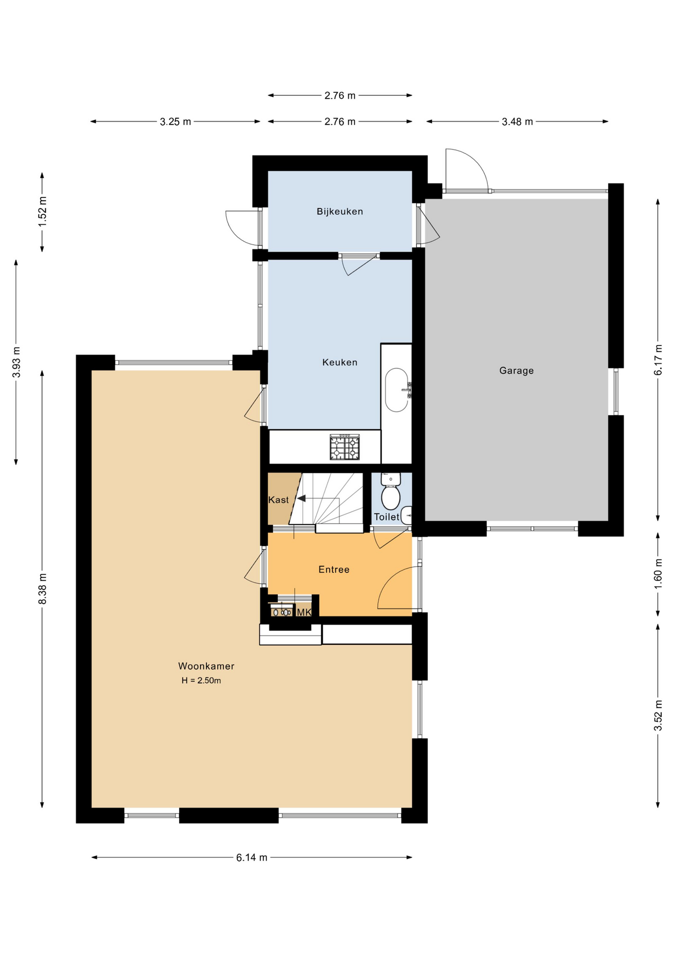 Begane grond Via de entree betreedt u de hal met toegang tot het toilet en de trapopgang. Vanuit de hal loopt u door naar de woonkamer van ca. 27 m²: een prettig ingedeelde leefruimte met een plafondhoogte van ca. 2,50 m (volgens plattegrond). Op de begane grond bevindt zich tevens de keuken en aansluitend een bijkeuken: een praktische ruimte voor extra voorraad, witgoed of een garderobe.