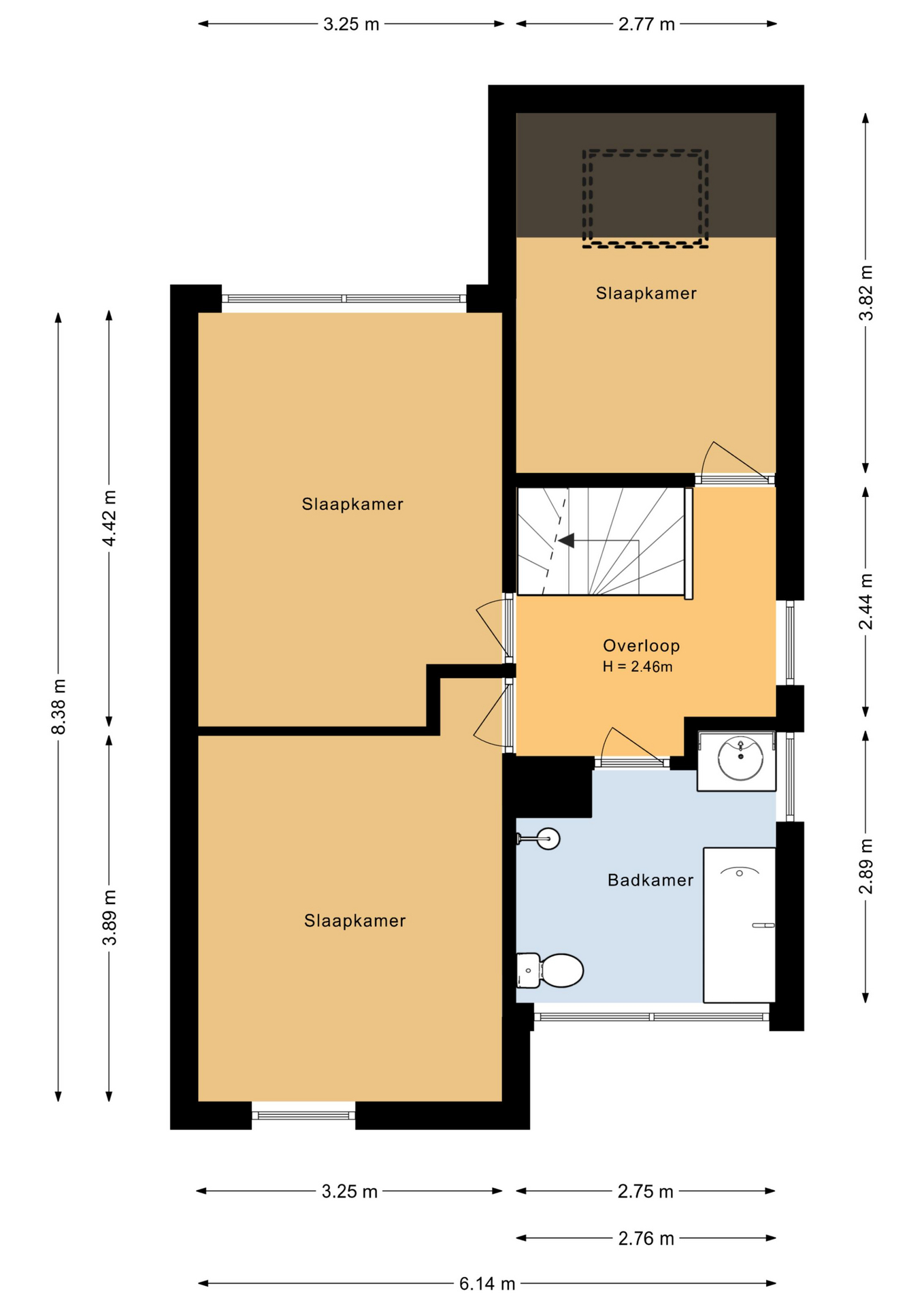 Eerste verdieping De eerste verdieping biedt drie slaapkamers, een overloop en een badkamer. De verdieping heeft een plafondhoogte van ca. 2,46 m. De badkamer is compleet uitgevoerd met ligbad, douche, toilet en wastafel.