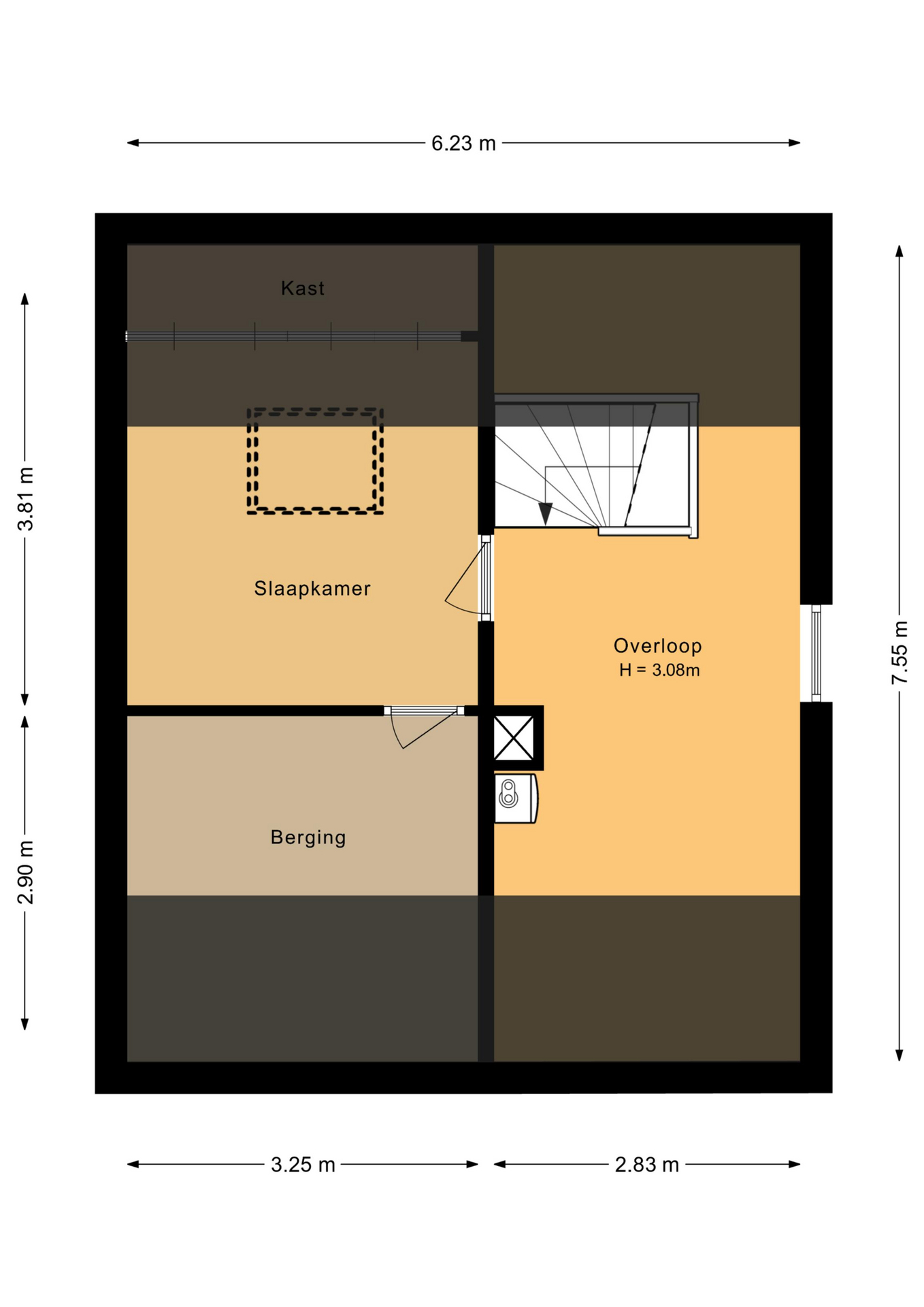 Tweede verdieping Op de tweede verdieping treft u de vierde (slaap)kamer en een berging. De nokhoogte bedraagt volgens de plattegrond ca. 3,08 m, waardoor de ruimte verrassend luchtig aanvoelt. Dankzij de extra bergruimte blijft ook hier alles netjes geordend.