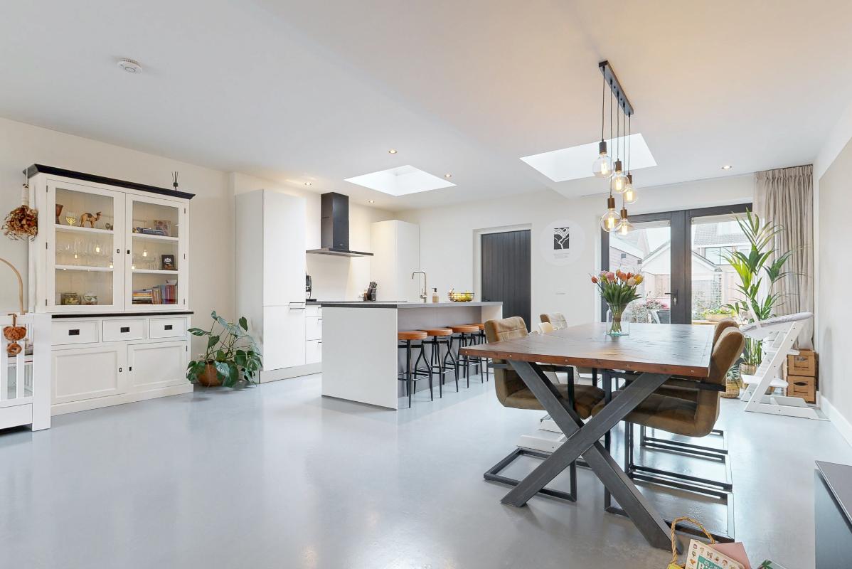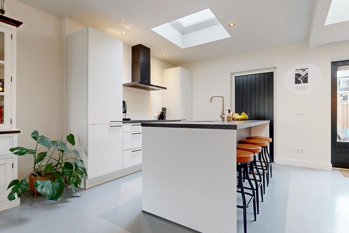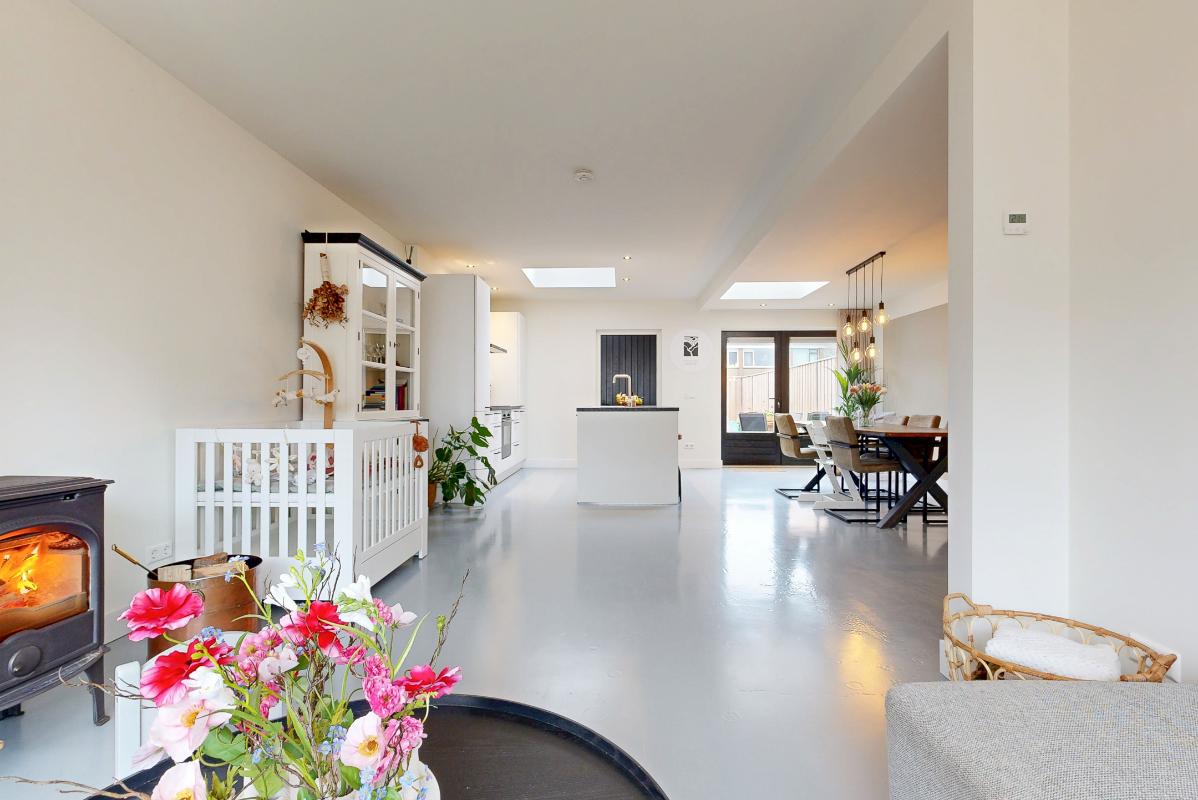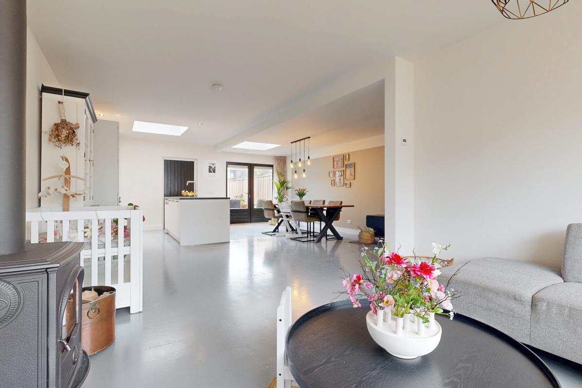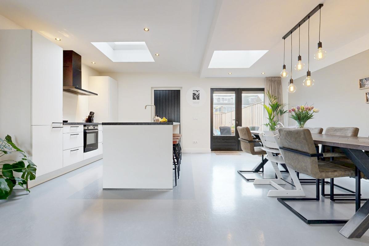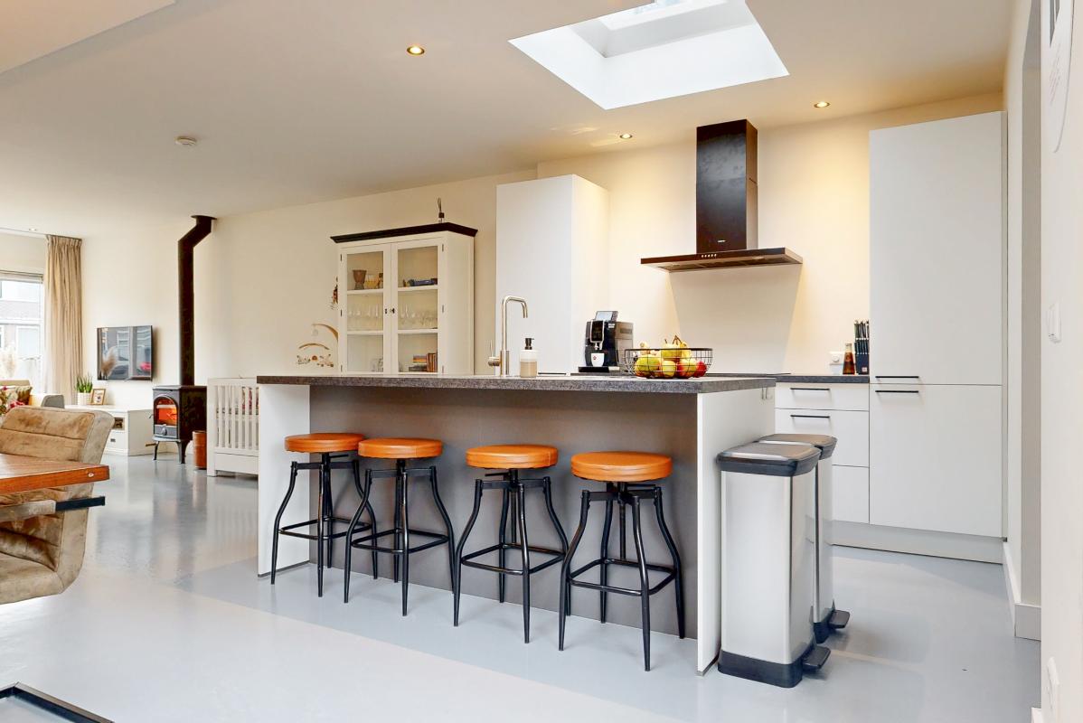 Bij binnenkomst tref je de hal met modern toilet, trapkast met meterkast en trapopgang naar de eerste verdieping. De sfeervolle woonkamer aan de voorzijde van de woning is voorzien van een gezellige houtkachel en lichtspots in het plafond. Aan de achterzijde is de woning uitgebouwd, waarbij twee lichtkoepels zorgen voor een fijne natuurlijke lichtinval. De open keuken vormt het hart van de woning en beschikt over een stijlvol spoeleiland en diverse inbouwapparatuur. Vanuit de keuken geven openslaande deuren toegang tot de achtertuin. De woning is volledig geïsoleerd en voorzien van vloerverwarming wat zorgt voor optimaal comfort.