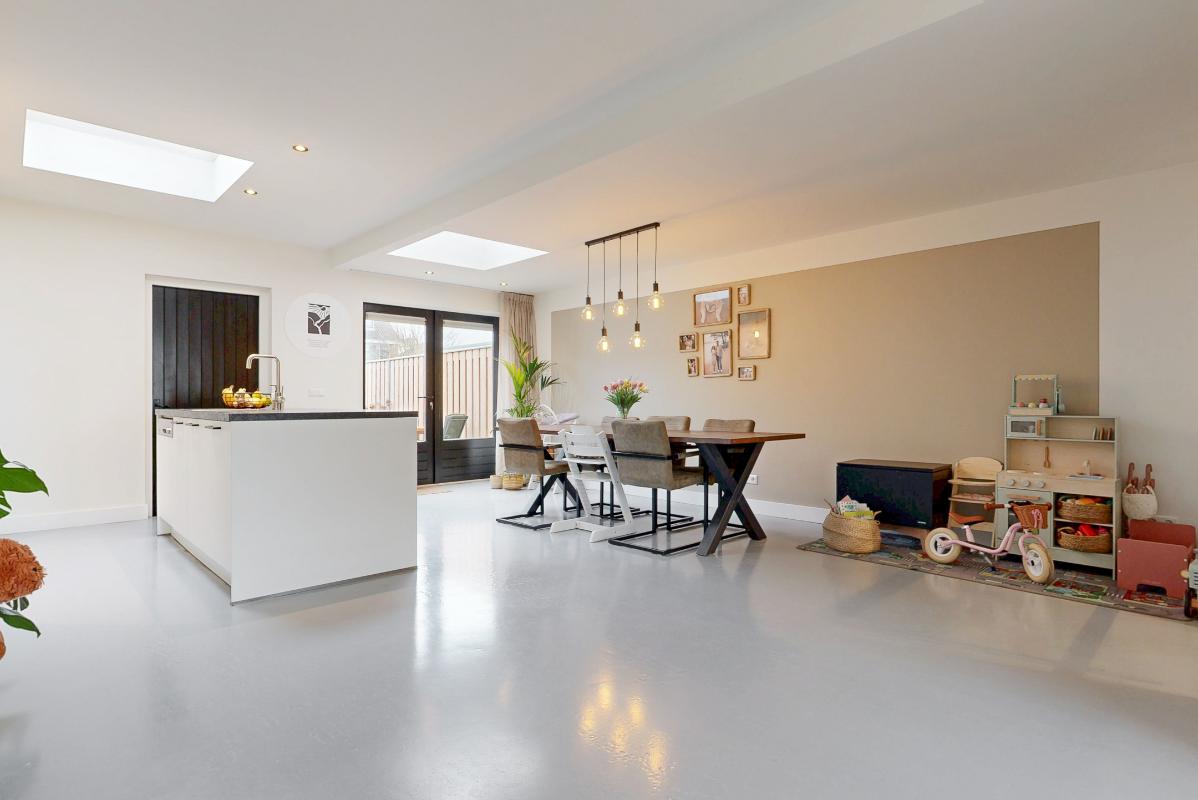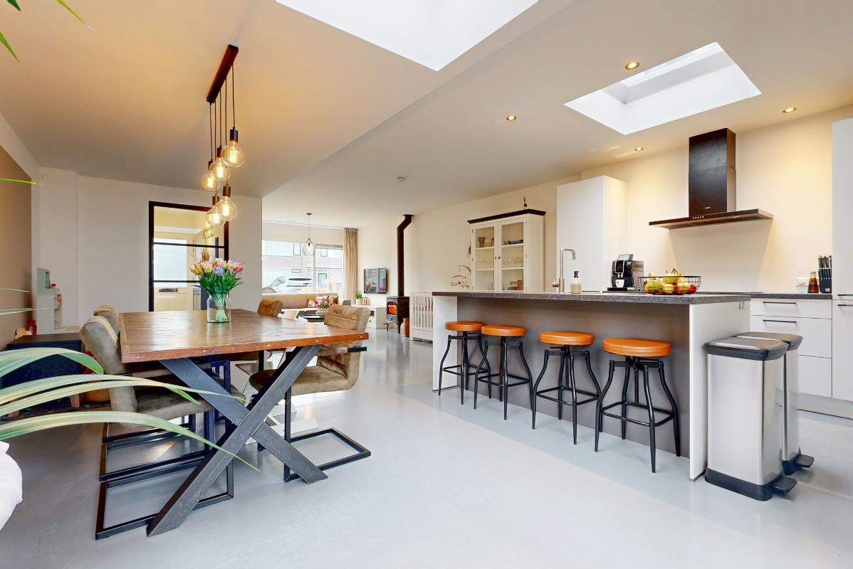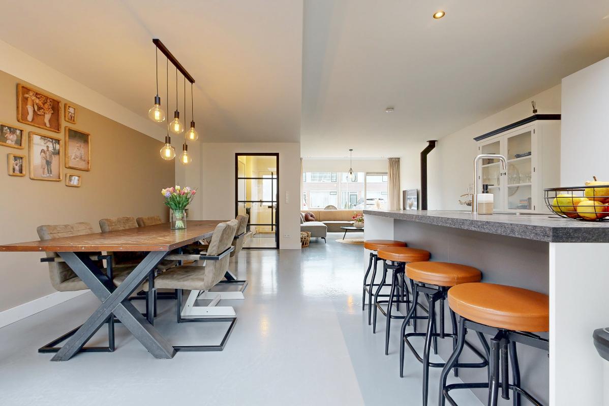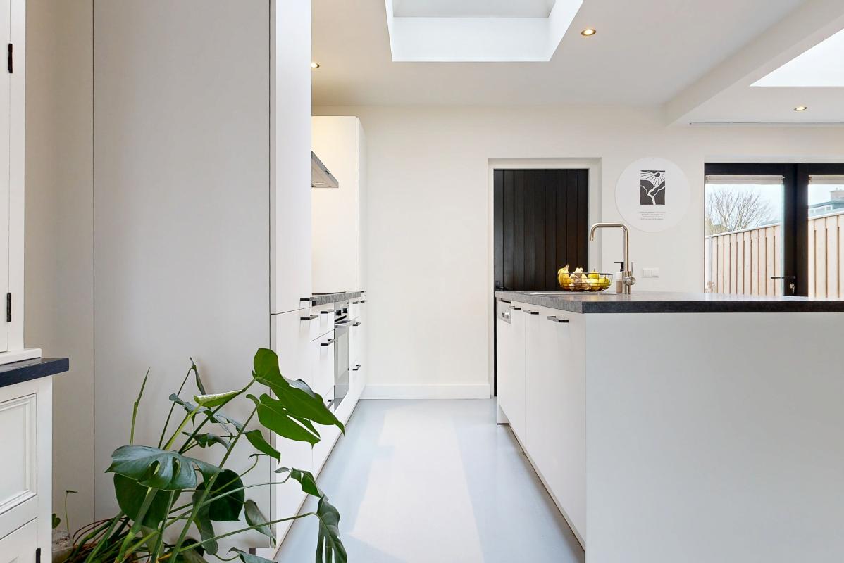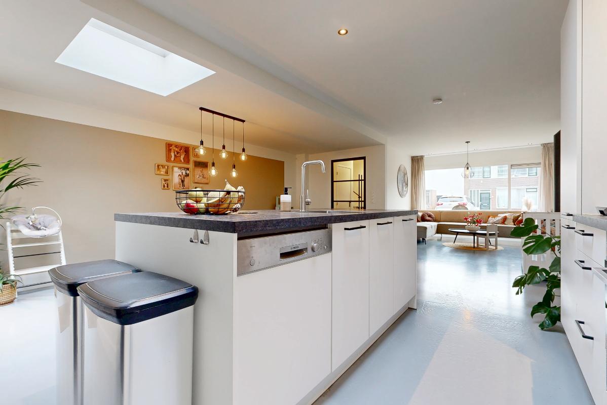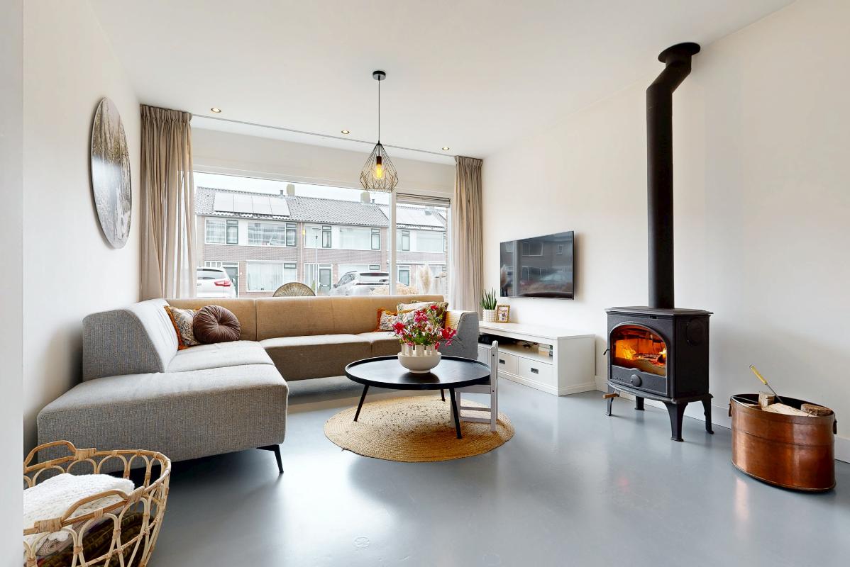 Bij binnenkomst tref je de hal met modern toilet, trapkast met meterkast en trapopgang naar de eerste verdieping. De sfeervolle woonkamer aan de voorzijde van de woning is voorzien van een gezellige houtkachel en lichtspots in het plafond. Aan de achterzijde is de woning uitgebouwd, waarbij twee lichtkoepels zorgen voor een fijne natuurlijke lichtinval. De open keuken vormt het hart van de woning en beschikt over een stijlvol spoeleiland en diverse inbouwapparatuur. Vanuit de keuken geven openslaande deuren toegang tot de achtertuin. De woning is volledig geïsoleerd en voorzien van vloerverwarming wat zorgt voor optimaal comfort.