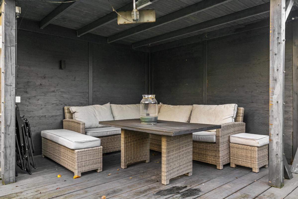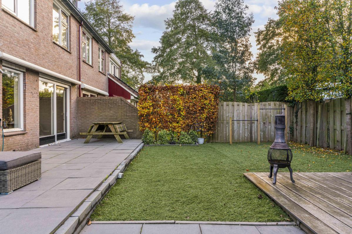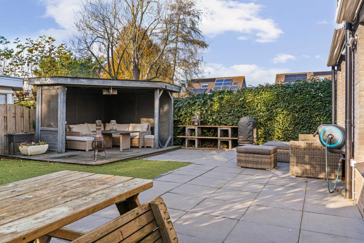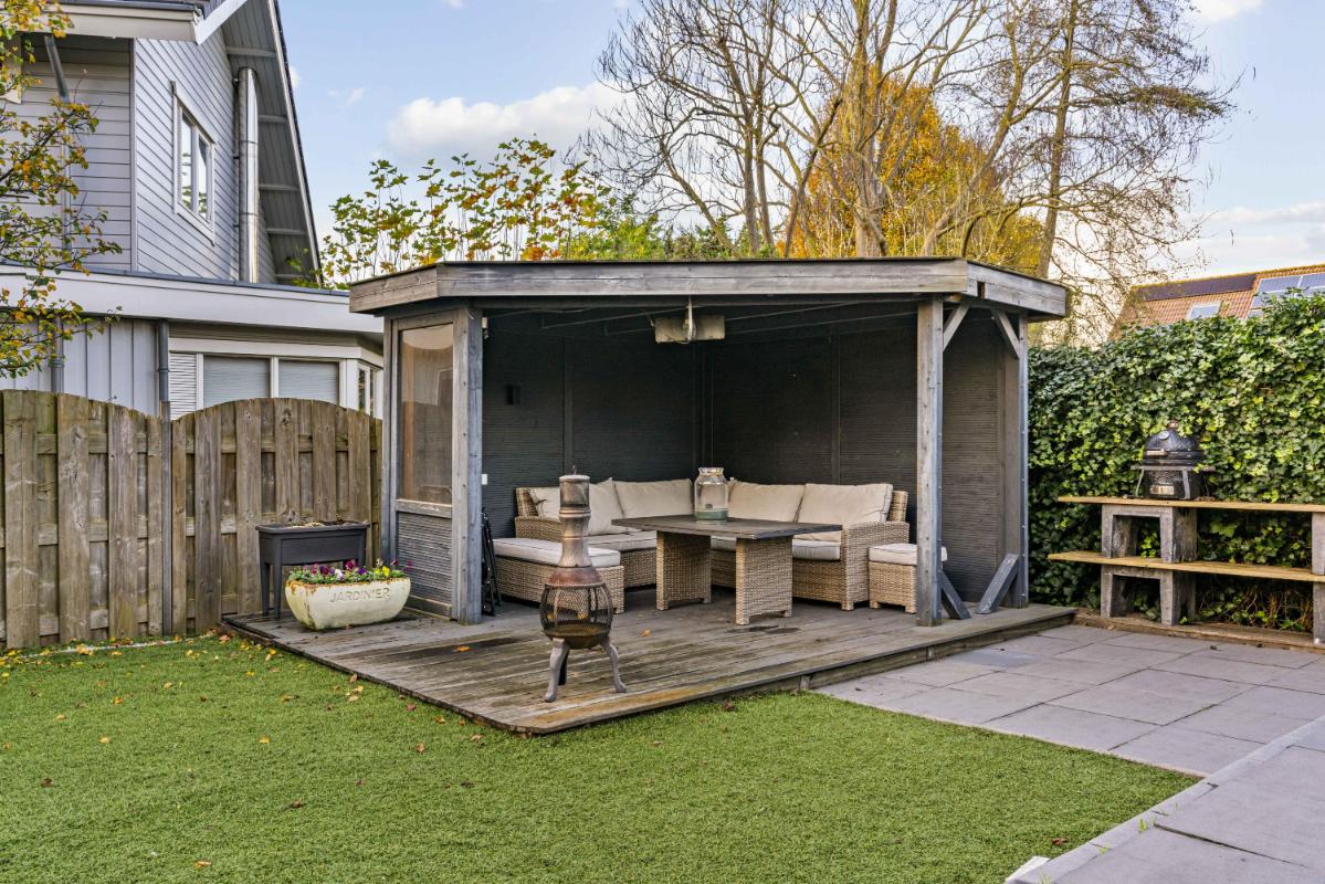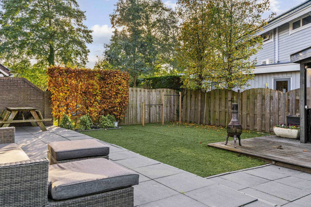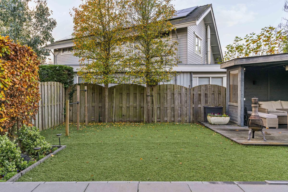 Buiten wacht een fantastische op het westen gelegen achtertuin, strak en speels aangelegd met groenperken, kunstgras en sierbestrating. Onder de prachtige overkapping kun je het hele jaar door genieten van het buitenleven. Parkeren? Geen probleem! Op eigen terrein kunnen twee auto’s staan en in de garage kun je er zelfs nóg één kwijt.