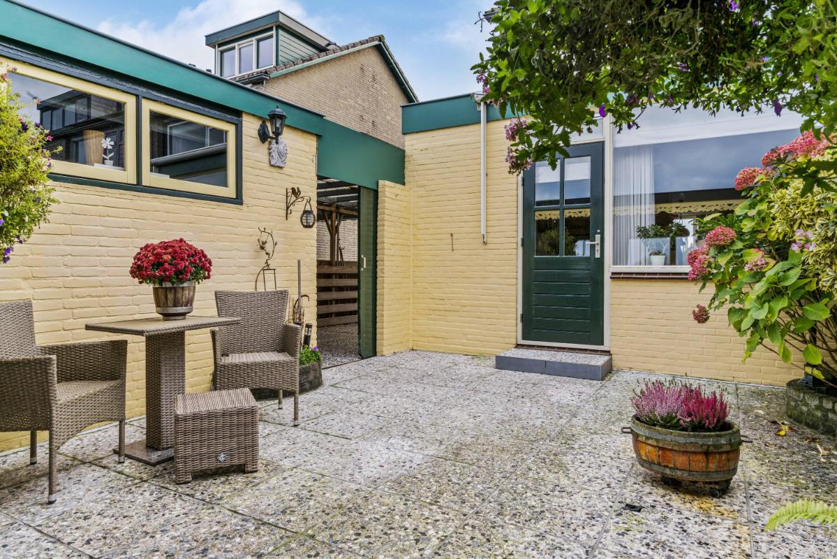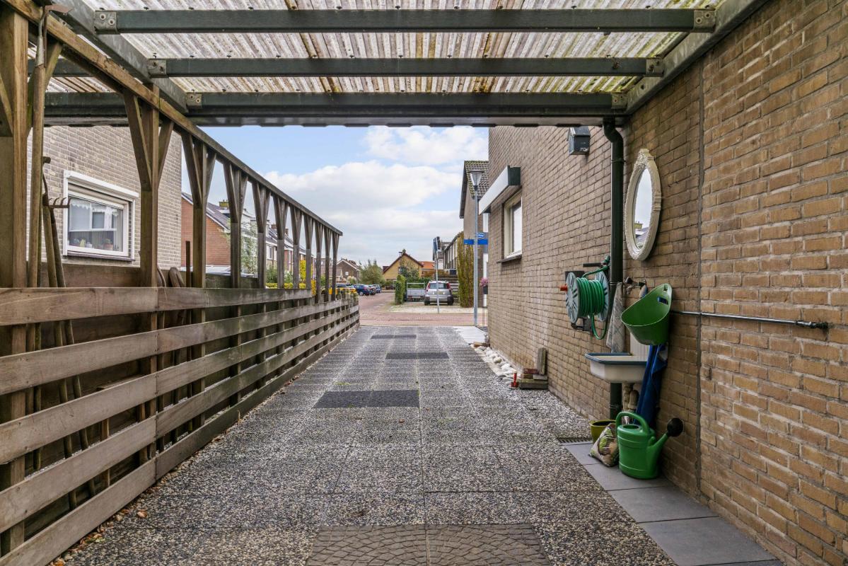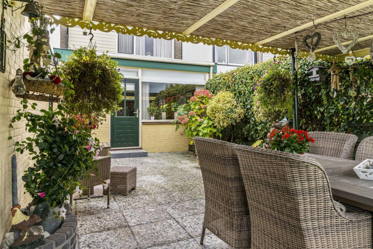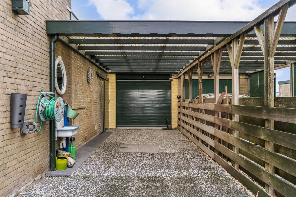 De achtertuin ligt op het westen, waardoor je tot in de avond van de zon kunt genieten. Onder de overkapping is het goed toeven, ook bij minder weer. Het onderheide terras biedt een solide basis en ook hier is het uitzicht ronduit prachtig. Vanuit de tuin is er toegang tot de garage, en achter de garage bevindt zich nog een extra berging — ideaal voor fietsen of gereedschap.