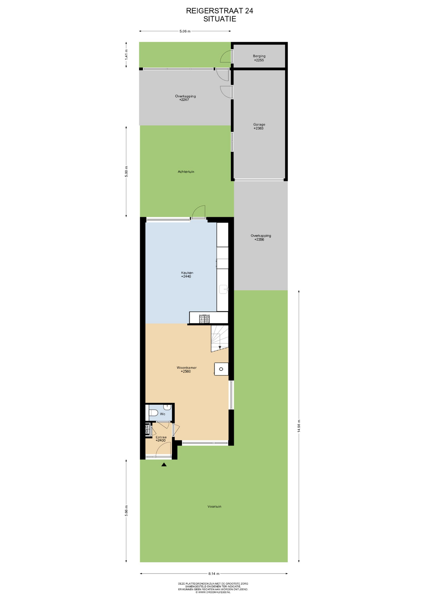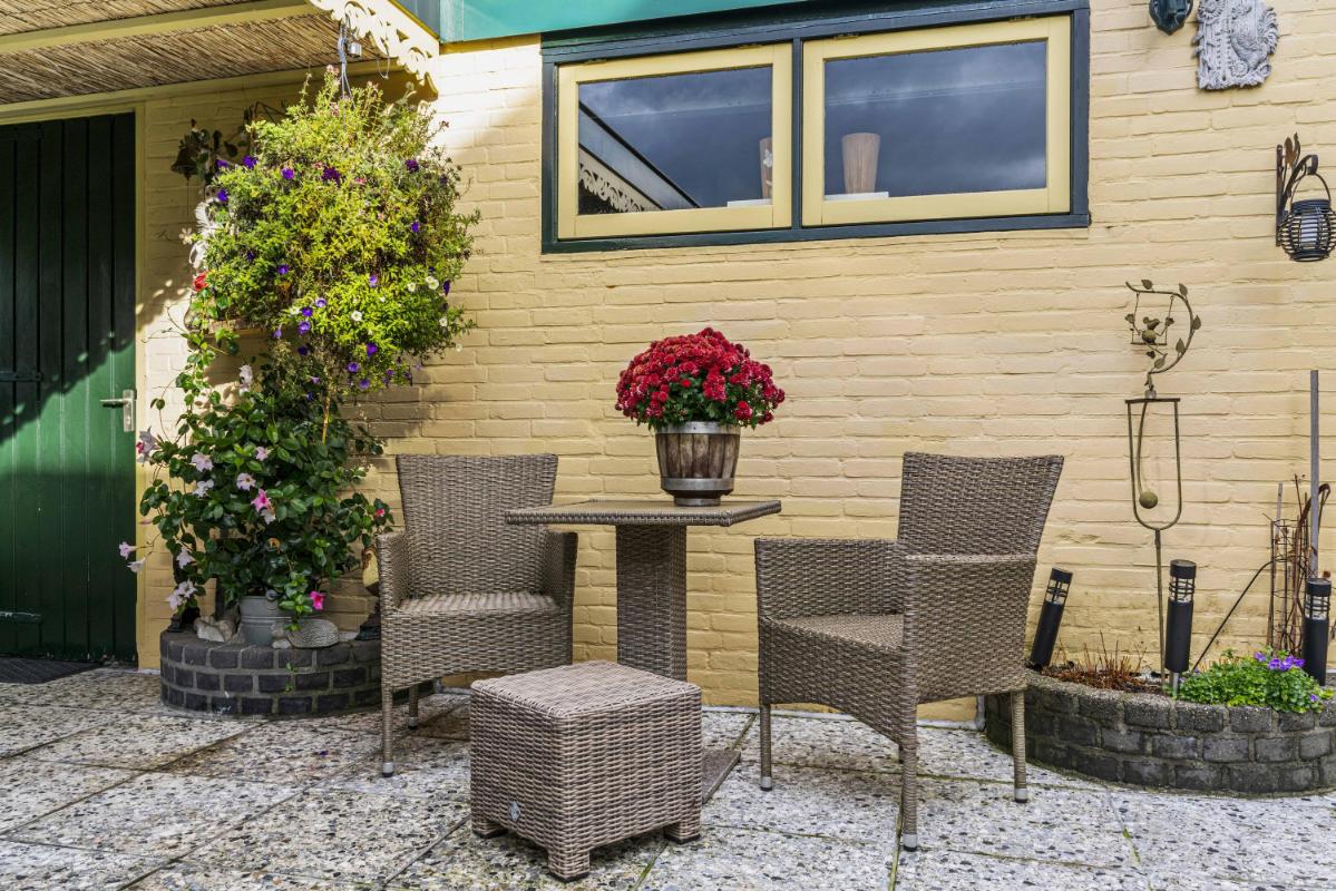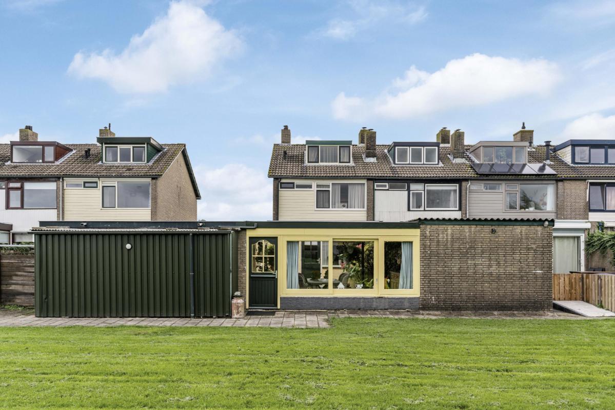 De achtertuin ligt op het westen, waardoor je tot in de avond van de zon kunt genieten. Onder de overkapping is het goed toeven, ook bij minder weer. Het onderheide terras biedt een solide basis en ook hier is het uitzicht ronduit prachtig. Vanuit de tuin is er toegang tot de garage, en achter de garage bevindt zich nog een extra berging — ideaal voor fietsen of gereedschap.
