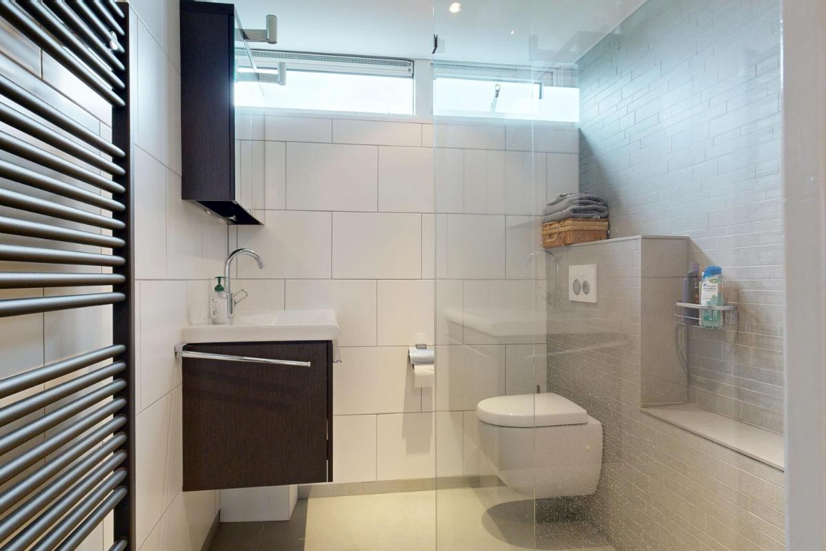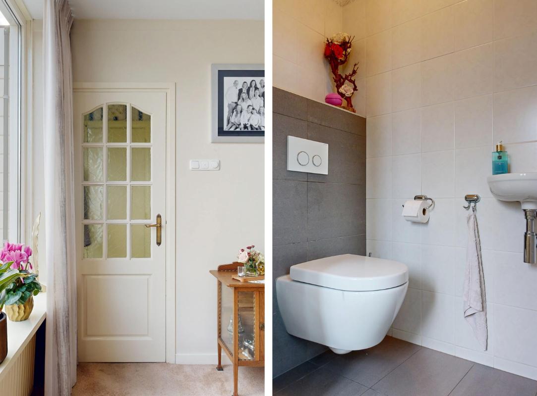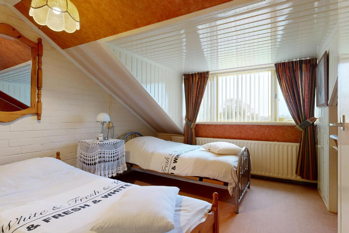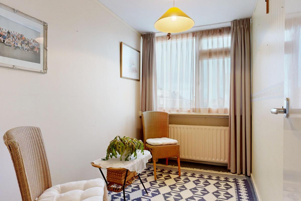 Op de eerste verdieping bevinden zich nu twee slaapkamers, waarvan één extra ruim is doordat een tussenmuur is verwijderd. Wil je weer drie slaapkamers creëren? Dat kan eenvoudig, want de oorspronkelijke deuren zijn nog aanwezig. De badkamer is compleet uitgevoerd met douche, wastafel, tweede toilet en vloerverwarming. Op de overloop bevindt zich een praktische opbergkast.