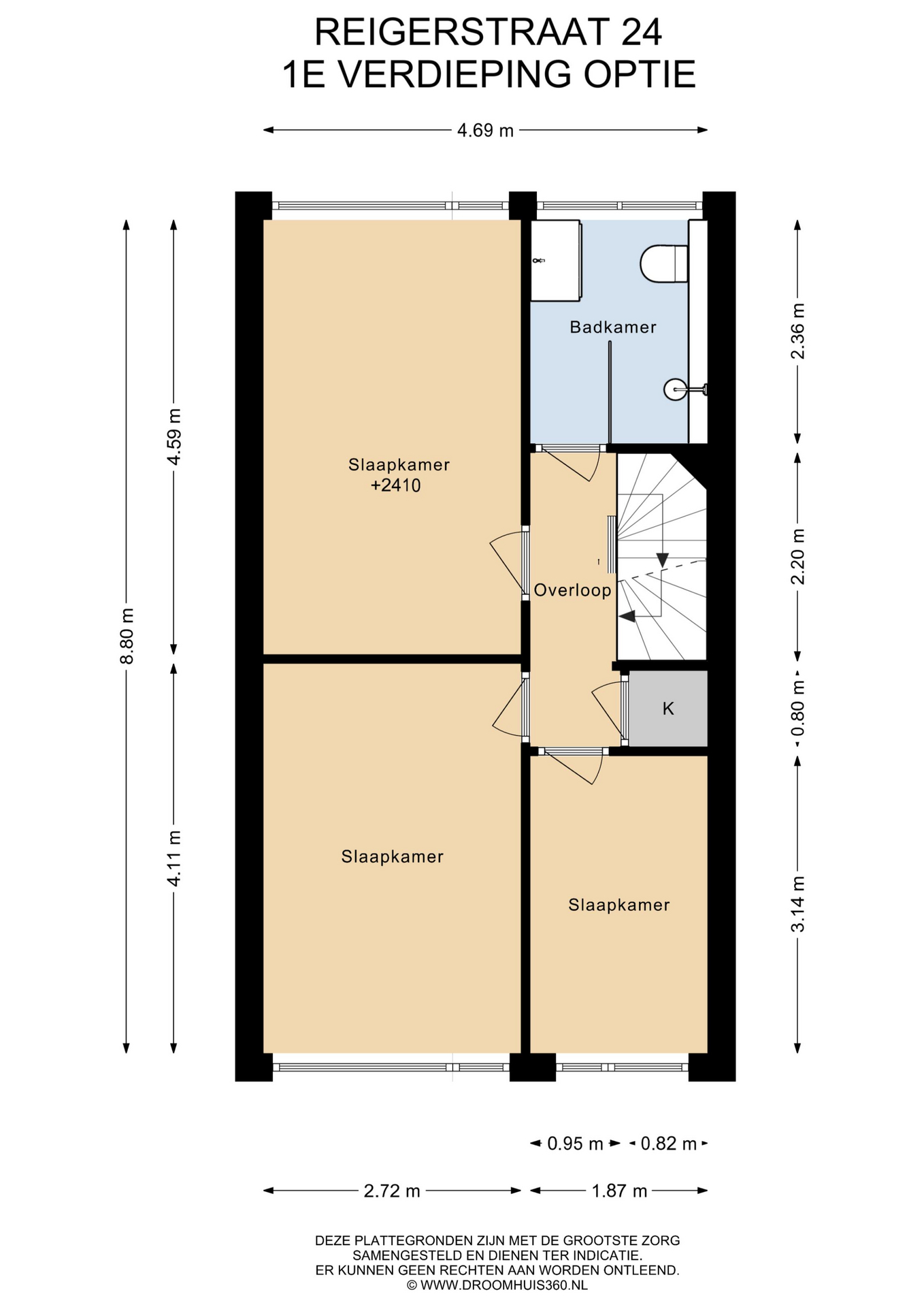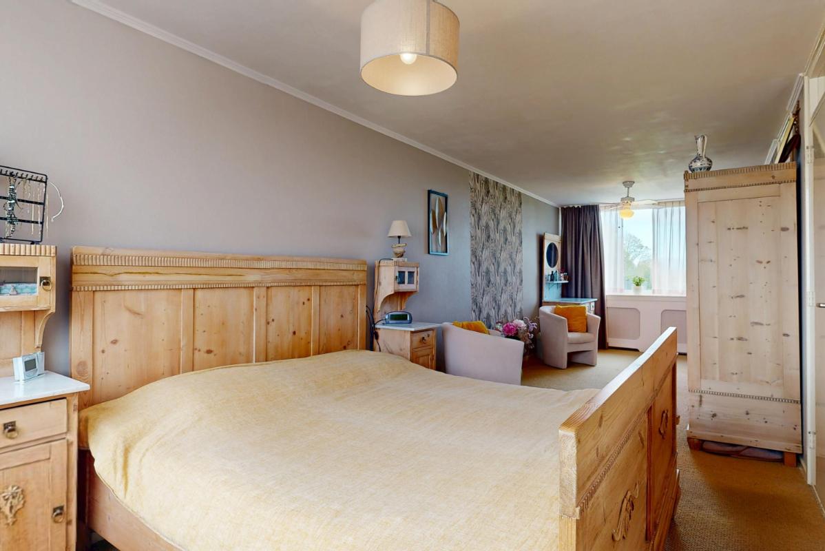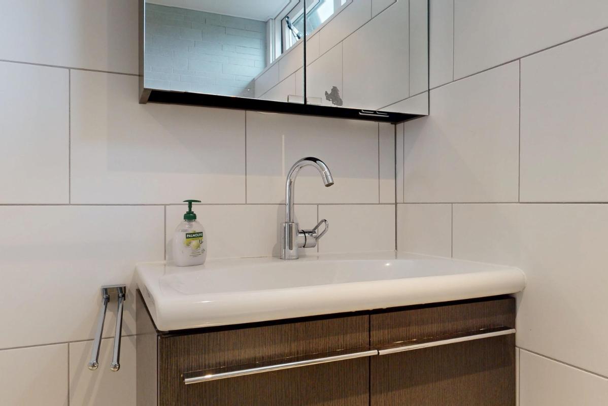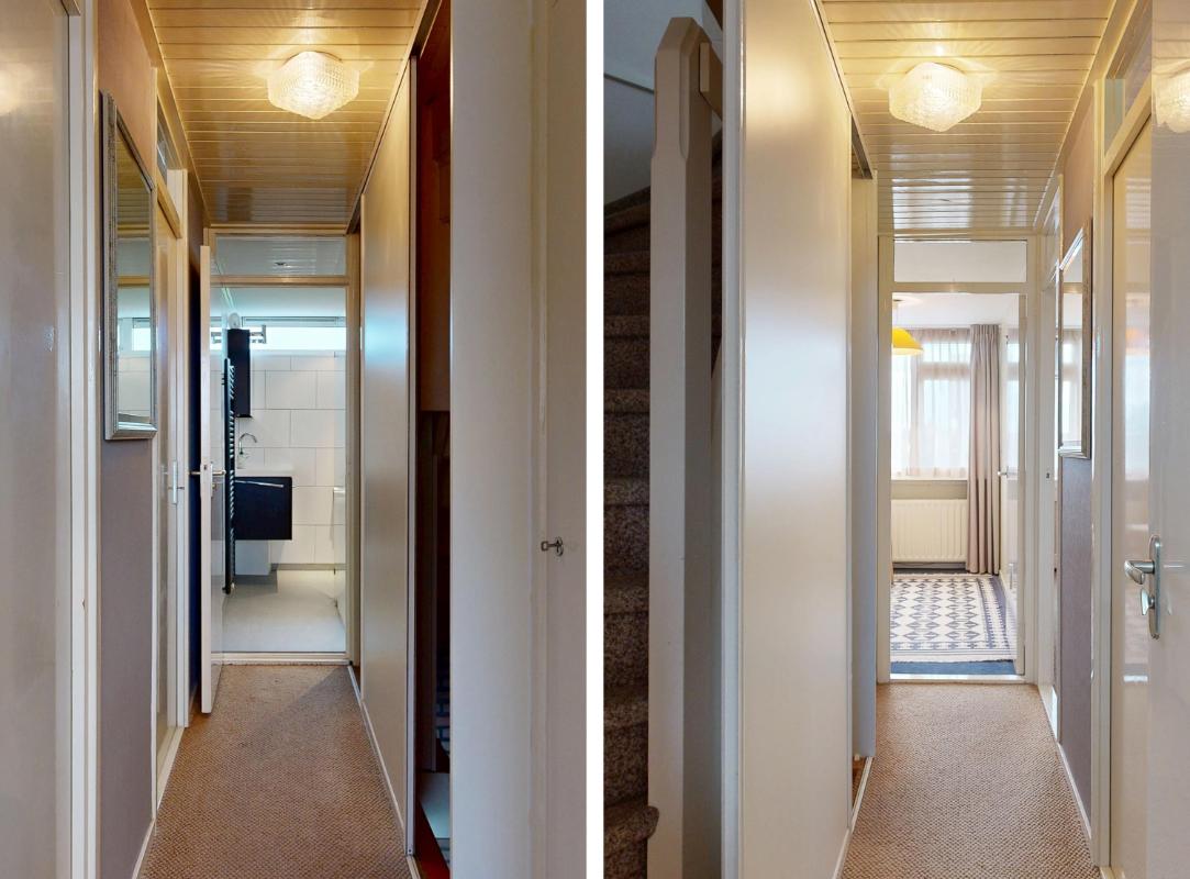 Op de eerste verdieping bevinden zich nu twee slaapkamers, waarvan één extra ruim is doordat een tussenmuur is verwijderd. Wil je weer drie slaapkamers creëren? Dat kan eenvoudig, want de oorspronkelijke deuren zijn nog aanwezig. De badkamer is compleet uitgevoerd met douche, wastafel, tweede toilet en vloerverwarming. Op de overloop bevindt zich een praktische opbergkast.