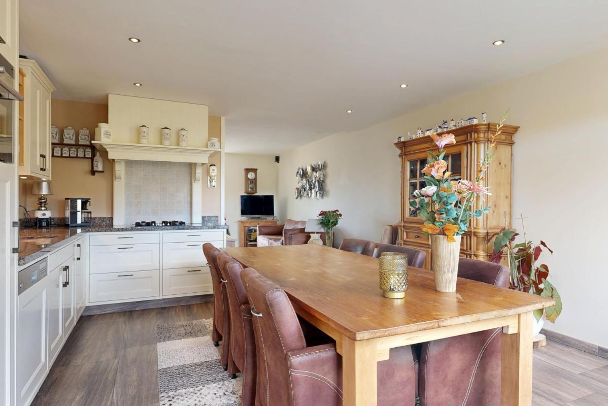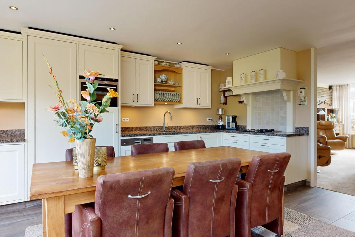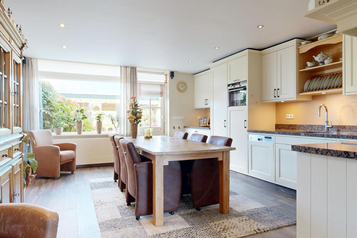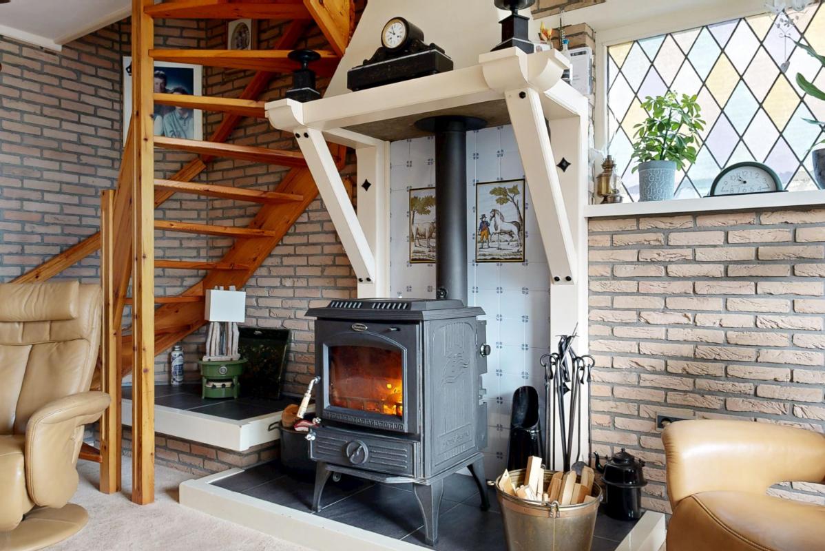 Je komt binnen via de entree met toilet, kapstok en meterkast. Vanuit de hal stap je de lichte woonkamer binnen, waar de houtkachel met schouw direct zorgt voor een warme, huiselijke sfeer. Aan de achterzijde bevindt zich de uitgebouwde woonkeuken met vloerverwarming — een heerlijke plek om te koken, te tafelen en te genieten van het fenomenale uitzicht over de polder.