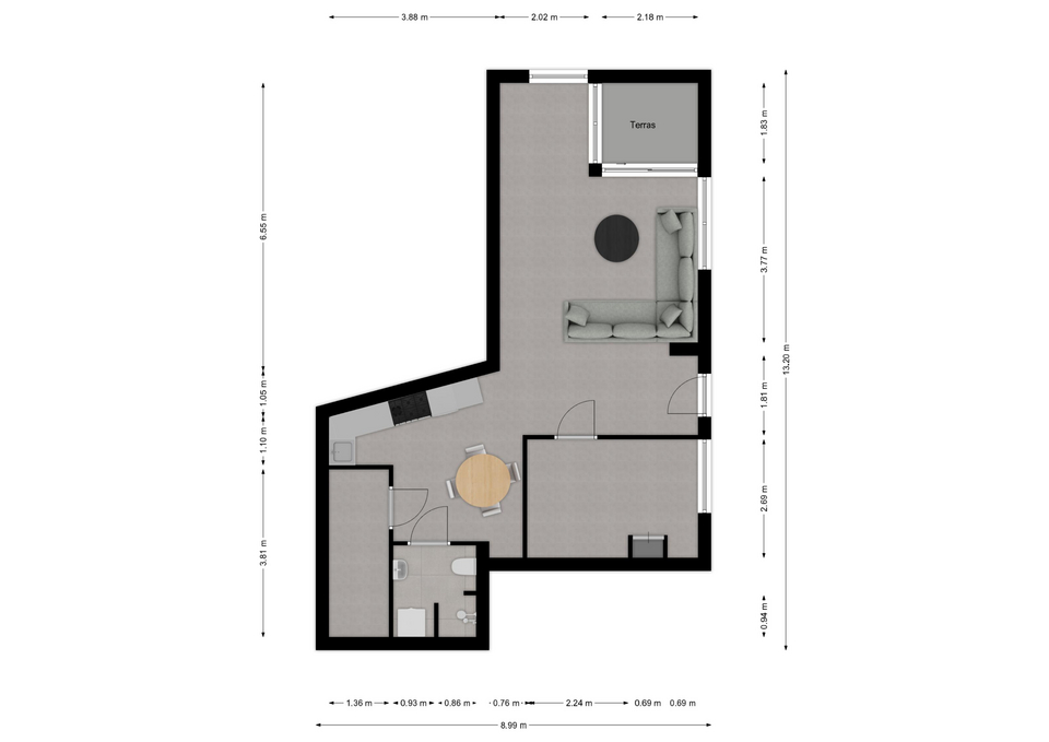 U komt binnen via de entree met toegang tot de woonkamer. Deze is licht en ruim en biedt directe toegang tot een terras, ideaal voor een zitje buiten. De open keuken is functioneel ingericht met een 5-pits gasfornuis, koelkast, vaatwasser en combi-oven en vormt een praktische combinatie met de leefruimte.