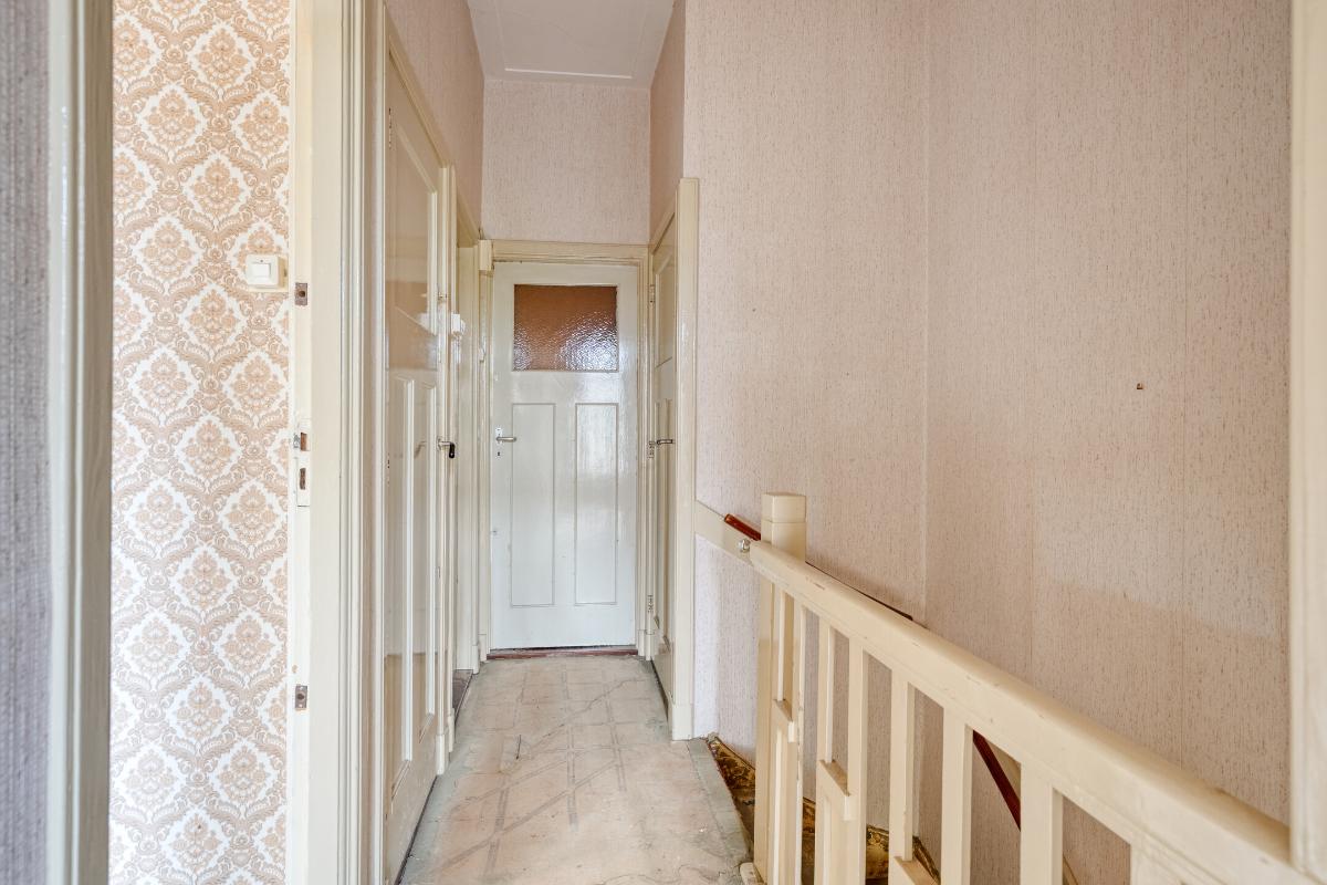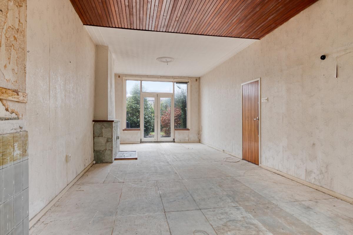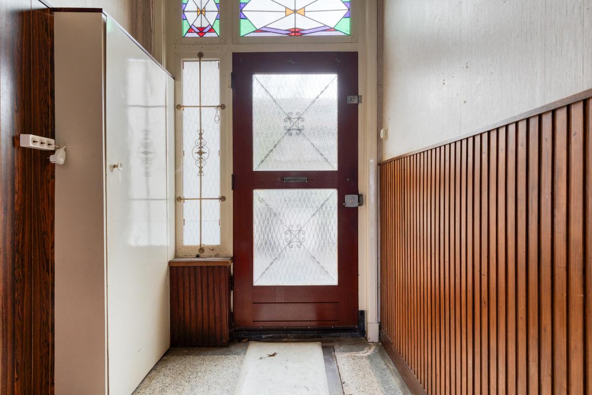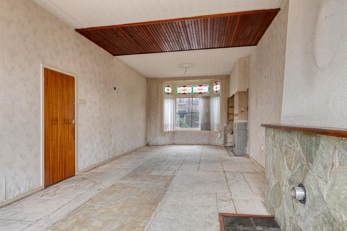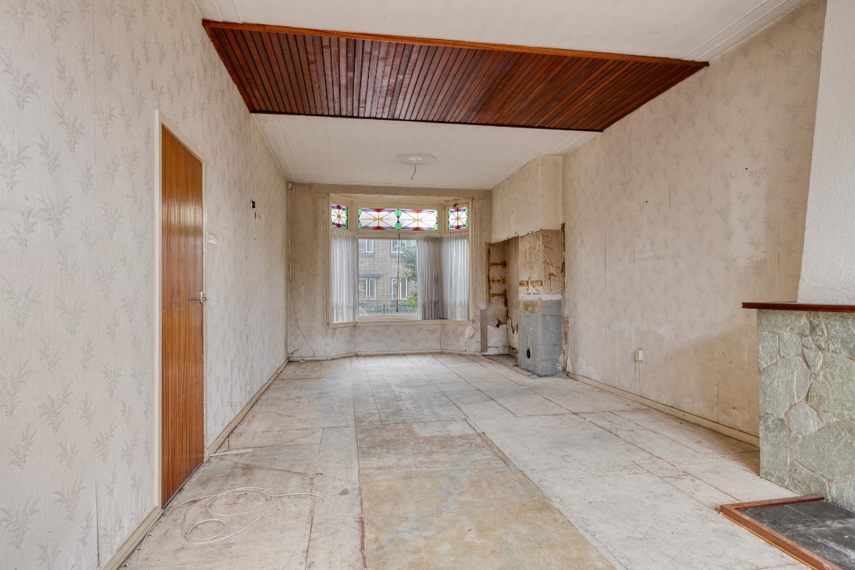 Wonen en koken Via de entree met tochtportaal betreed je de woning. In de hal vind je de meterkast, een trapkast, het toilet en de karakteristieke granito vloer. De woonkamer is licht en ruim, mede dankzij de erker aan de voorzijde en de grote raampartijen. De aanwezige glas-in-looddetails geven extra sfeer. Aan de achterzijde zorgen de openslaande deuren voor een directe verbinding met de achtertuin. De dichte keuken is eenvoudig en gedateerd, maar biedt volop mogelijkheden voor vernieuwing en een moderne indeling.