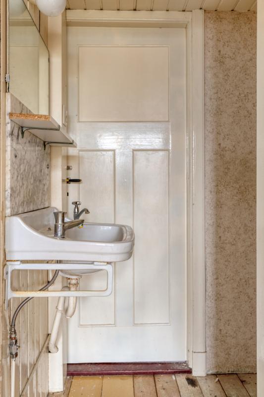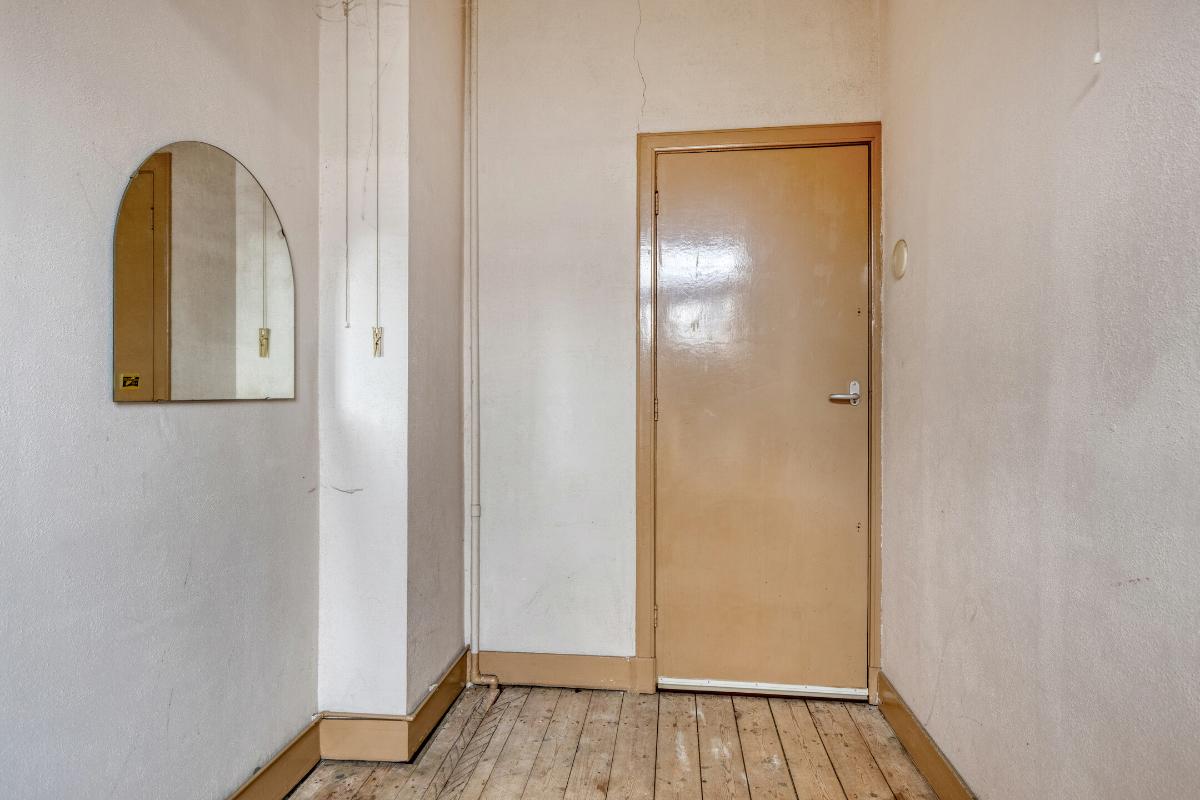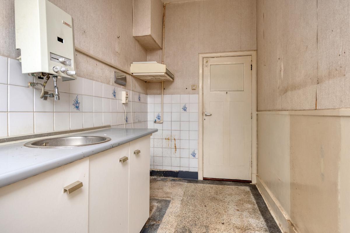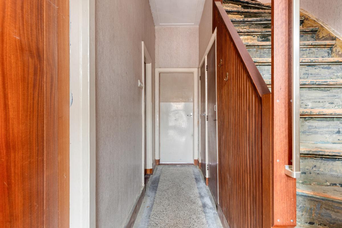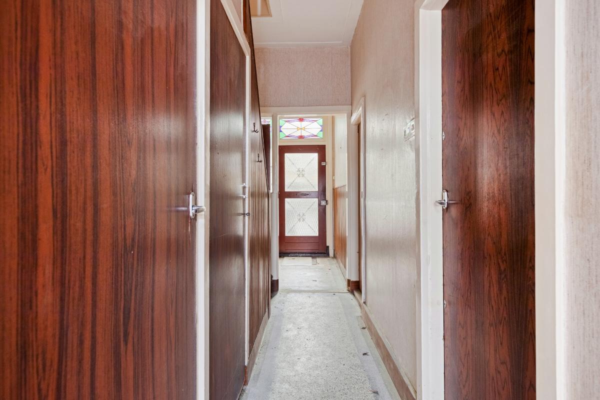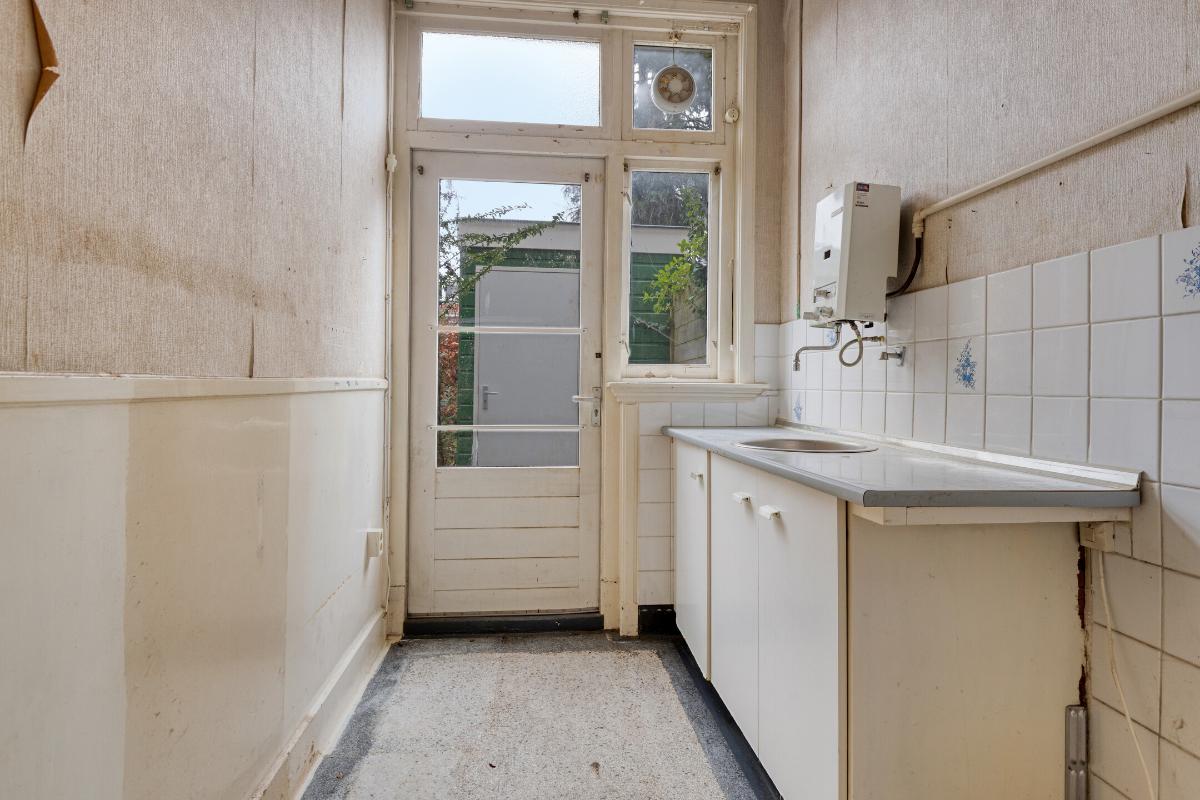 Wonen en koken Via de entree met tochtportaal betreed je de woning. In de hal vind je de meterkast, een trapkast, het toilet en de karakteristieke granito vloer. De woonkamer is licht en ruim, mede dankzij de erker aan de voorzijde en de grote raampartijen. De aanwezige glas-in-looddetails geven extra sfeer. Aan de achterzijde zorgen de openslaande deuren voor een directe verbinding met de achtertuin. De dichte keuken is eenvoudig en gedateerd, maar biedt volop mogelijkheden voor vernieuwing en een moderne indeling.