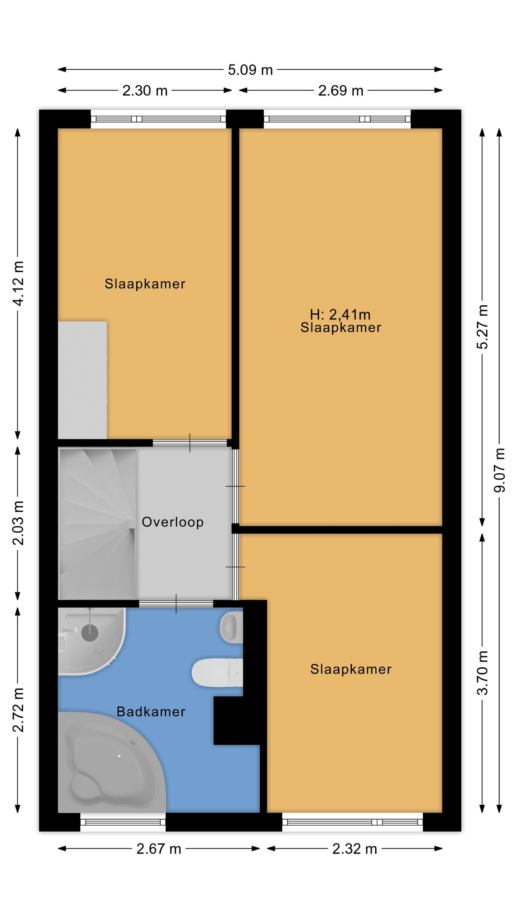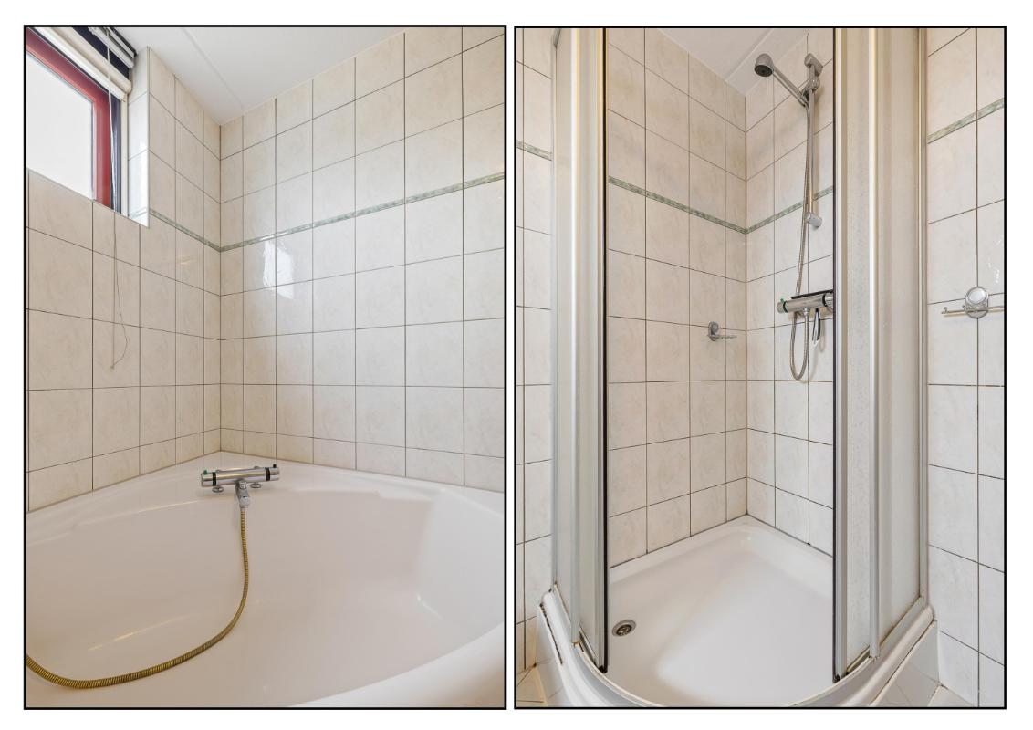 Eerste verdieping: Overloop, 3 ruime slaapkamers geheel voorzien van laminaatvloer. De volledig betegelde badkamer beschikt over zwevend toilet, kunststof ligbad in hoekopstelling, douchecabine, wastafel, radiator en raampartij.