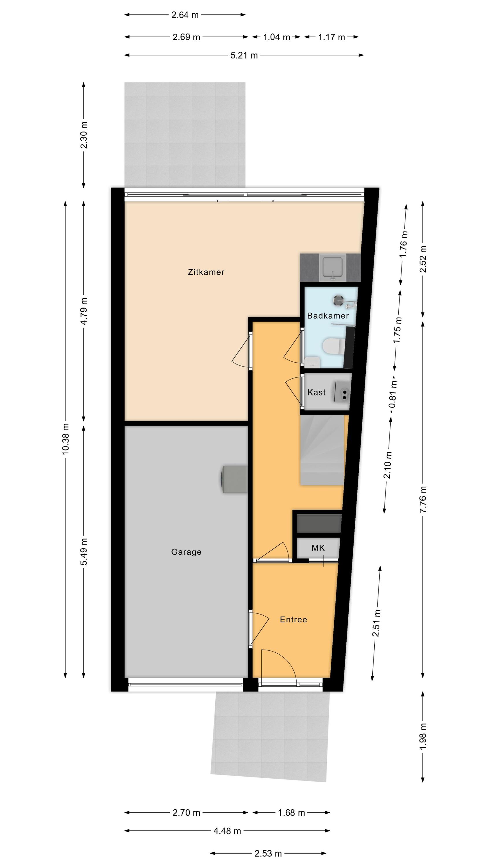 Begane grond: Entree met hal, meterkast en een bergkast met de cv-installatie (Vaillant, 2020). Aansluitend vind je de tuinkamer met een keukenblok. De grote aluminium schuifpui met HR++-glas over de volledige breedte geeft prachtig zicht op de sfeervolle, onderhoudsvriendelijke achtertuin. De tuinkamer leent zich uitstekend als hobby- of werkkamer, maar is ook zeer geschikt als praktijkruimte. Verder bevindt zich hier de 1e badkamer met douche, wastafel en toilet. De inpandige garage beschikt over aansluitingen voor wasapparatuur.
