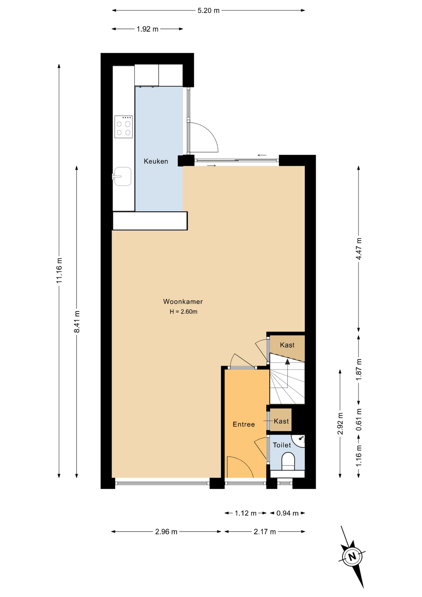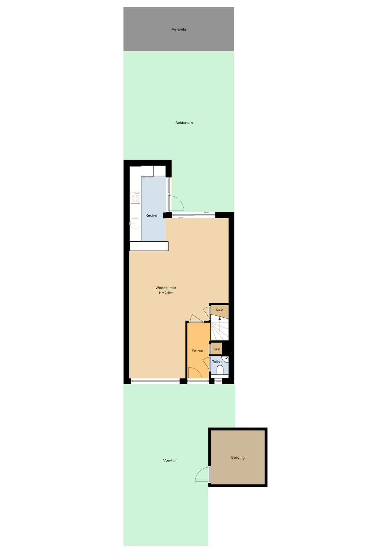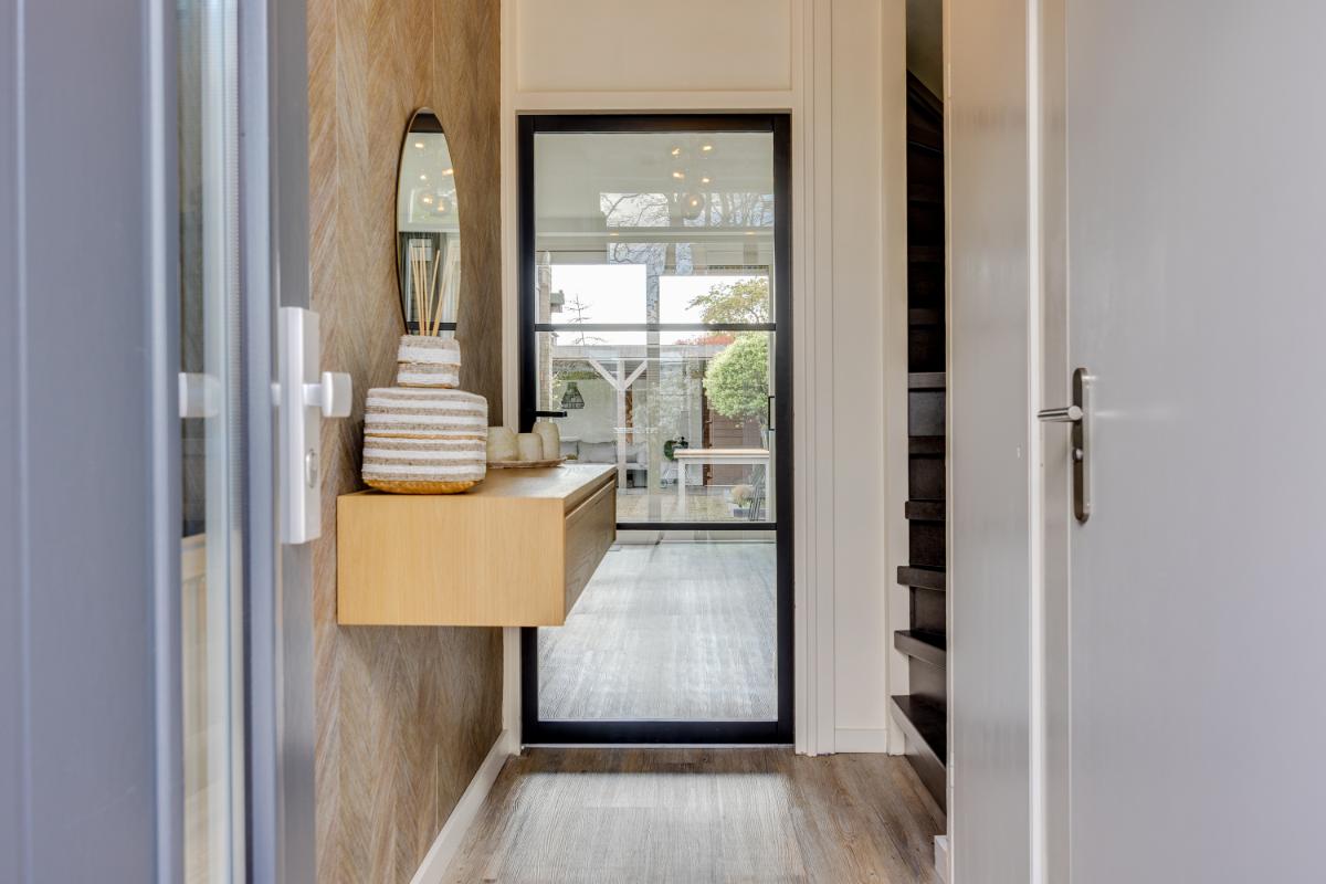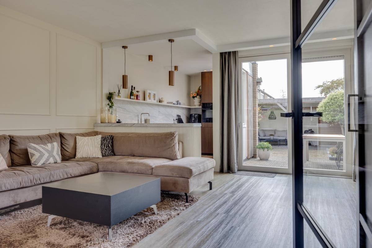 Indeling: Bij binnenkomst kom je in de hal met toegang tot de toiletruimte en de woonkamer. De lichte woonkamer is strak afgewerkt en voelt direct ruim en comfortabel aan. Dankzij de grote raampartijen en de open indeling is dit een heerlijke plek om thuis te komen. Aan de achterzijde van de woonkamer bevindt zich een grote schuifpui die zorgt voor een verbinding tussen binnen en buiten.