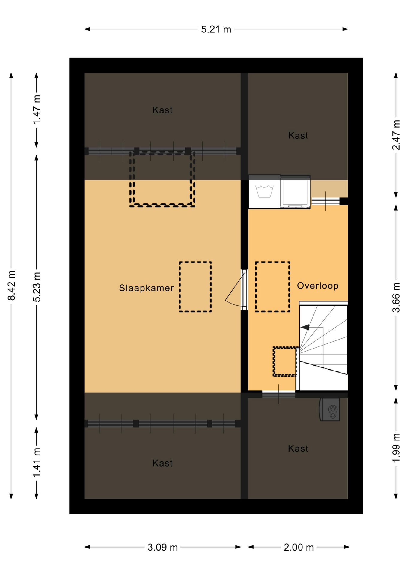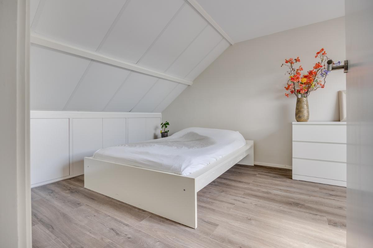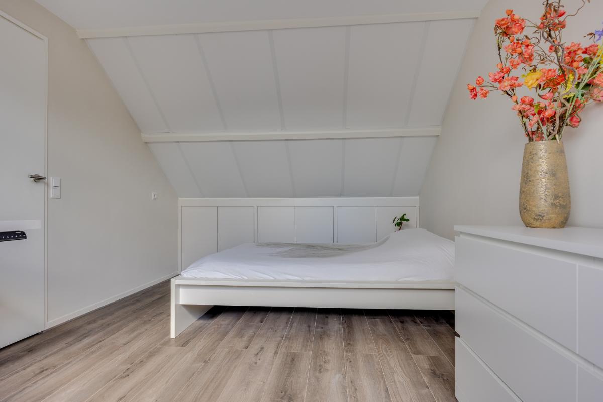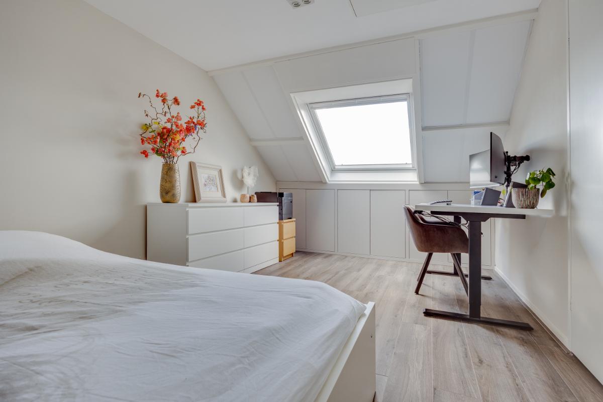 De zolderverdieping is een ware verrassing! Op de overloop bevindt zich de ingebouwde wasmachine- en drogeropstelling en zijn praktische schuifkasten gemaakt. Naast de overloop is er een grote slaapkamer welke ook gemakkelijk gebruikt kan worden als kantoor of hobbykamer.