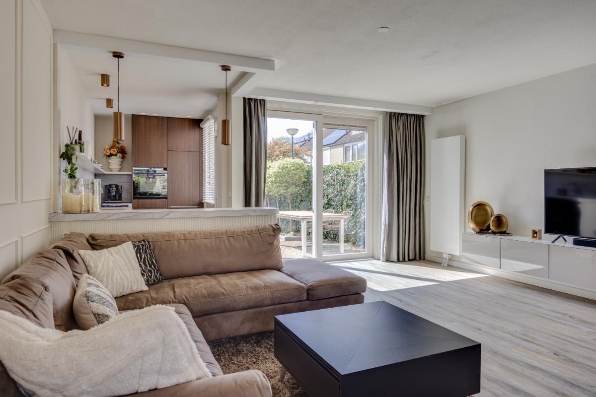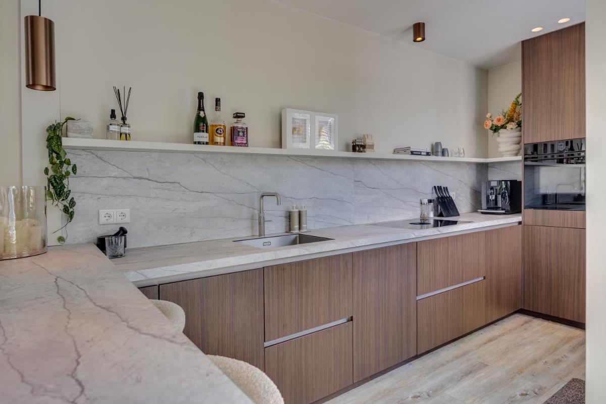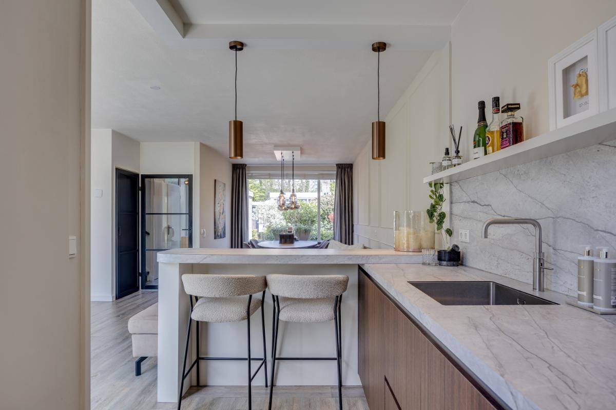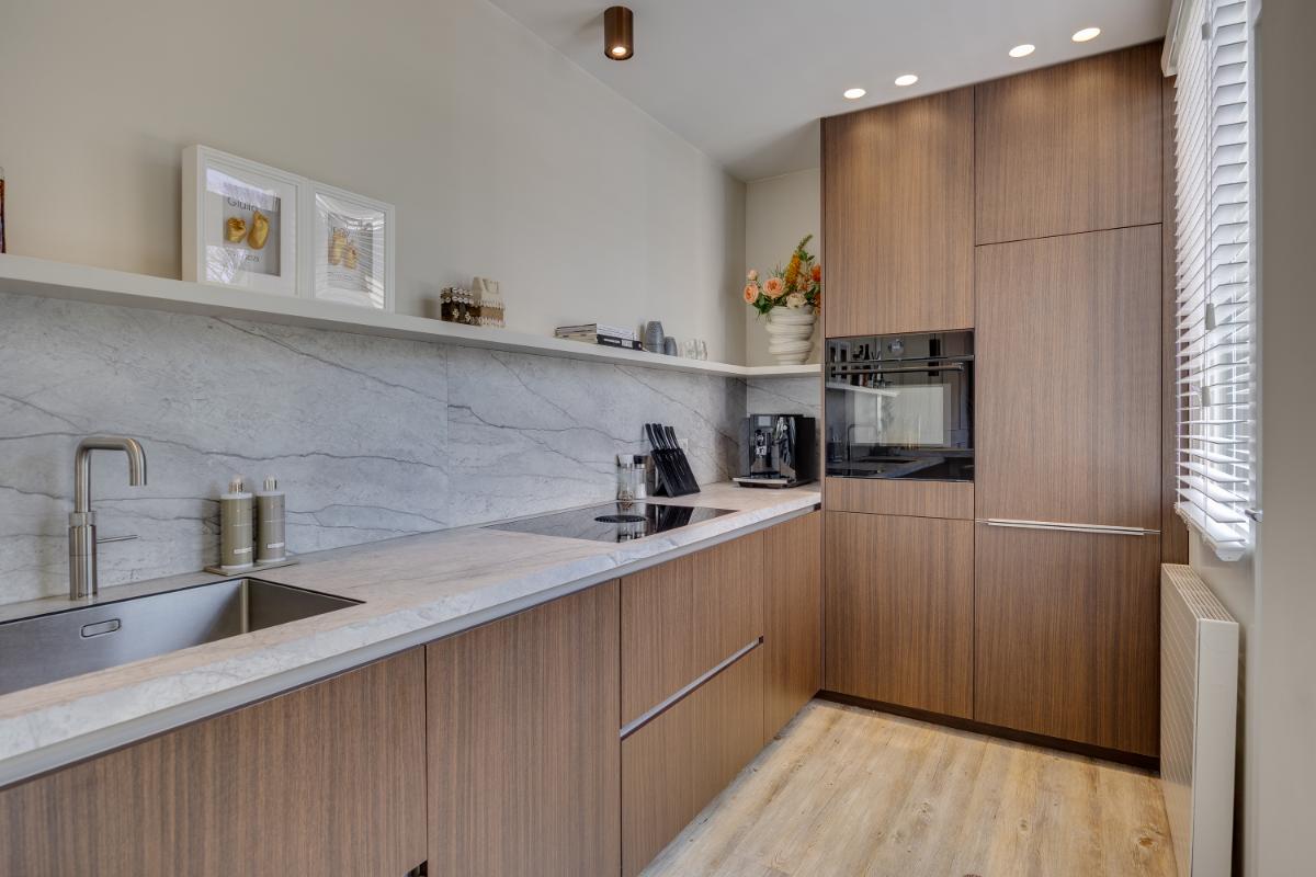 De moderne keuken ligt eveneens aan de achterzijde en is in 2023 volledig vernieuwd. De keuken is van alle gemakken voorzien en beschikt over diverse inbouwapparatuur zoals een vaatwasmachine, inductieplaat, afzuigkap, oven en koel-vriescombinatie. Via de keuken wandel je gemakkelijk de op he zuidwest gelegen achtertuin in.