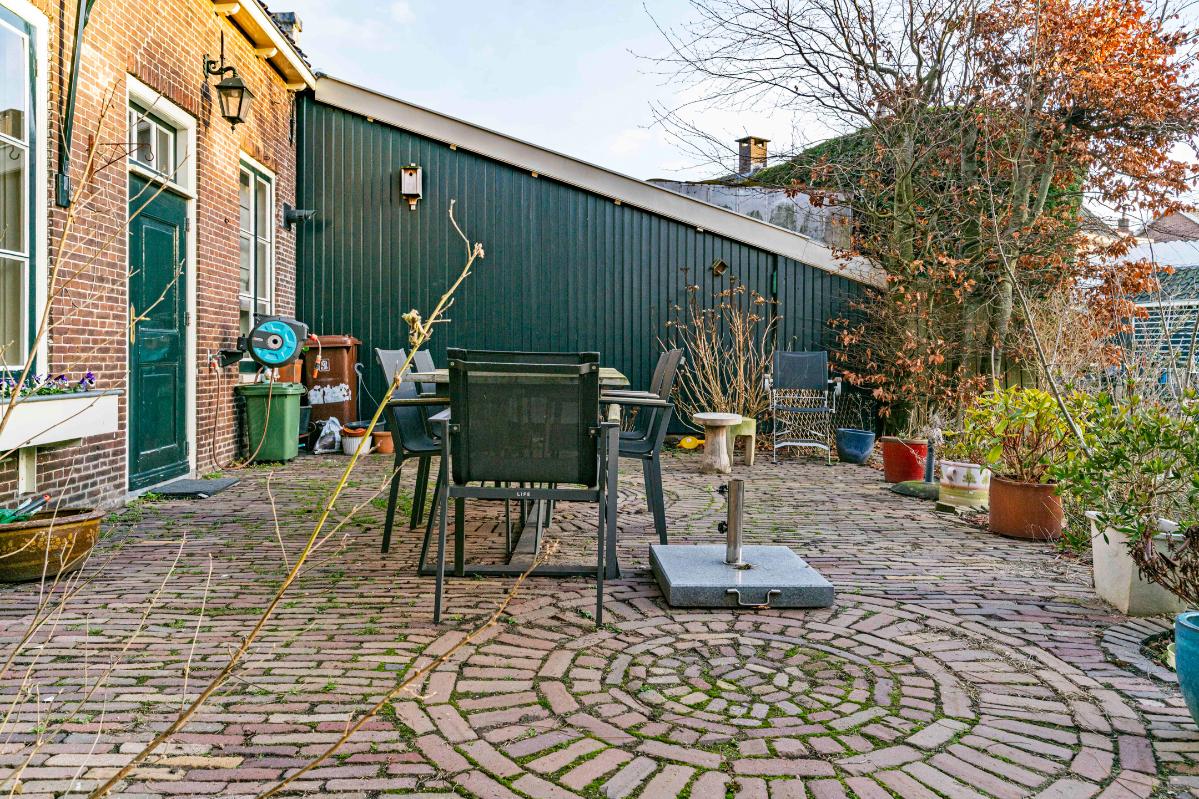 De zonnige achtertuin op het zuidwesten is een absolute eyecatcher en ligt direct aan het water ‘Korte Linschoten’. Hier geniet je de hele middag en avond van de zon én van een schitterend, bijna schilderachtig uitzicht op de historische panden langs het water. Het kabbelende water, de langsvarende bootjes en de rustgevende omgeving geven je elke dag een vakantiegevoel in eigen tuin. Daarnaast is er een houten berging aanwezig voor het opbergen van tuingereedschap of tuinmeubilair. Een unieke buitenruimte die perfect past bij het monumentale karakter van de woning.