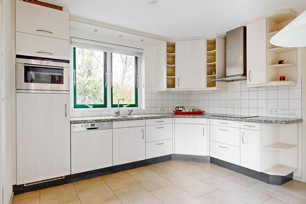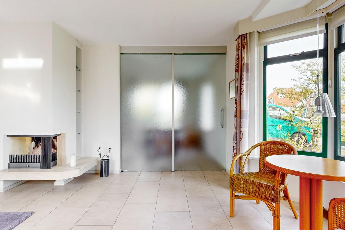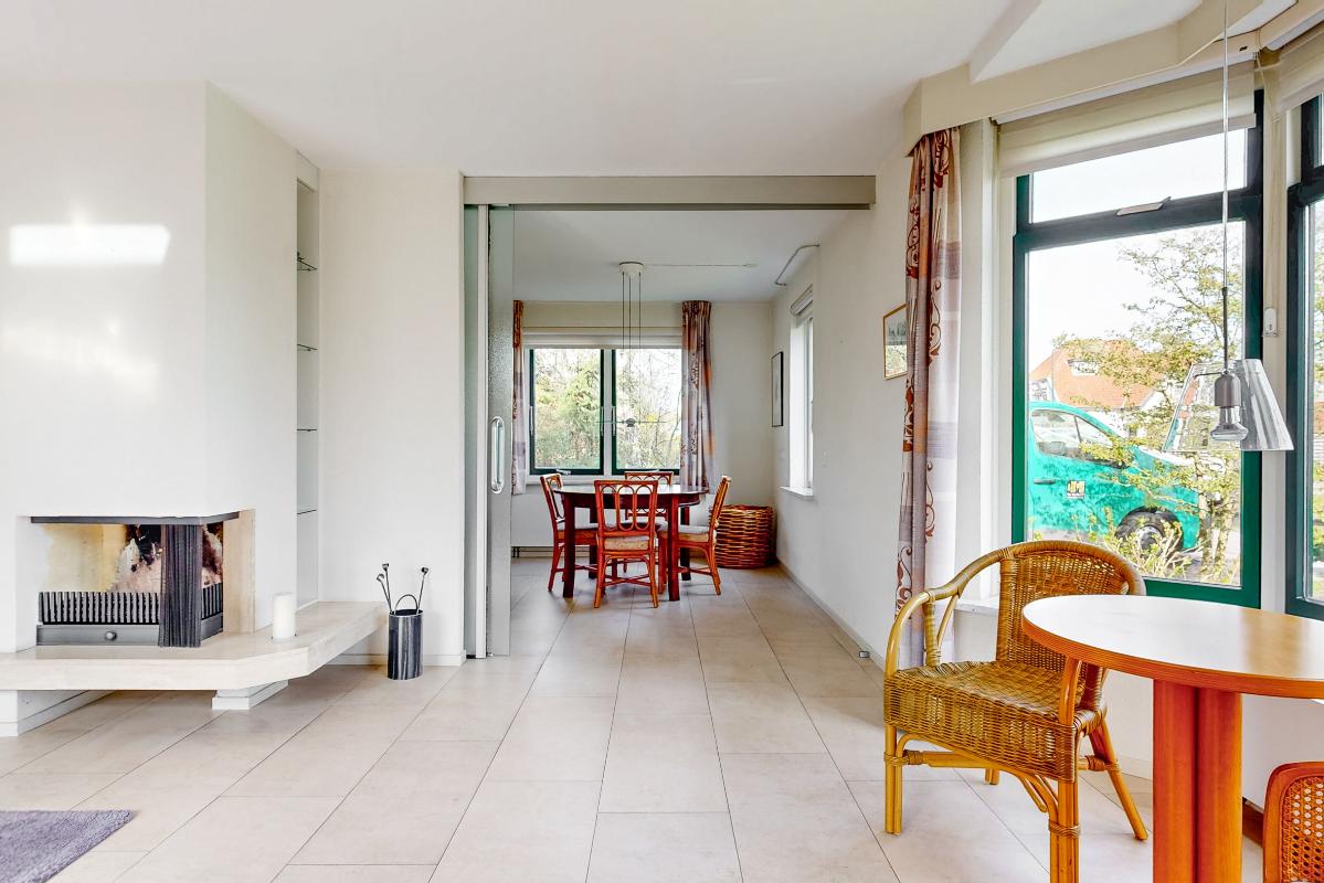 Je stapt binnen in de hal met de meterkast, het toilet en de trapopgang. Vanuit hier heb je toegang tot de royale woonkamer, keuken en eetkamer. De woonkamer is heerlijk licht en ruim met een sfeervolle open haard en een erker aan de voorzijde. Via schuifdeuren bereik je de eetkamer: ideaal om deze bij de woonkamer te betrekken of juist apart te gebruiken. De keuken is compleet uitgerust met een 4-pits inductiekookplaat met afzuigkap, koelkast, combi-oven en vaatwasser. Aansluitend vind je de praktische bijkeuken met de witgoedaansluitingen.