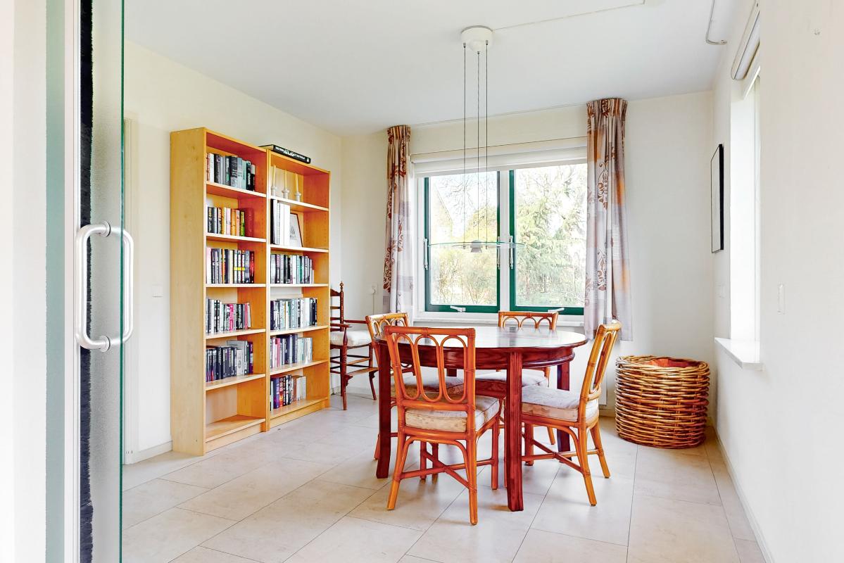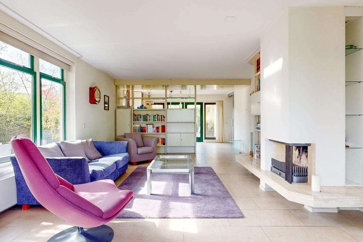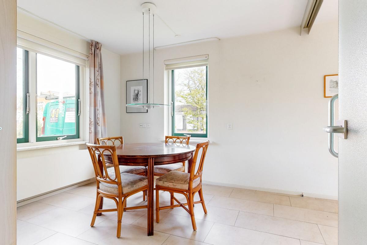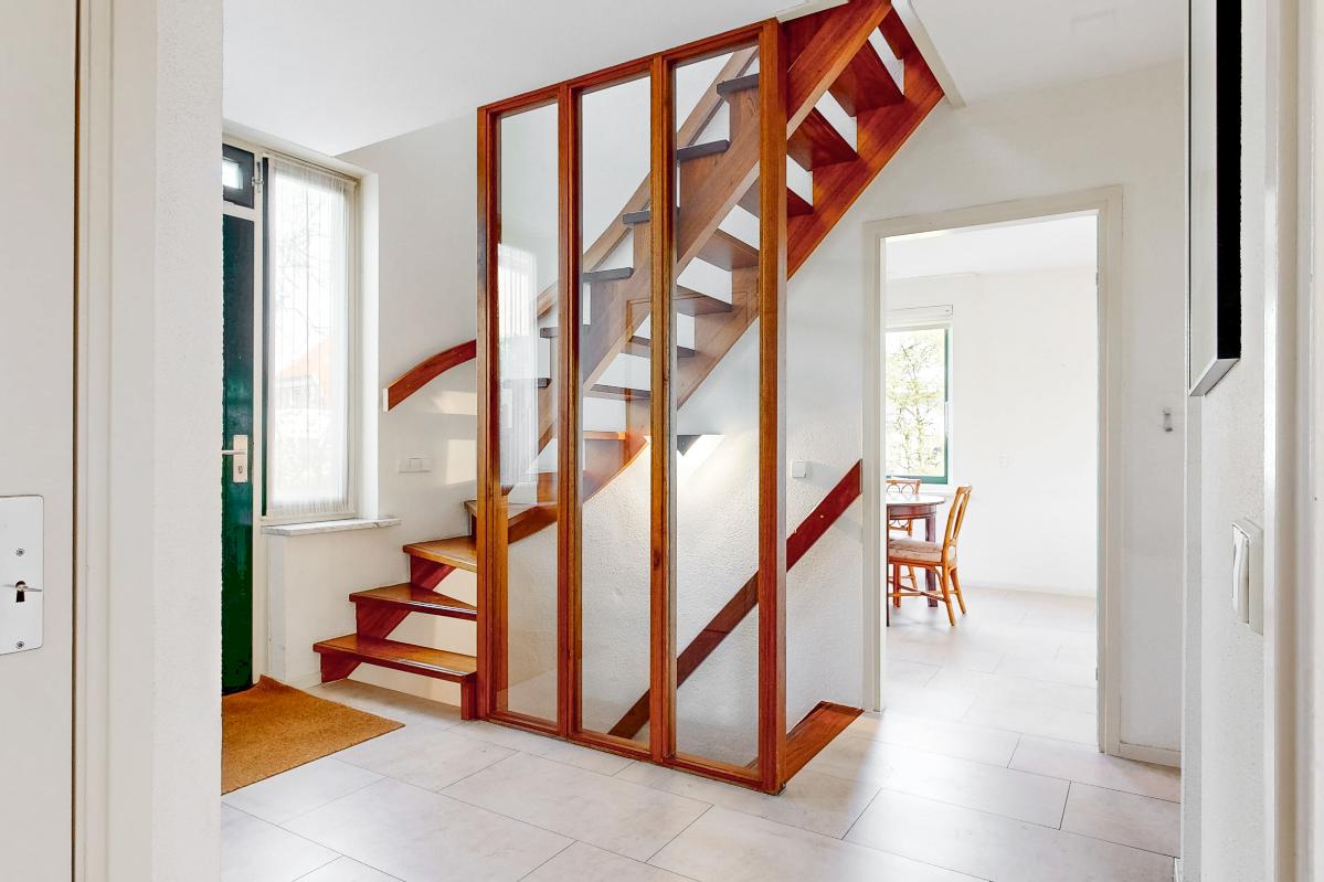 Je stapt binnen in de hal met de meterkast, het toilet en de trapopgang. Vanuit hier heb je toegang tot de royale woonkamer, keuken en eetkamer. De woonkamer is heerlijk licht en ruim met een sfeervolle open haard en een erker aan de voorzijde. Via schuifdeuren bereik je de eetkamer: ideaal om deze bij de woonkamer te betrekken of juist apart te gebruiken. De keuken is compleet uitgerust met een 4-pits inductiekookplaat met afzuigkap, koelkast, combi-oven en vaatwasser. Aansluitend vind je de praktische bijkeuken met de witgoedaansluitingen.