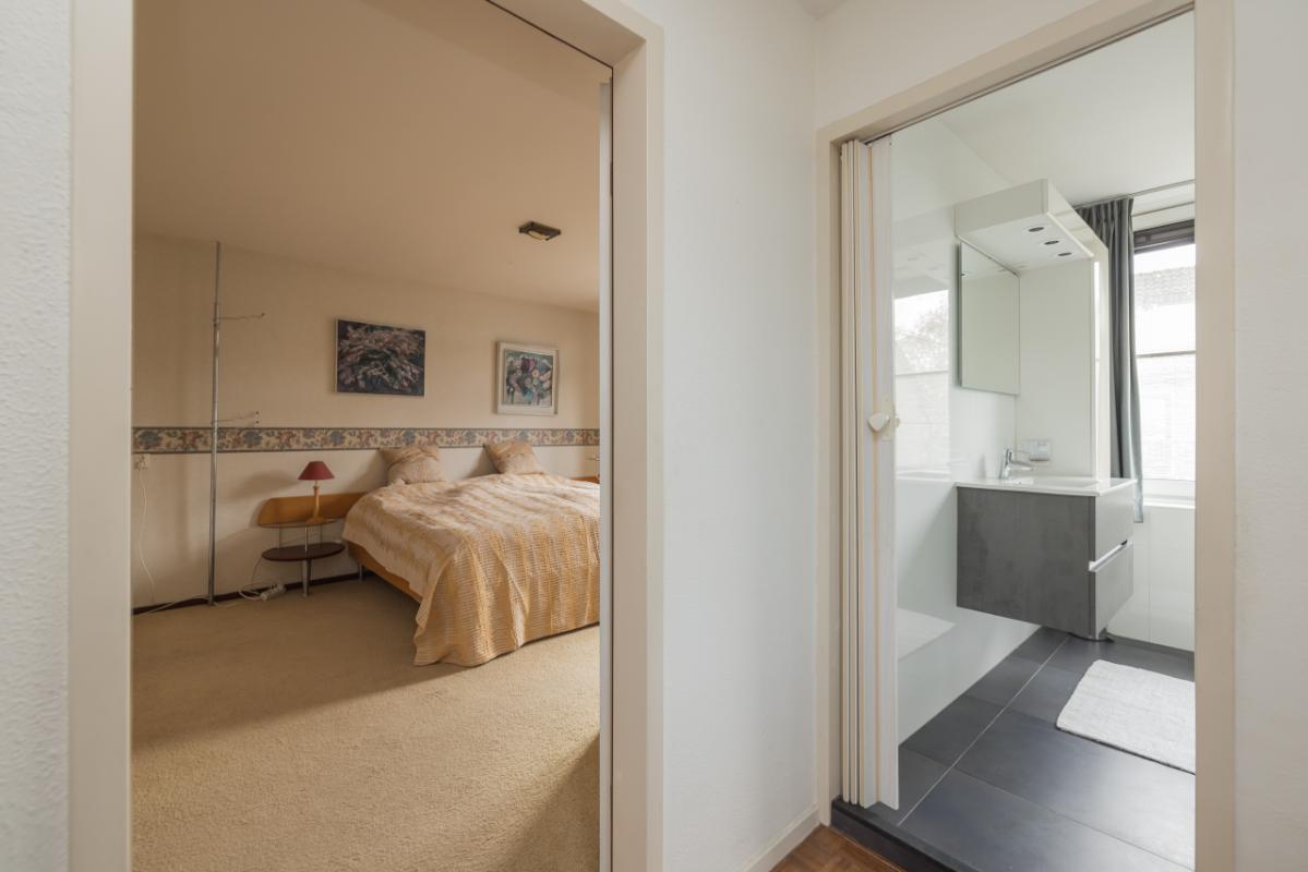 First floor: Spacious landing with a separate toilet. This floor has two bedrooms at the front. The generous (master) bedroom is located at the rear and features a built-in wardrobe and access to the sunny southwest-facing balcony. The modern bathroom (gray and white) features a large walk-in shower, vanity, designer radiator, and washing machine connection.