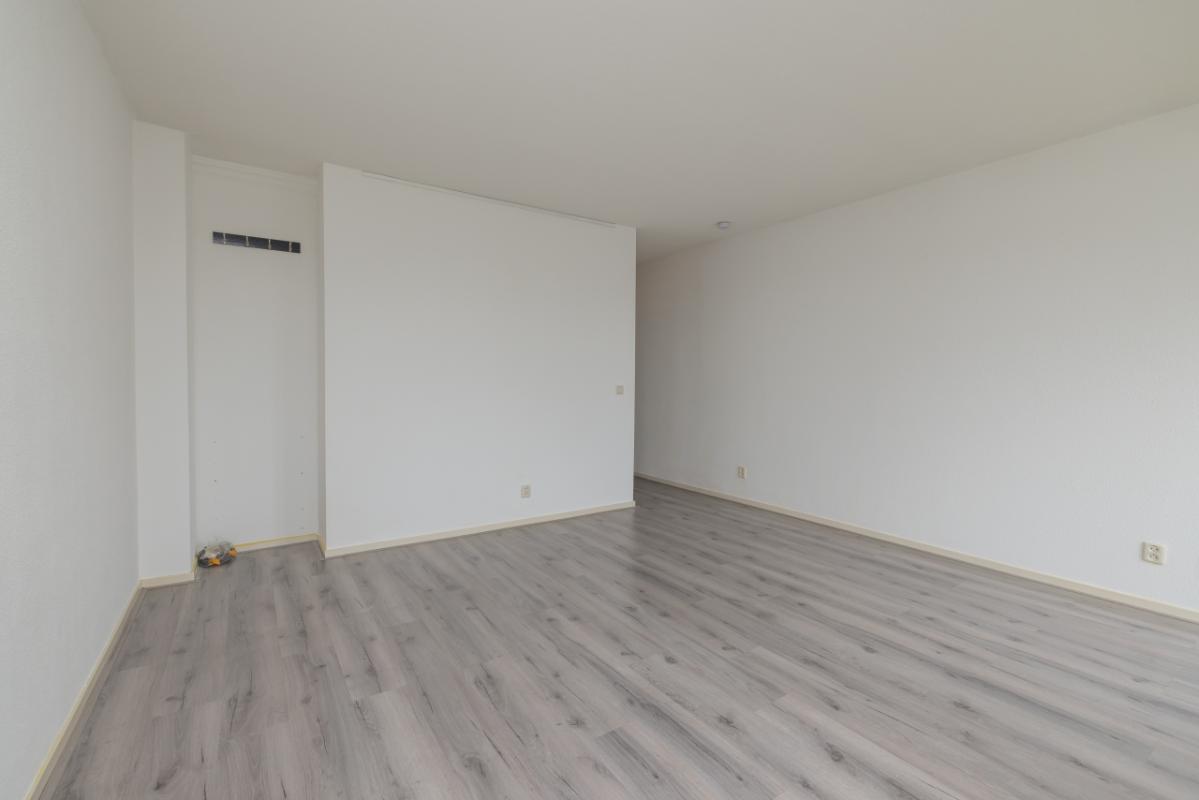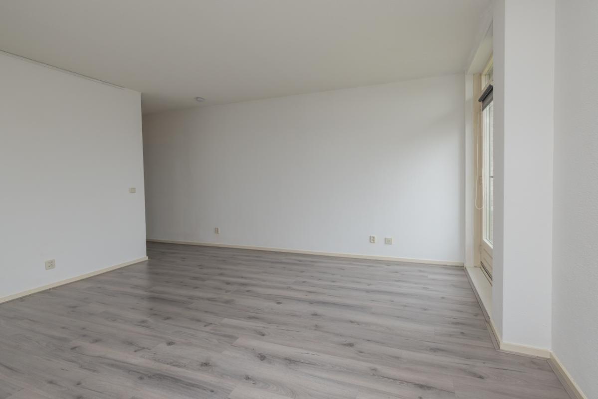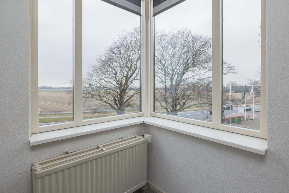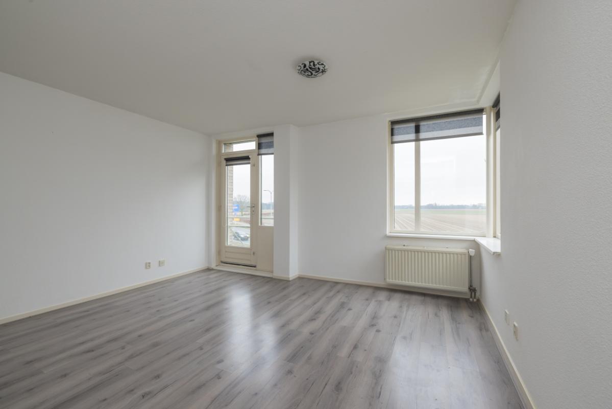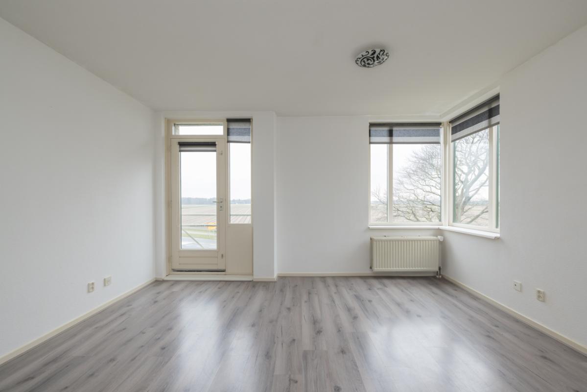 The living room is wonderfully bright, approximately 20 m² in size, and offers unobstructed views over the bulb fields. Thanks to the playful corner window and the door to the French balcony, there is plenty of natural light. The floor is finished with greywash laminate.