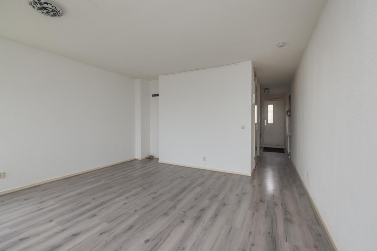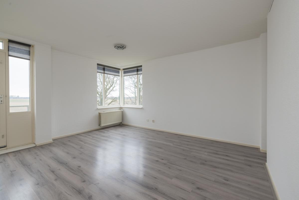 De woonkamer is heerlijk licht en ca. 20 m² groot, met vrij uitzicht over de bollenvelden. Dankzij het speelse hoekraam en de deur met het Franse balkon is er veel lichtinval. De vloer is afgewerkt met een greywash laminaatvloer.