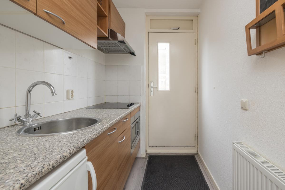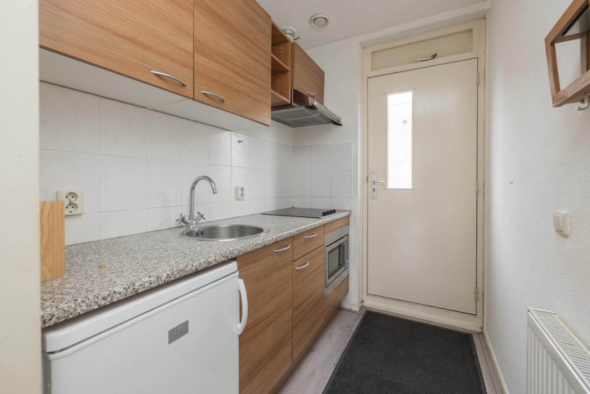 Indeling appartement 2e etage Entree met rechte keukenopstelling voorzien van houtkleurige kasten en een gemêleerd keukenblad. De keuken is uitgerust met een elektrische kookplaat, afzuigkap, combi-magnetron en een losstaande koelkast.