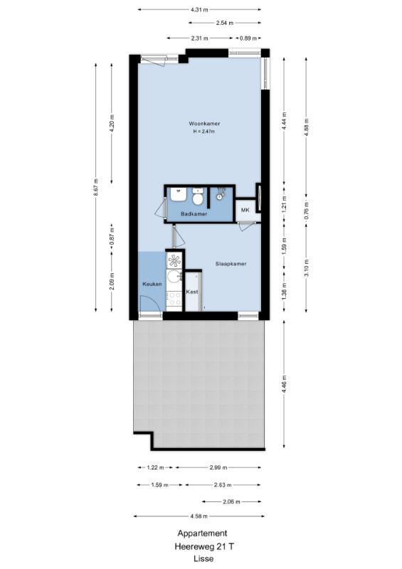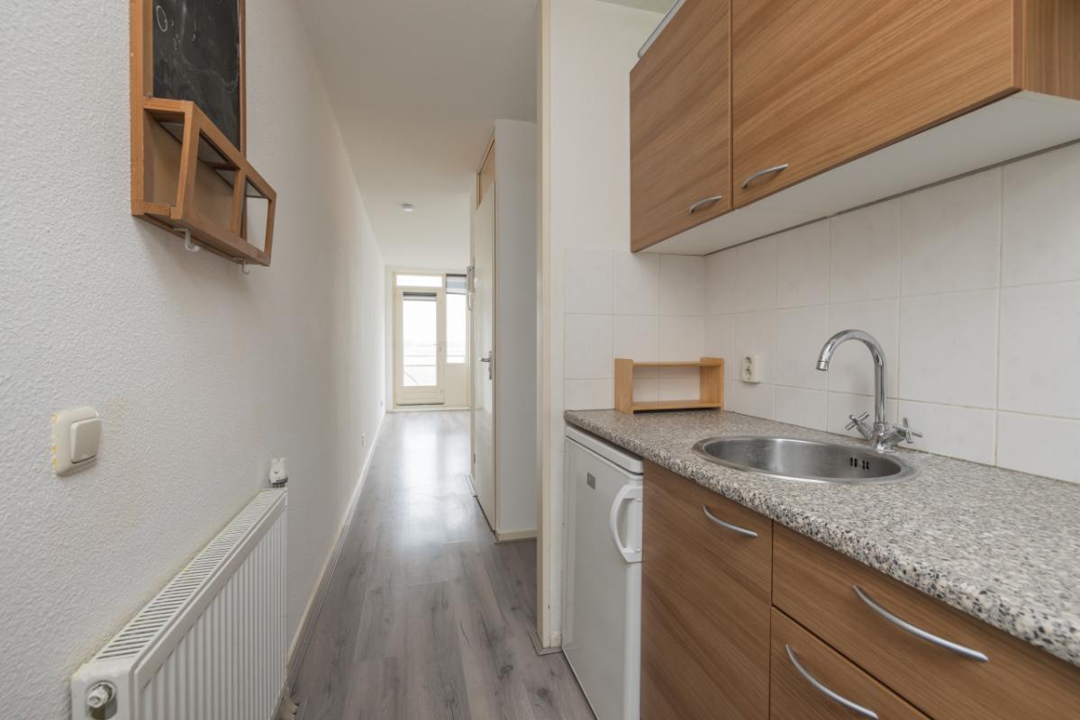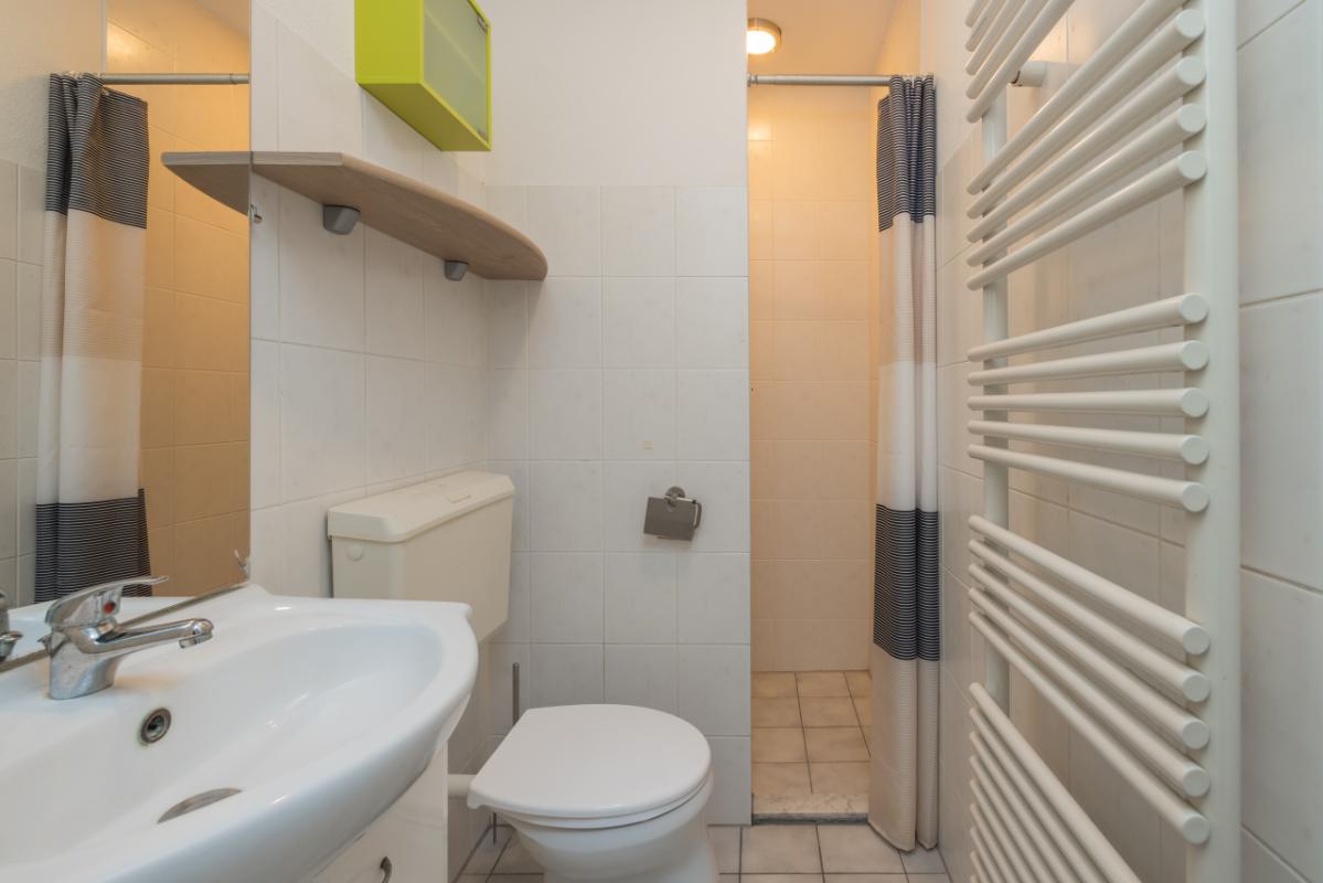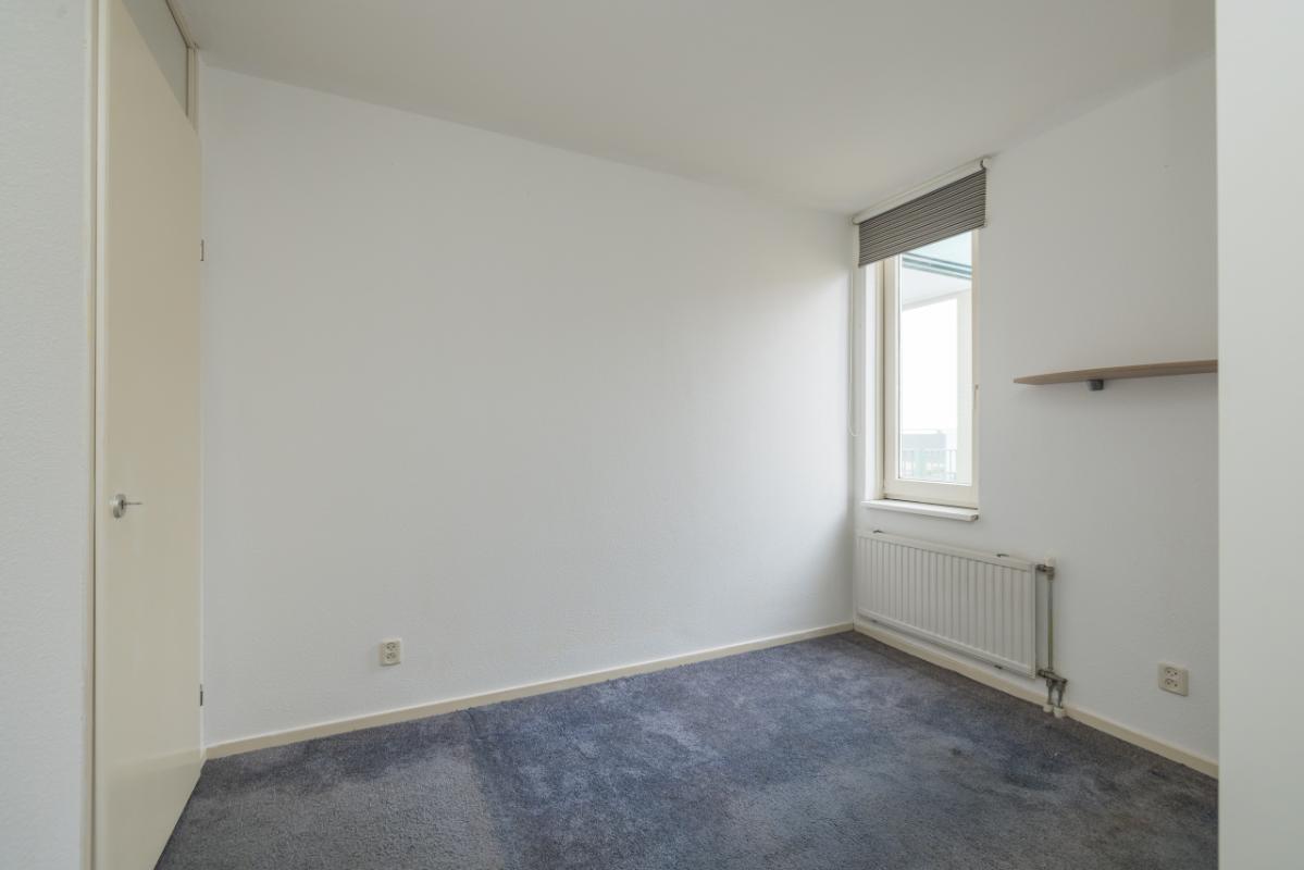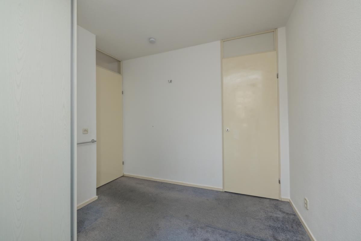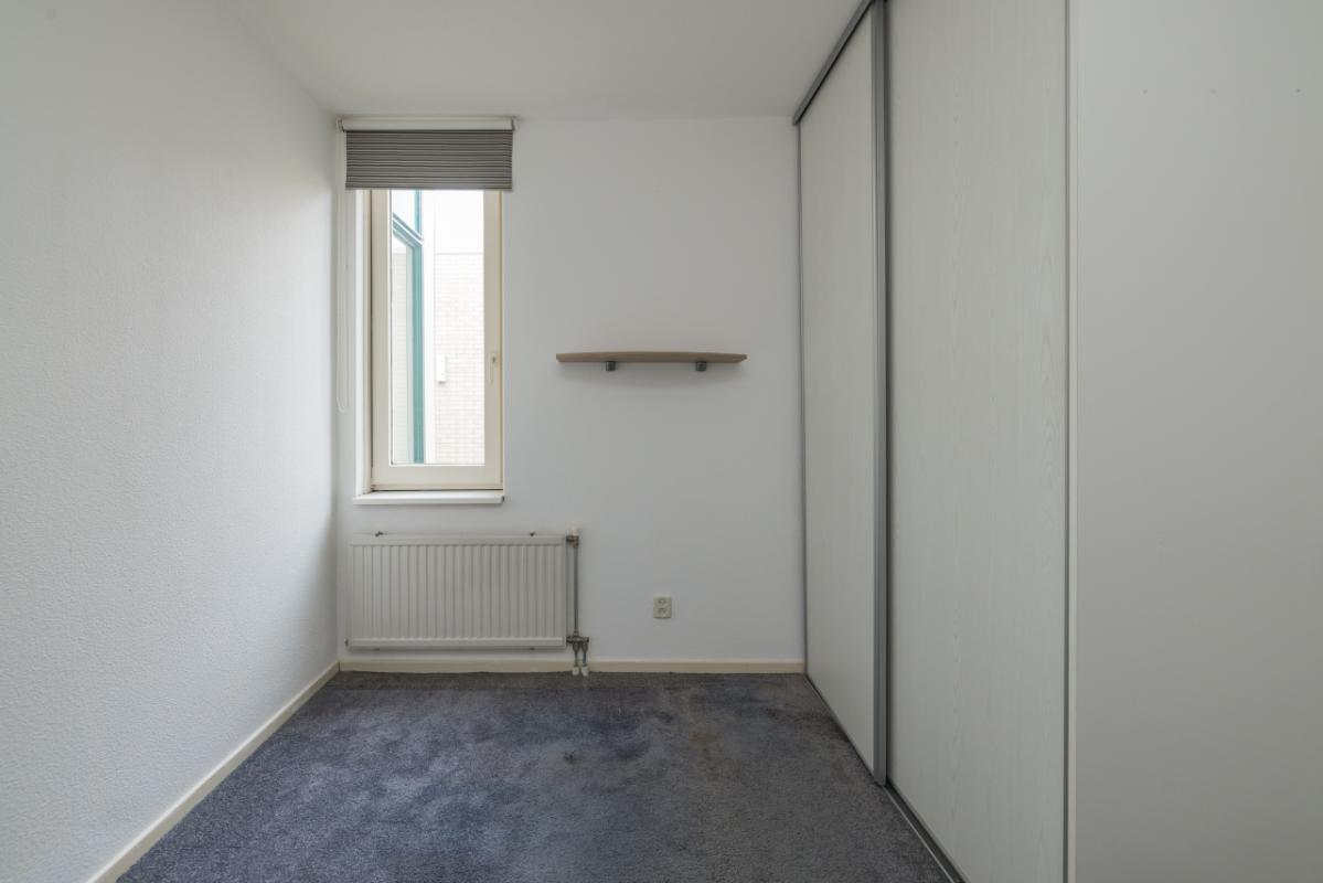 Aan de voorzijde van het appartement bevindt zich de slaapkamer, voorzien van een schuifdeurkast en de meterkast. De tussengelegen badkamer is uitgevoerd in een lichte kleurstelling en beschikt over een toilet, wastafelmeubel en een inloopdouche.