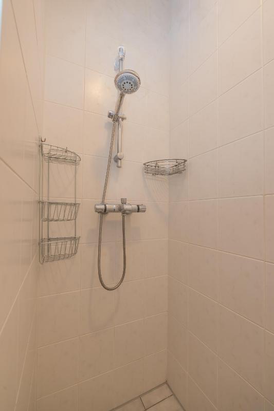 At the front of the apartment is the bedroom, fitted with a sliding-door wardrobe and the meter cupboard. The centrally located bathroom is finished in light colours and features a toilet, washbasin cabinet and a walk-in shower.