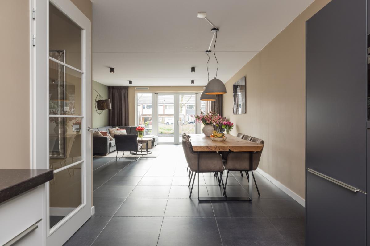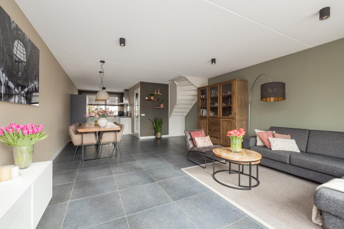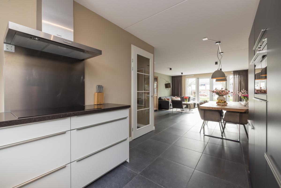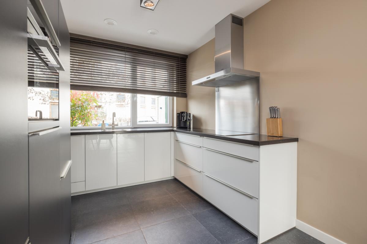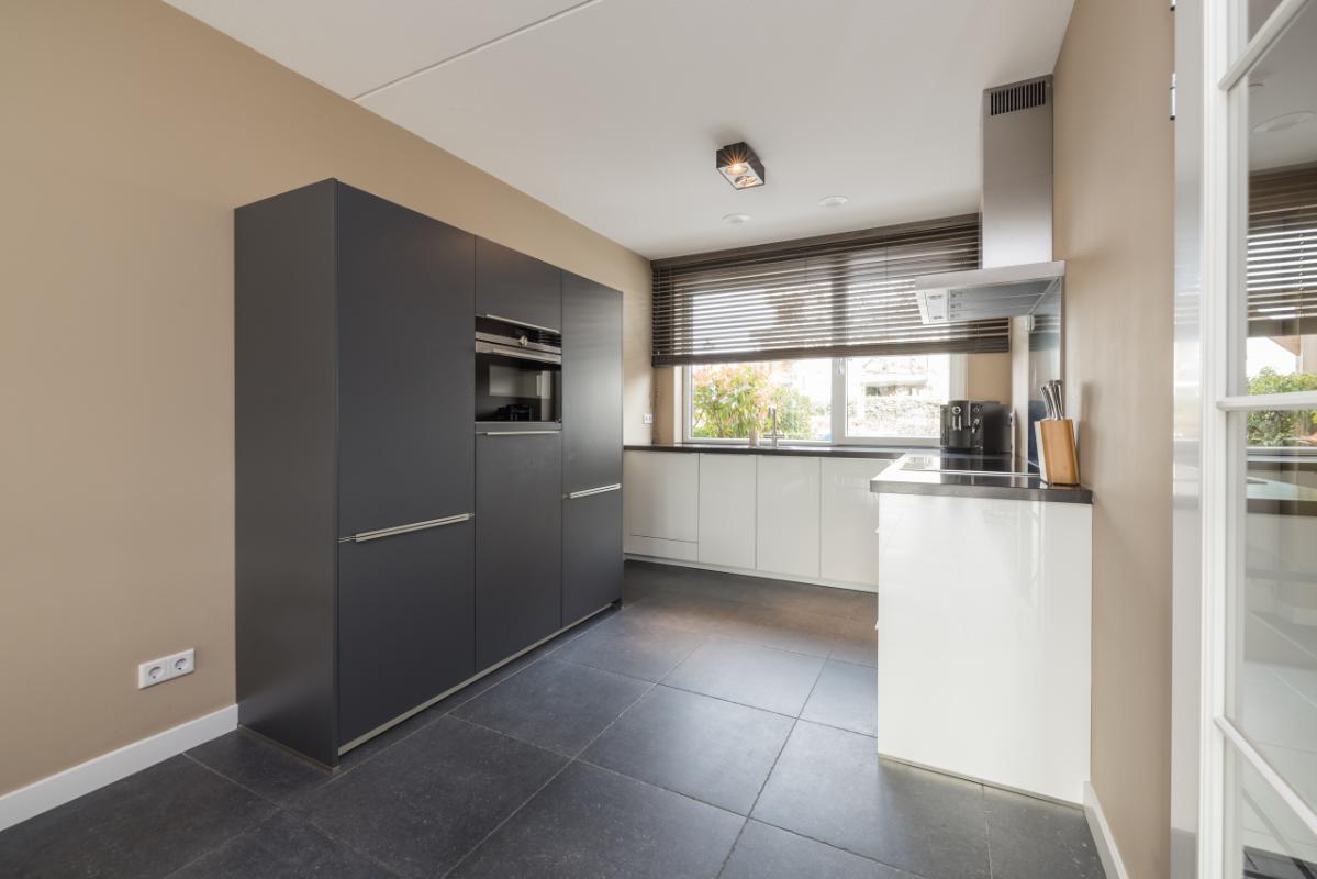 De ruime en lichte woonkamer (totale lengte 11,36 m.) is voorzien van een antraciet plavuizenvloer met comfortabele vloerverwarming. Dankzij de grote raampartij en openslaande deuren naar de tuin geniet je hier van veel licht en een directe verbinding met buiten. Aan de voorzijde bevindt zich de moderne keuken met een stijlvolle combinatie van lichte kasten/lades en antraciet hoge kasten, afgewerkt met een hardstenen werkblad en RVS-details. De keuken is compleet uitgerust met een kokend waterkraan, combi-oven, inductiekookplaat, afzuigkap, vaatwasser en koel-/vriescombinatie.