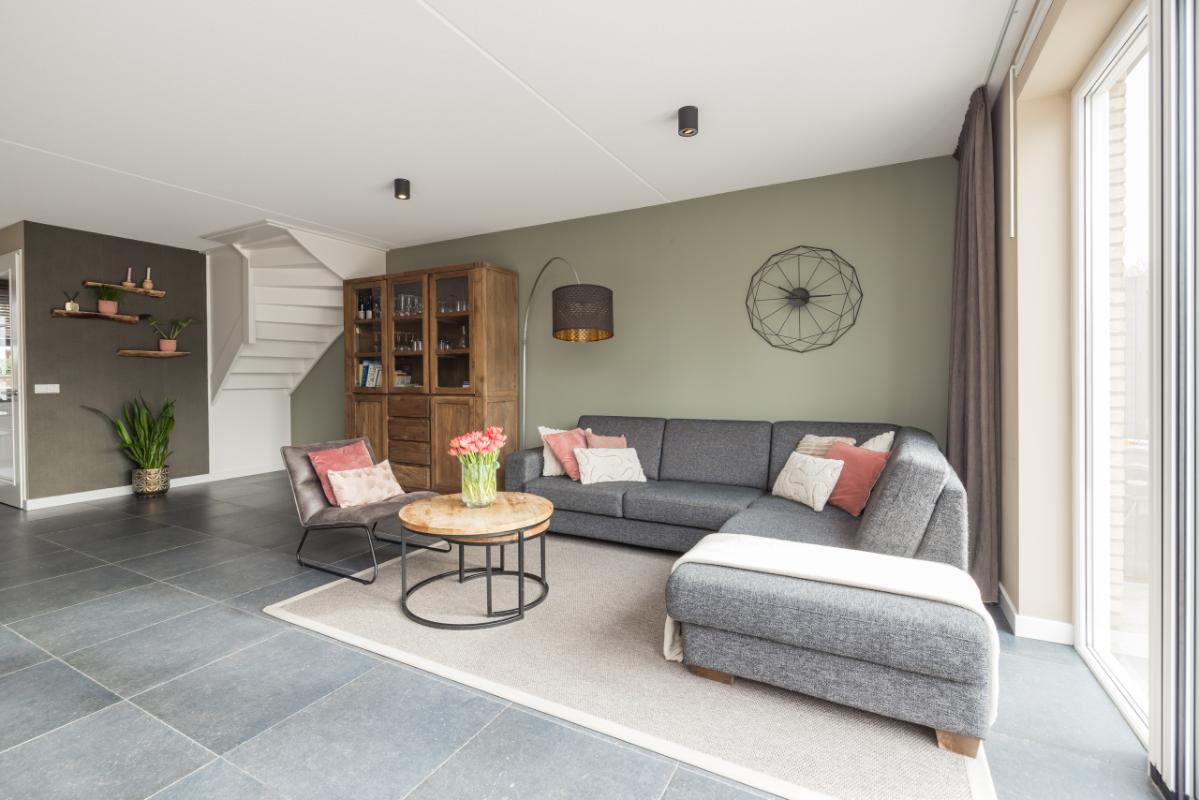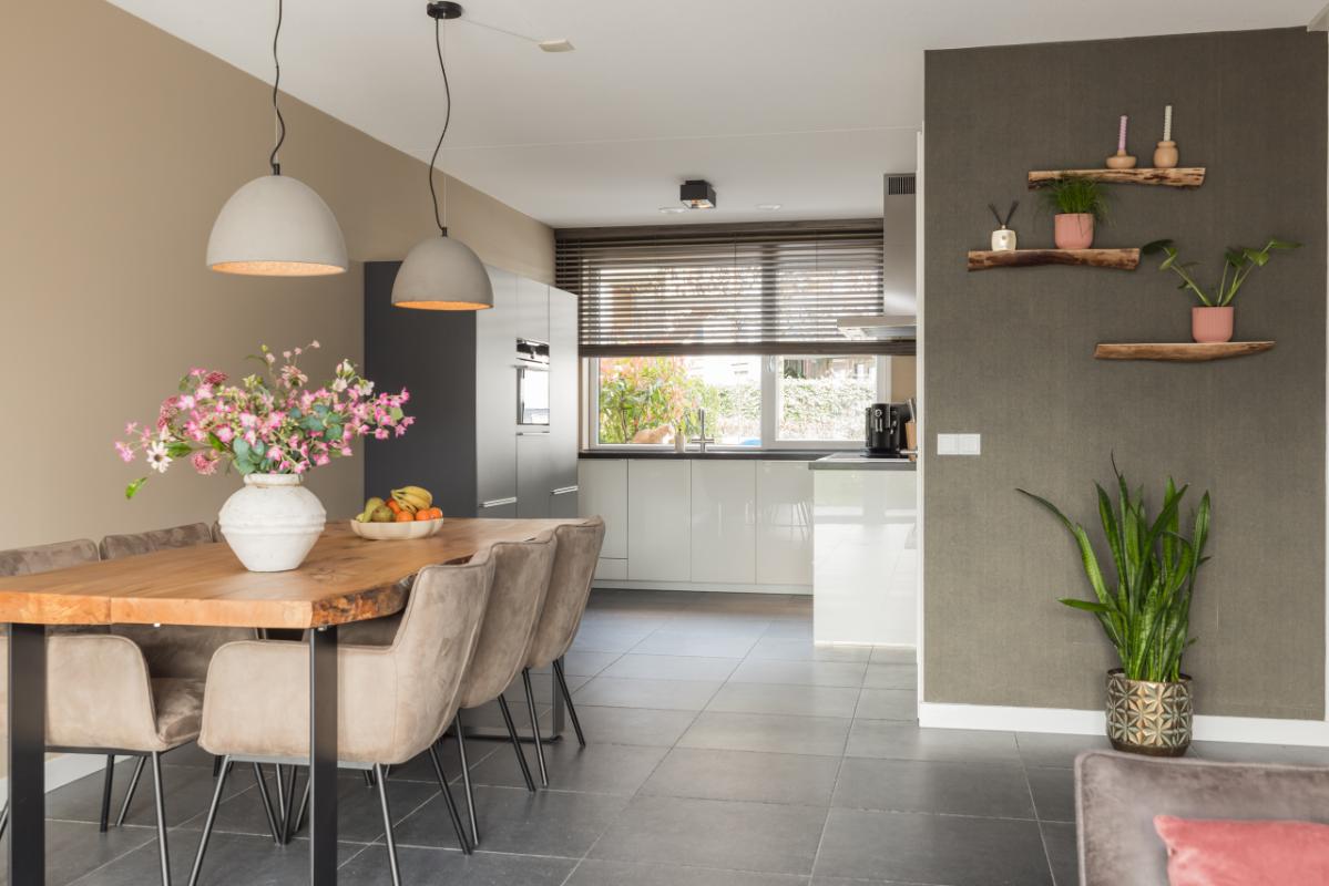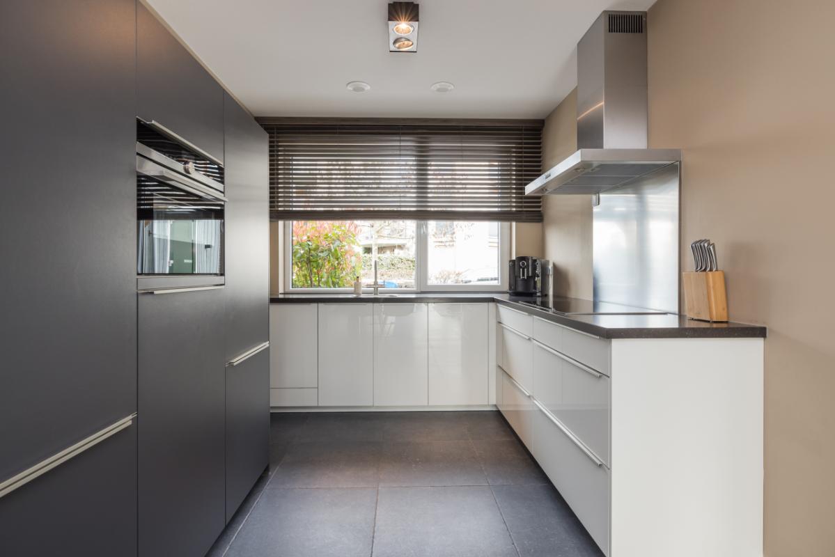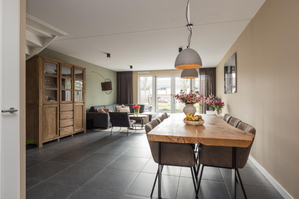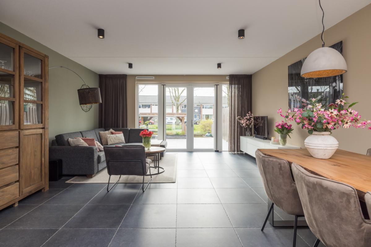 De ruime en lichte woonkamer (totale lengte 11,36 m.) is voorzien van een antraciet plavuizenvloer met comfortabele vloerverwarming. Dankzij de grote raampartij en openslaande deuren naar de tuin geniet je hier van veel licht en een directe verbinding met buiten. Aan de voorzijde bevindt zich de moderne keuken met een stijlvolle combinatie van lichte kasten/lades en antraciet hoge kasten, afgewerkt met een hardstenen werkblad en RVS-details. De keuken is compleet uitgerust met een kokend waterkraan, combi-oven, inductiekookplaat, afzuigkap, vaatwasser en koel-/vriescombinatie.