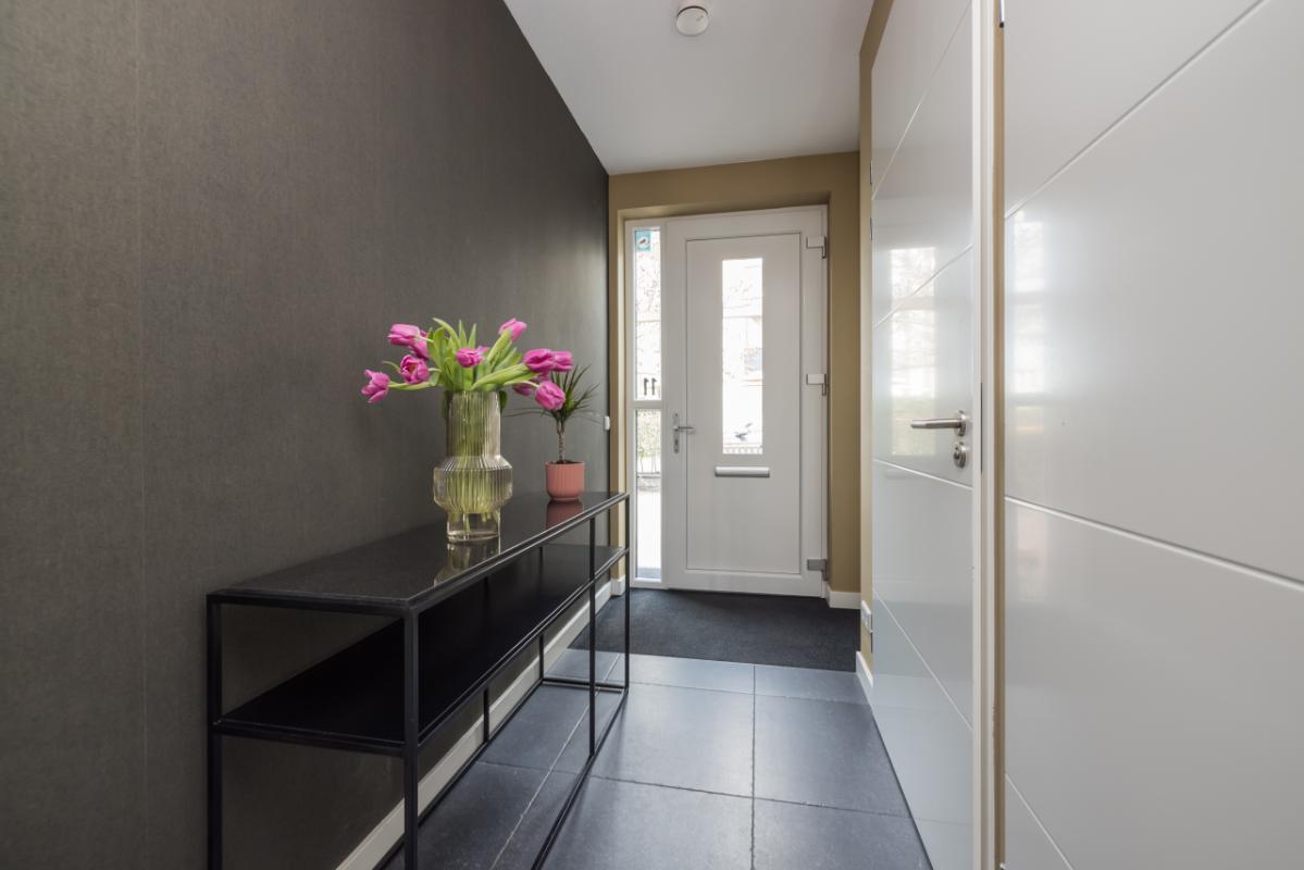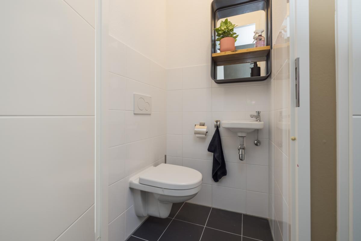 Indeling begane grond Entree met hal, meterkast (8 groepen + kookgroep), praktische provisiekast en moderne toiletruimte in wit/antraciet met zwevend toilet en fonteintje.