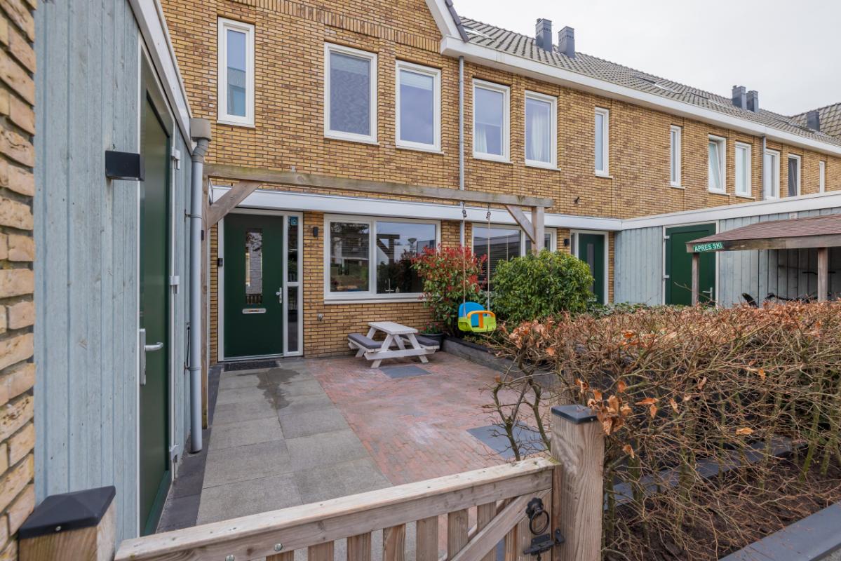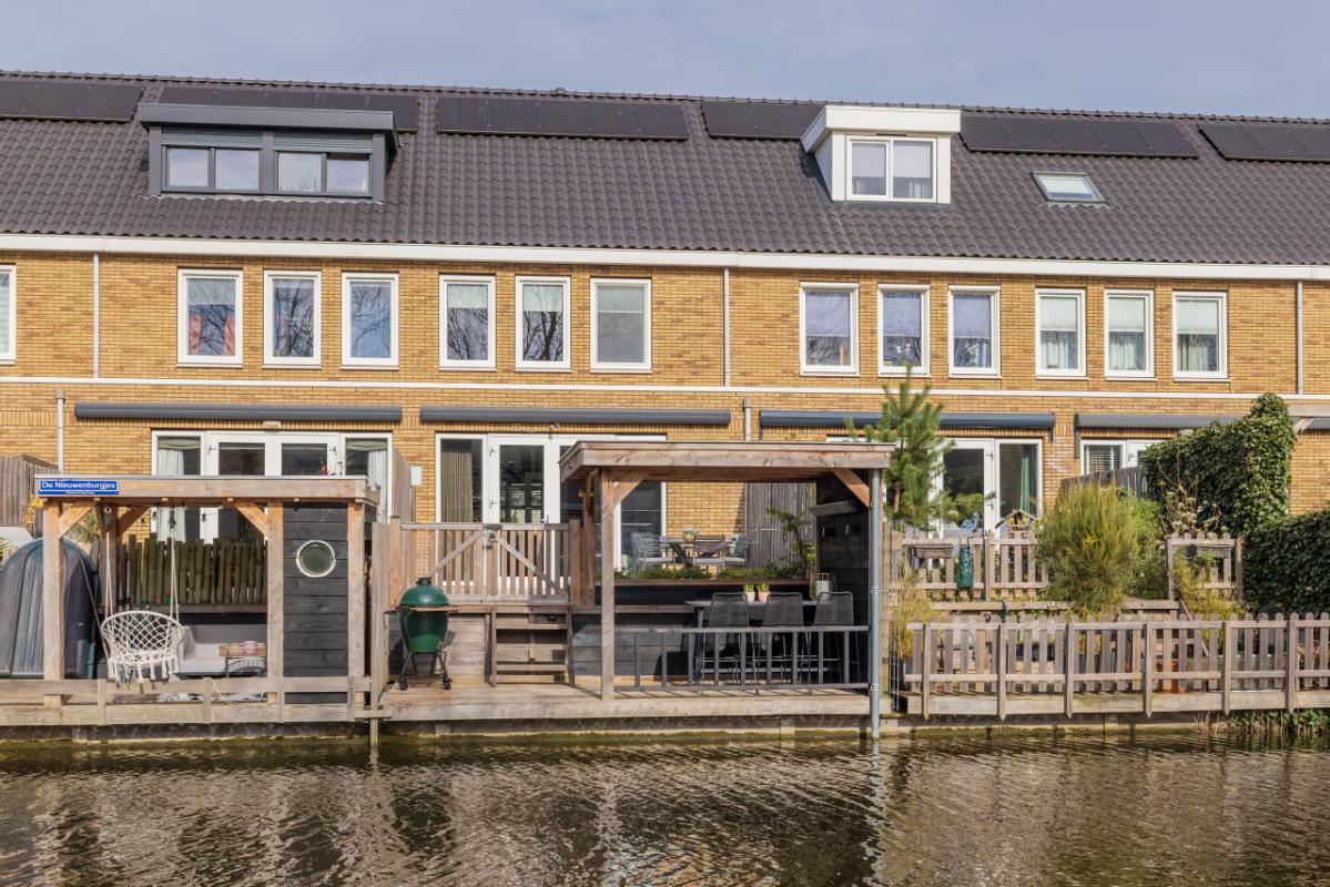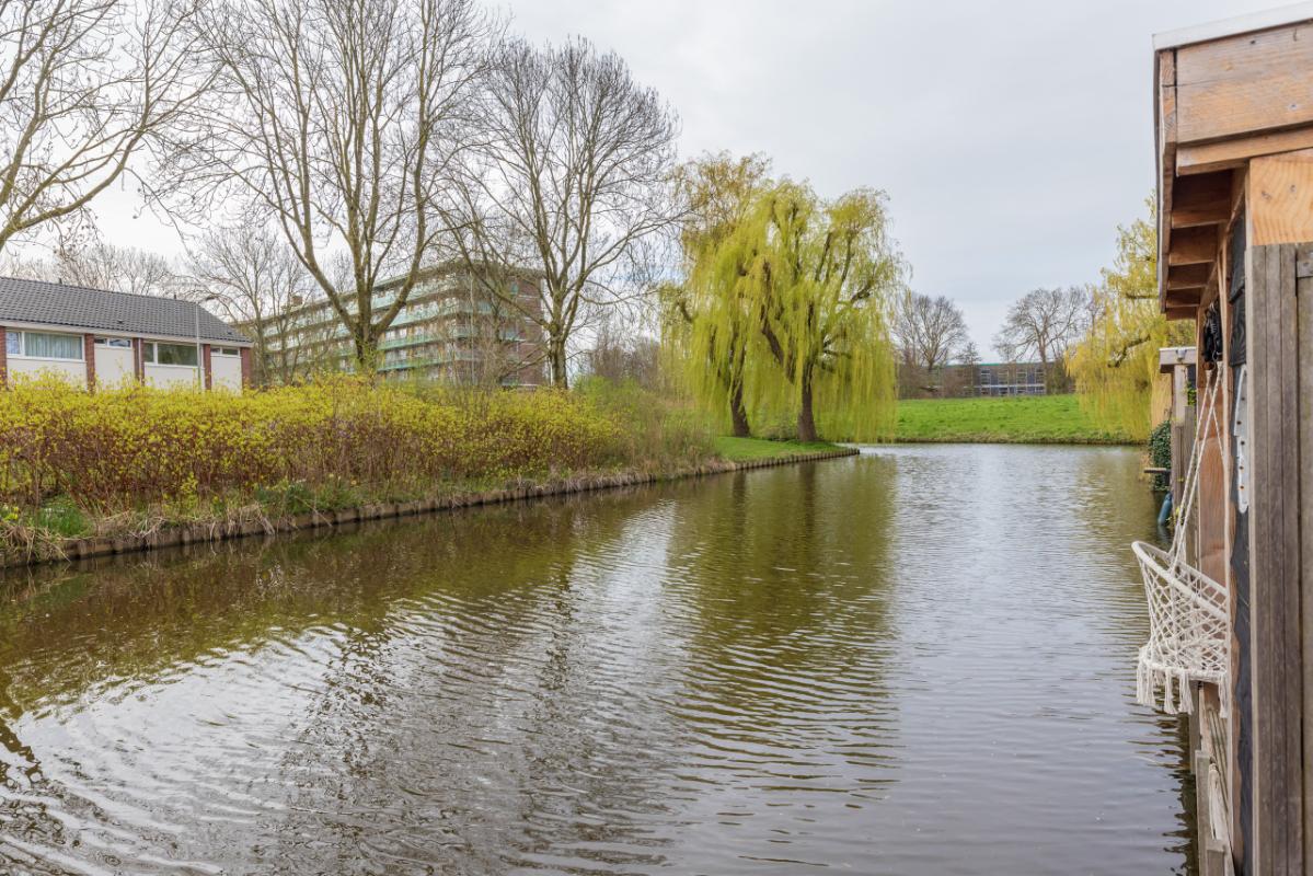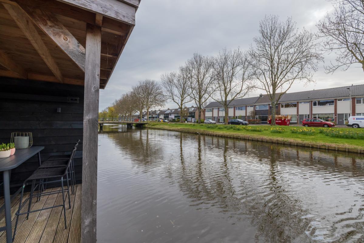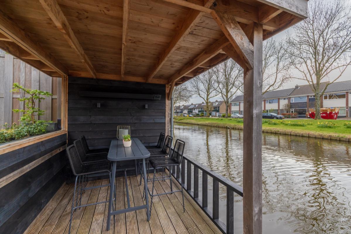 Garden The front garden is neatly landscaped with decorative paving, raised plant borders with attractive greenery, and a beech hedge. Waste bins are discreetly hidden behind a green partition. There is also a wooden pergola (currently used as a swing) and access to the storage shed (approx. 5 m²). A lovely spot to enjoy the evening sun. The southeast-facing backyard is modernly landscaped with trendy taupe-colored terrace tiles and a raised plant border. With dimensions of approx. 6.69 m deep and 5.42 m wide, there is ample space for relaxing, playing, and outdoor dining. The electric awning provides extra comfort on sunny days. Both the front and rear feature frost-free outdoor taps, and the garden includes atmospheric outdoor lighting (available for takeover). At the rear, there is a lower terrace by the water (enclosed with a gate), finished with wooden decking. This terrace (approx. 2.28 m deep) includes a charming wooden veranda with partial glass at the back, allowing you to enjoy waterfront living in comfort.