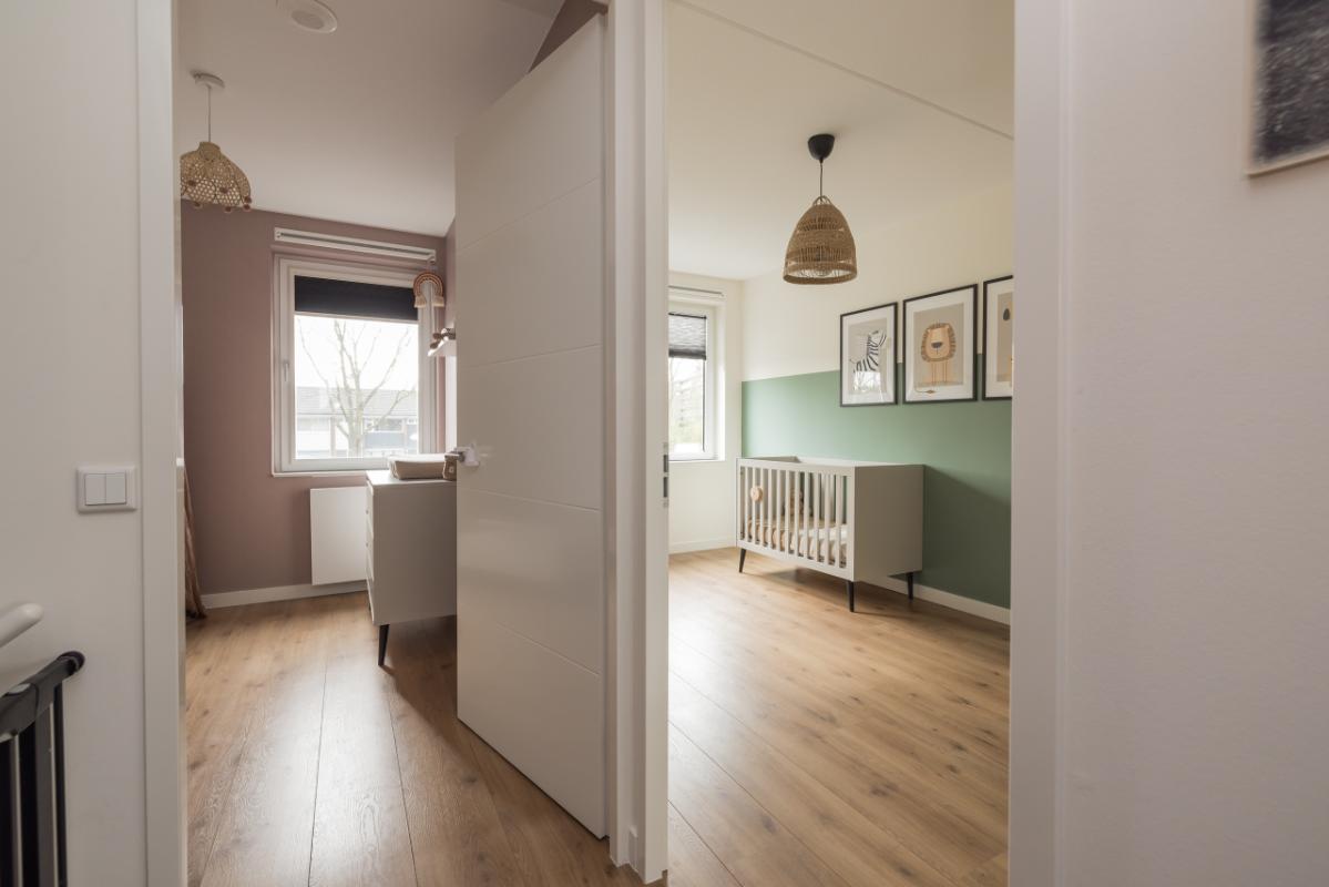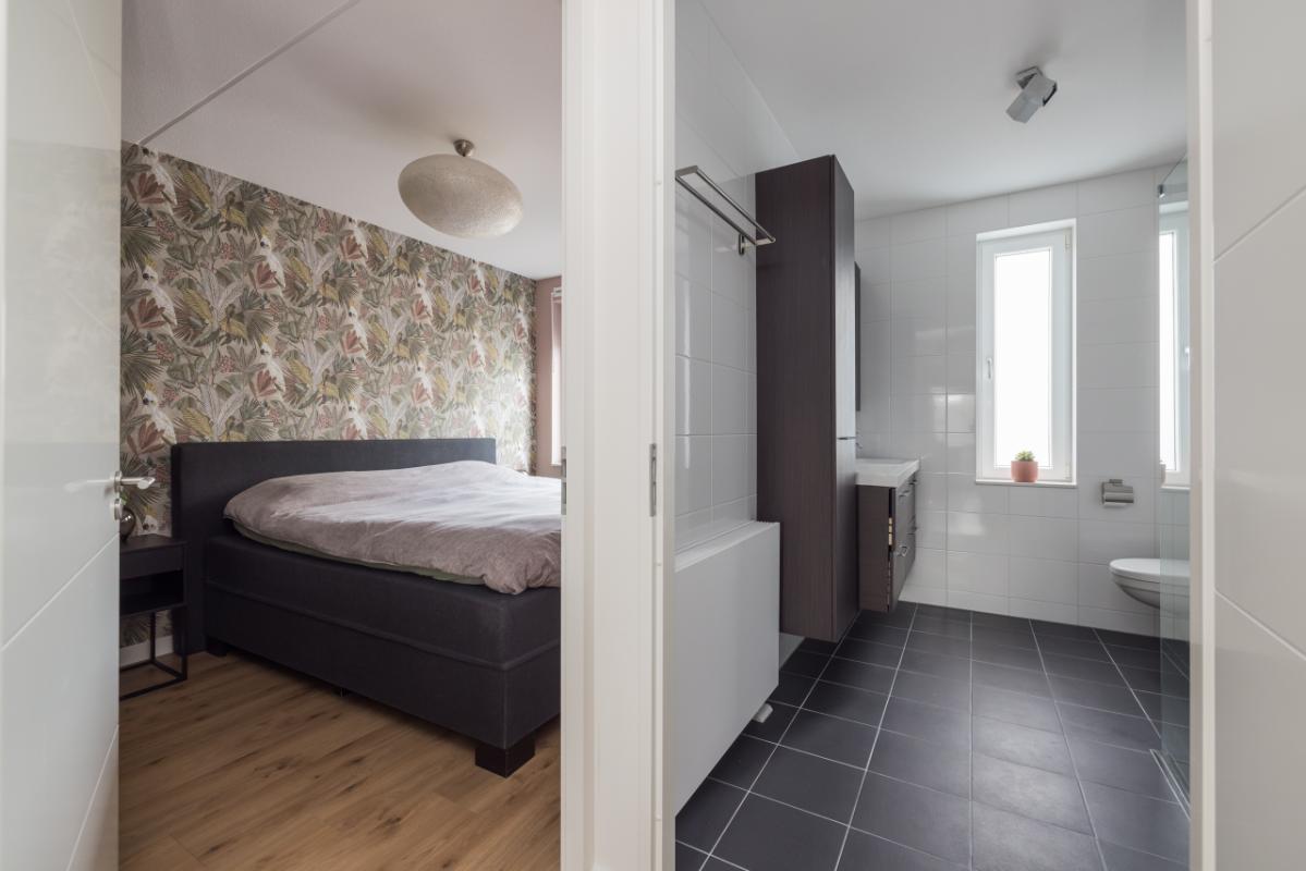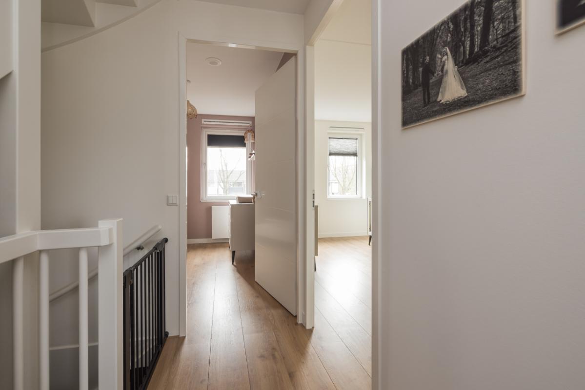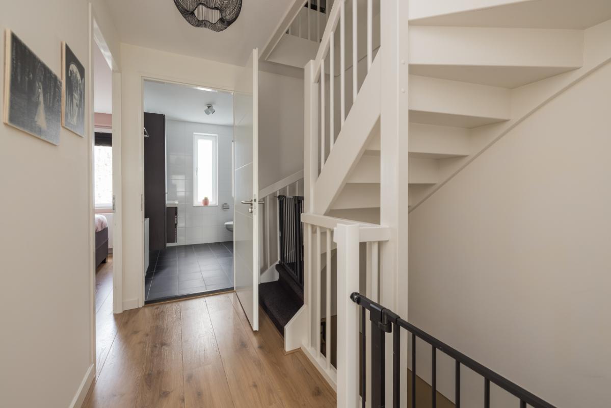 1e etage Overloop met toegang tot drie slaapkamers. Aan de achterzijde bevinden zich twee slaapkamers, en aan de voorzijde een ruime derde slaapkamer met kastruimte. De gehele verdieping is voorzien van een sfeervolle, drempelloos doorgelegde laminaatvloer. Aan de voorzijde ligt de moderne badkamer in wit/antraciet kleurstelling, uitgerust met een ruime inloopdouche, zwevend toilet en een stijlvol dubbel wastafelmeubel in houtlook met bijpassende badkamerkast.