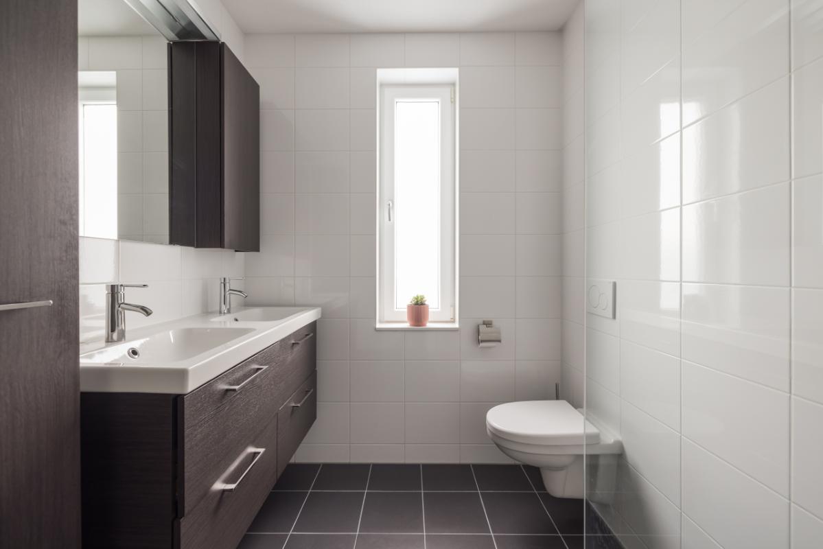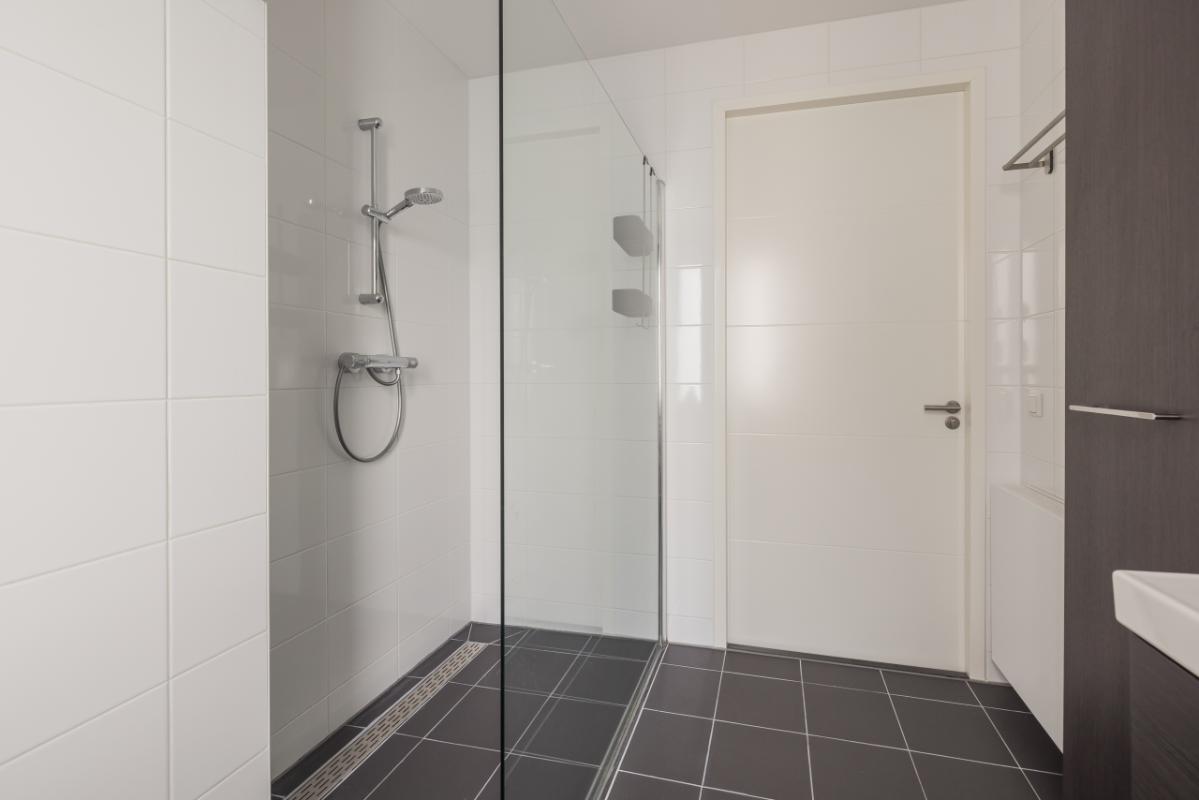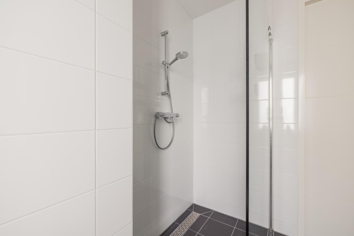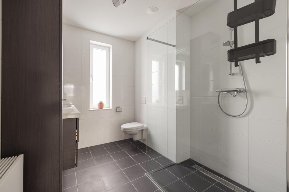 1e etage Overloop met toegang tot drie slaapkamers. Aan de achterzijde bevinden zich twee slaapkamers, en aan de voorzijde een ruime derde slaapkamer met kastruimte. De gehele verdieping is voorzien van een sfeervolle, drempelloos doorgelegde laminaatvloer. Aan de voorzijde ligt de moderne badkamer in wit/antraciet kleurstelling, uitgerust met een ruime inloopdouche, zwevend toilet en een stijlvol dubbel wastafelmeubel in houtlook met bijpassende badkamerkast.