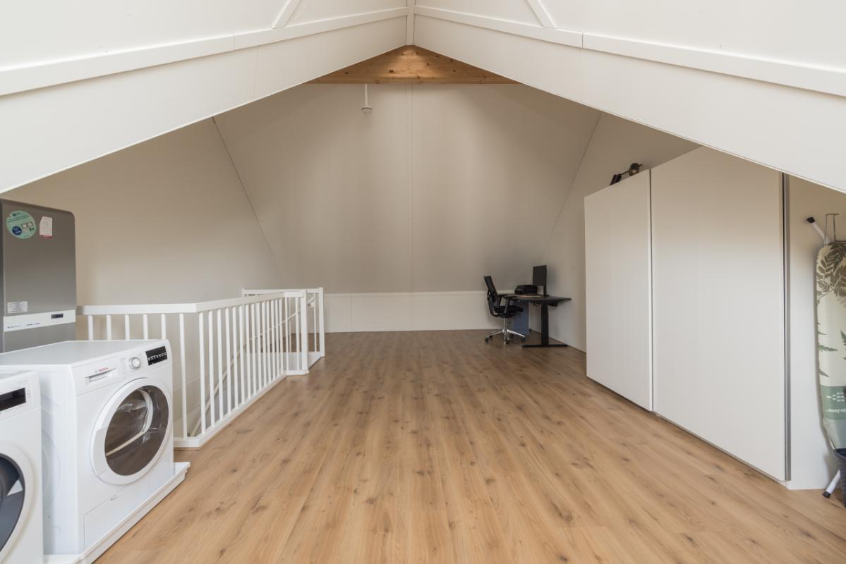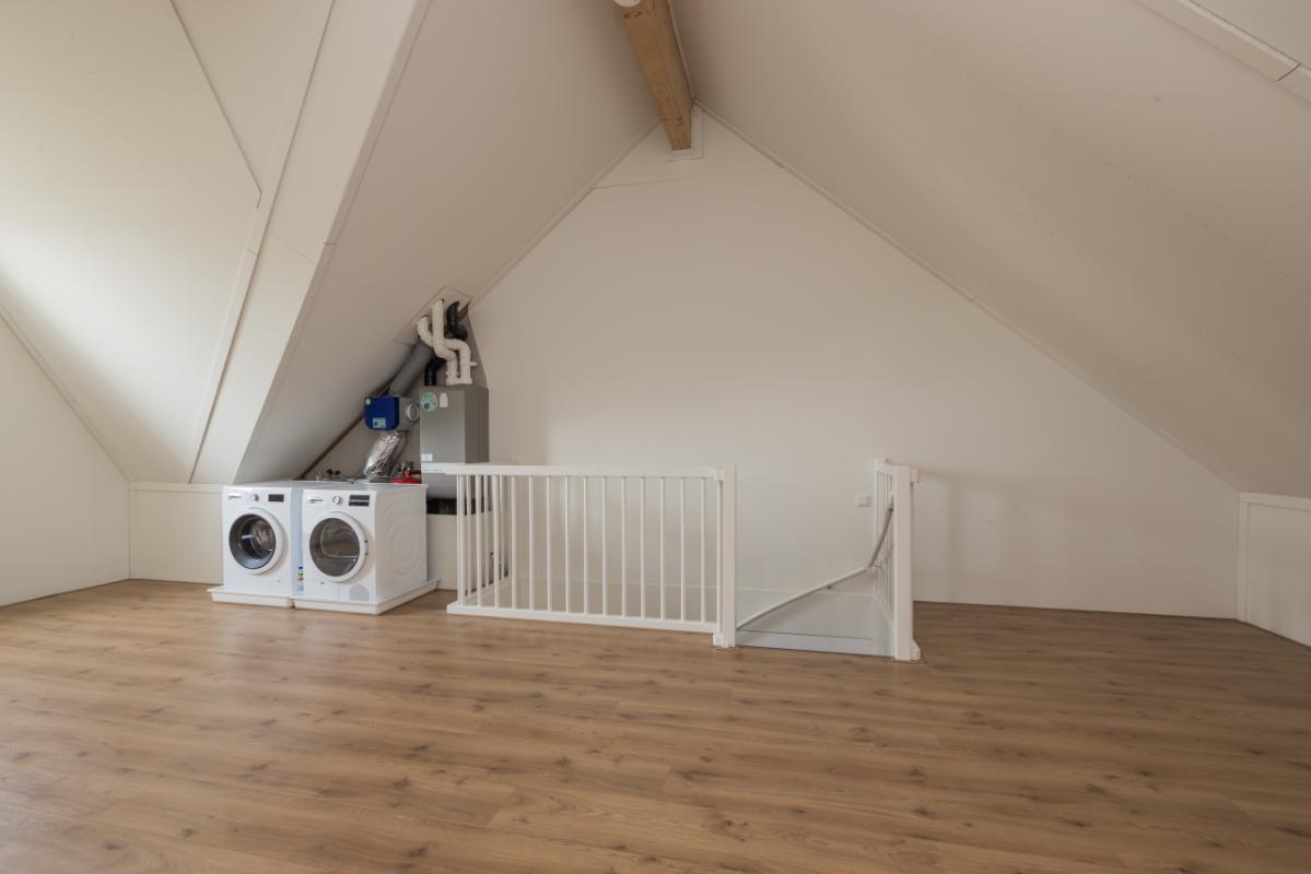 2e etage Royale zolderverdieping met dezelfde laminaatvloer. Hier bevinden zich de opstelling van de c.v.-combiketel (Itho Base Cube Duo 24/35 CW5, 2016), de mechanische ventilatie-unit en de aansluitingen voor wasapparatuur.