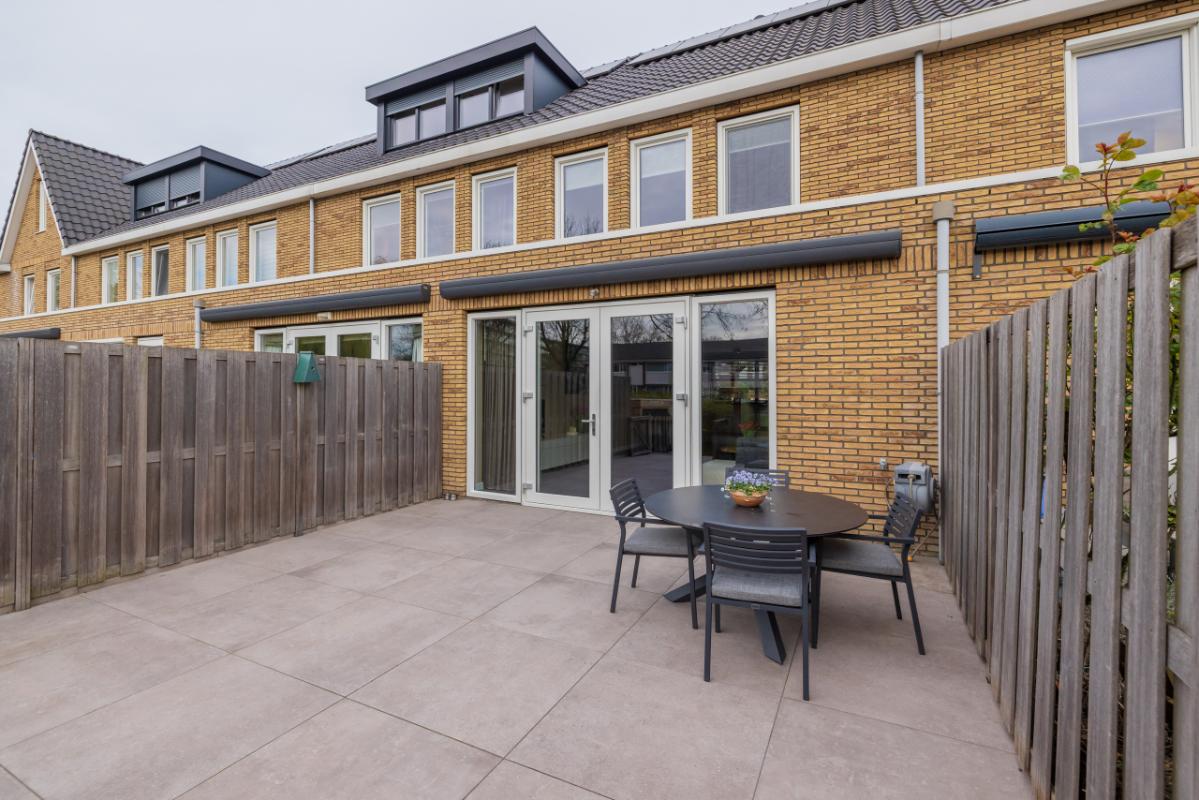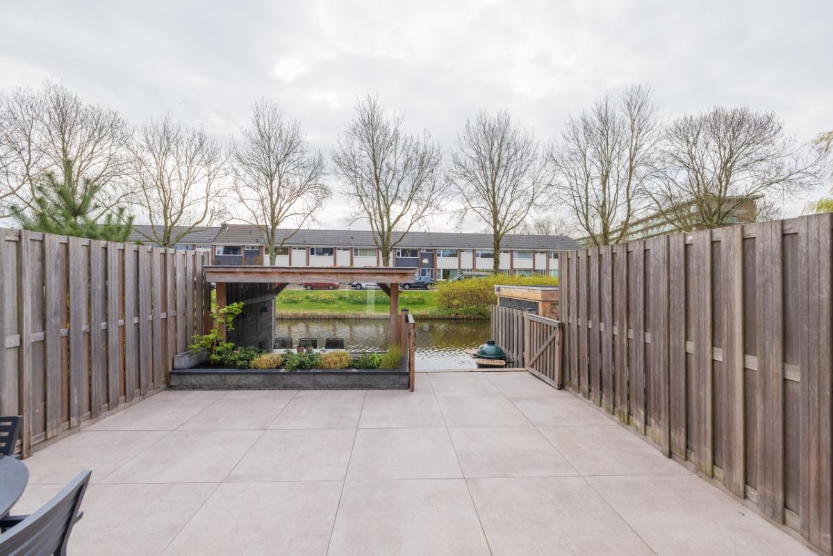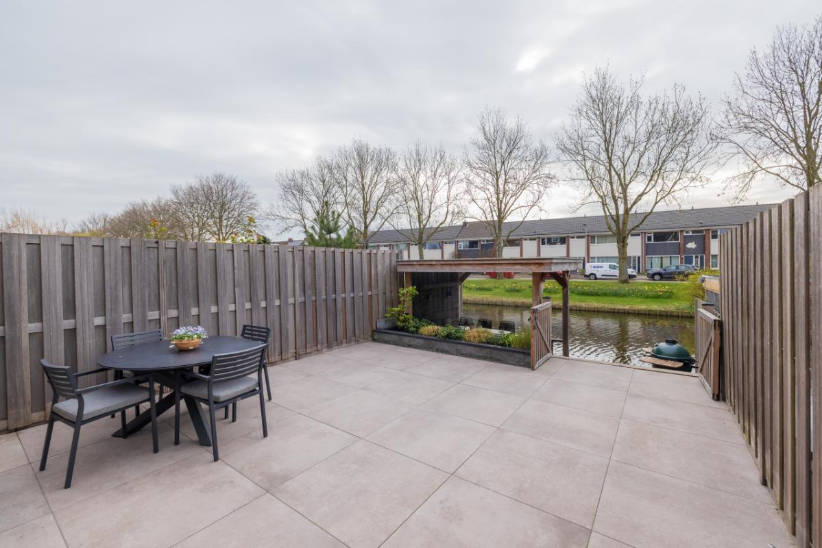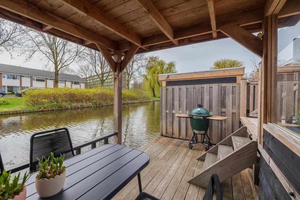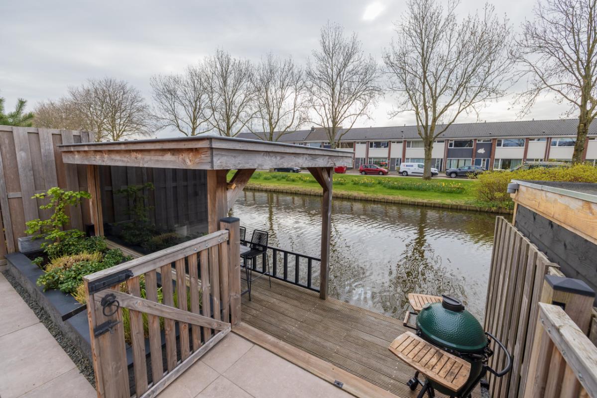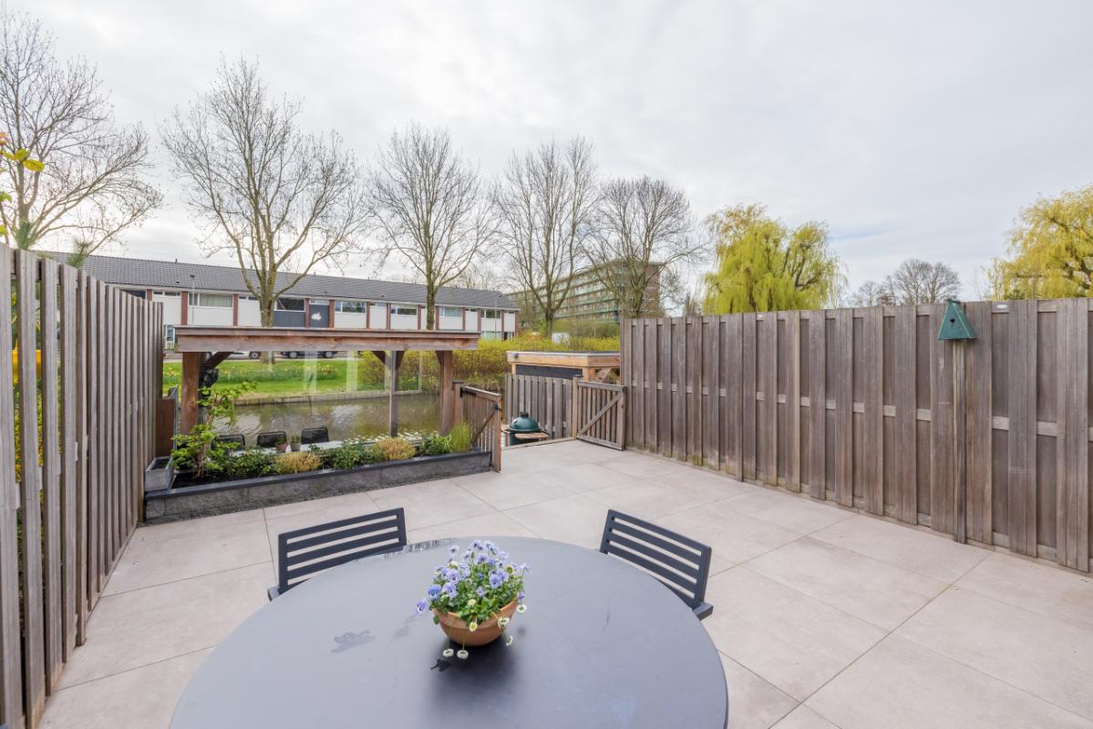 De achtertuin ligt op het zuidoosten en is modern aangelegd met trendy taupe-kleur terrastegels en een verhoogde plantenborder. Dankzij de afmetingen (ca. 6,69 m diep en 5,42 m breed) is er volop ruimte om te ontspannen, spelen en buiten te eten. Het elektrische zonnescherm zorgt voor extra comfort op zonnige dagen. Aan zowel de voor- als achterzijde is een vorstvrije buitenkraan aanwezig en de tuin is voorzien van sfeervolle buitenverlichting (ter overname). Aan de achterzijde bevindt zich een lagergelegen terras (afsluitbaar met hek) aan het water, afgewerkt met houten vlonderdelen. Dit terras (ca. 2,28 m diep) heeft een sfeervolle houten veranda met aan één kant glas in de achterwand, waardoor je hier in alle comfort kunt genieten van het buitenleven aan de waterkant.