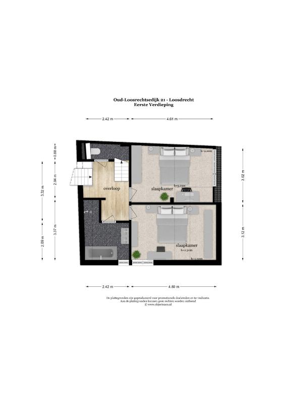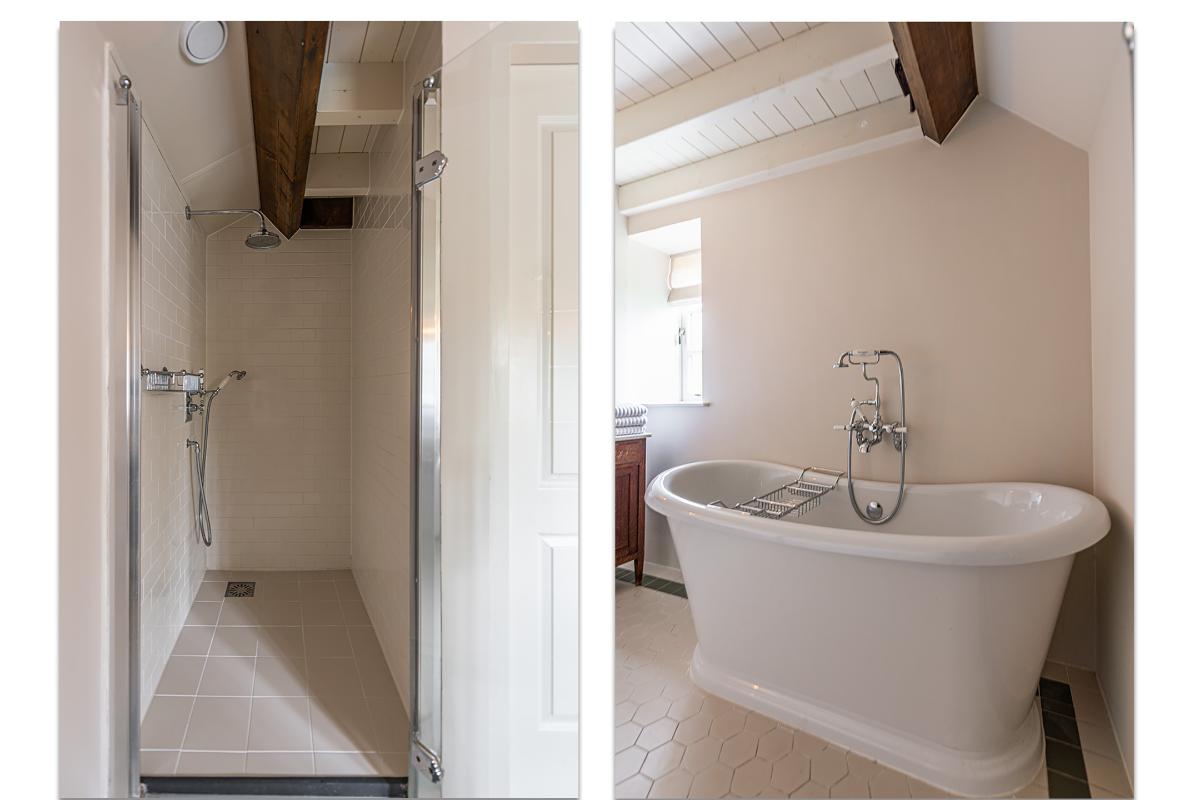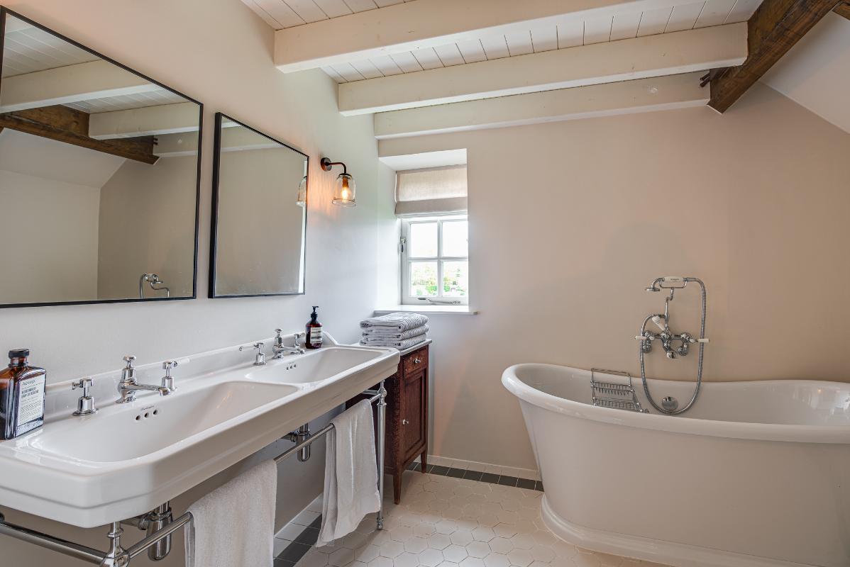 Eerste verdieping: Ruime overloop met tweede toilet, twee grote slaapkamers en een moderne badkamer met dubbele wastafel, ligbad en inloopdouche.