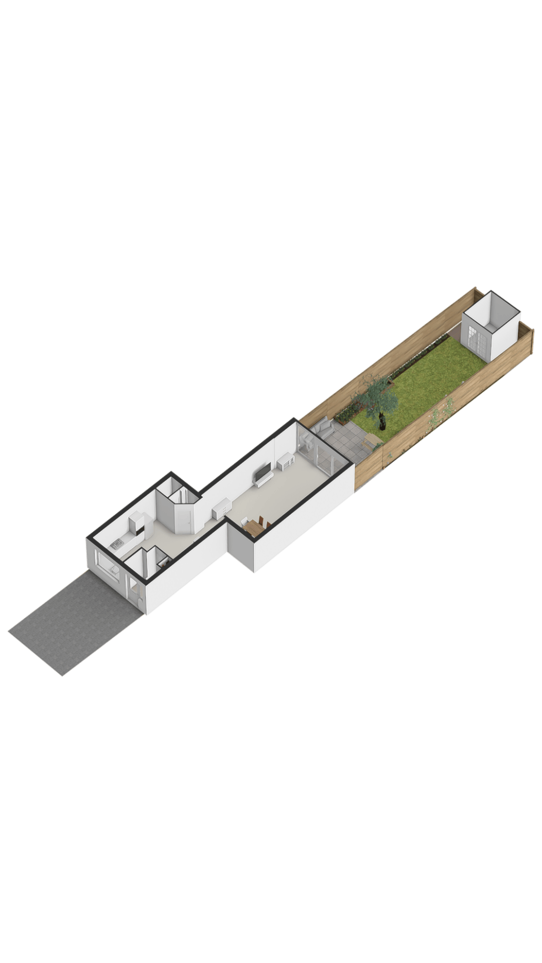 Tuin: De voortuin is geheel bestraat en hier kun je de auto dus op eigen terrein parkeren. De achtertuin is deels voorzien van sierbestrating en veel groen. De diepe achtertuin ligt op het zuidwesten aan het park en de tennisbanen. Via de achterom sta je zo tussen het groen.