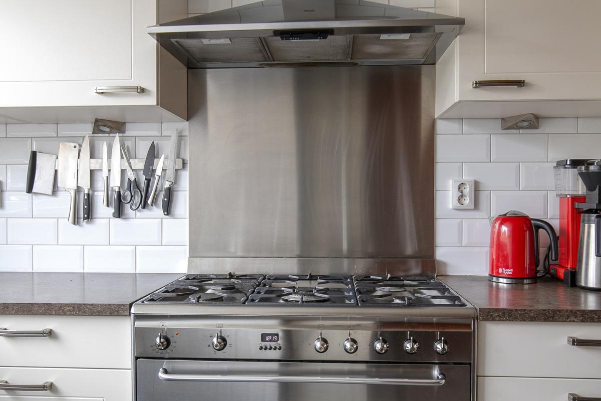 Keuken: Ruime en open woonkeuken (2014) in hoekopstelling aan de voorzijde van de woning. De keuken is voorzien van veel kastruimte, een lang werkblad en (inbouw)apparatuur: een 5-pits gasfornuis inclusief grote oven en afzuigkap en vaatwasser.