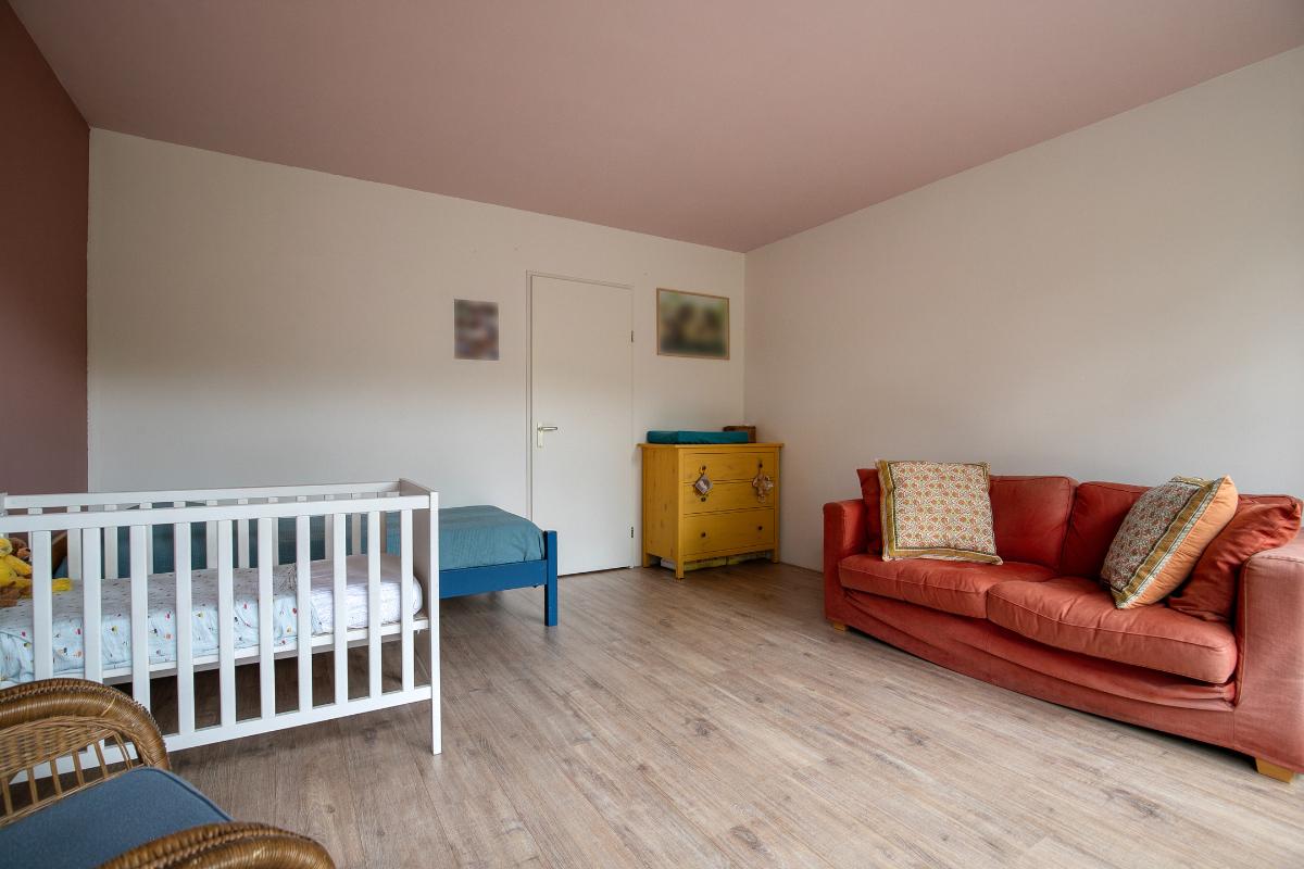 Slaapkamers: Slaapkamer 3: ligt aan de achterzijde van de woning, een ruime kamer met kunststof kozijnen met draai-kiepramen. Er ligt laminaat en de wanden zijn glad gestukt. Deze kamer geeft ruimte om uit te breiden naar twee slaapkamers. Slaapkamer 4: ligt aan de voorzijde van de woning, heeft dezelfde afwerking als slaapkamer 3.