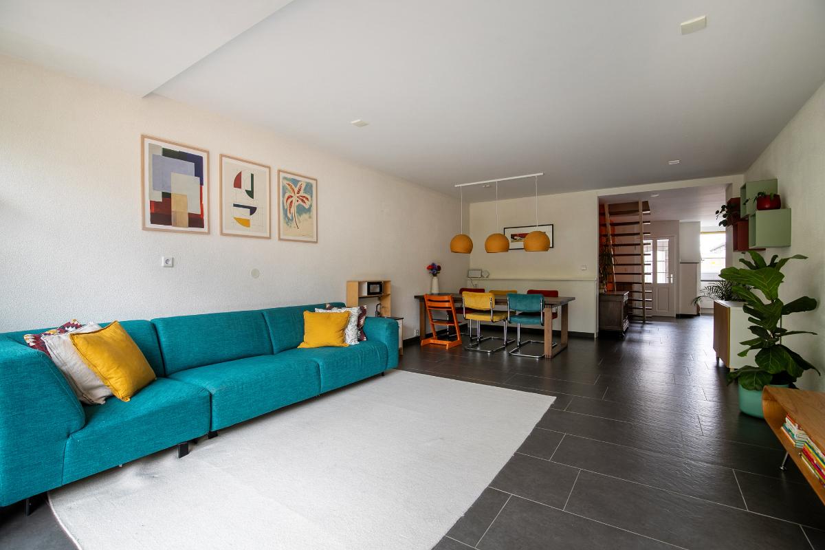 Woonkamer: De woonkamer ligt aan de achterzijde van de woning en is heerlijk ruim. Op de vloer ligt een plavuizen vloer en is voorzien van vloerverwarming. Via de grote schuifpui loop je zo de heerlijke achtertuin in met vrij uitzicht over het park. Vanaf de eettafel kijk je heerlijk weg. Een fijne plek om te samen te komen, te eten of te werken.