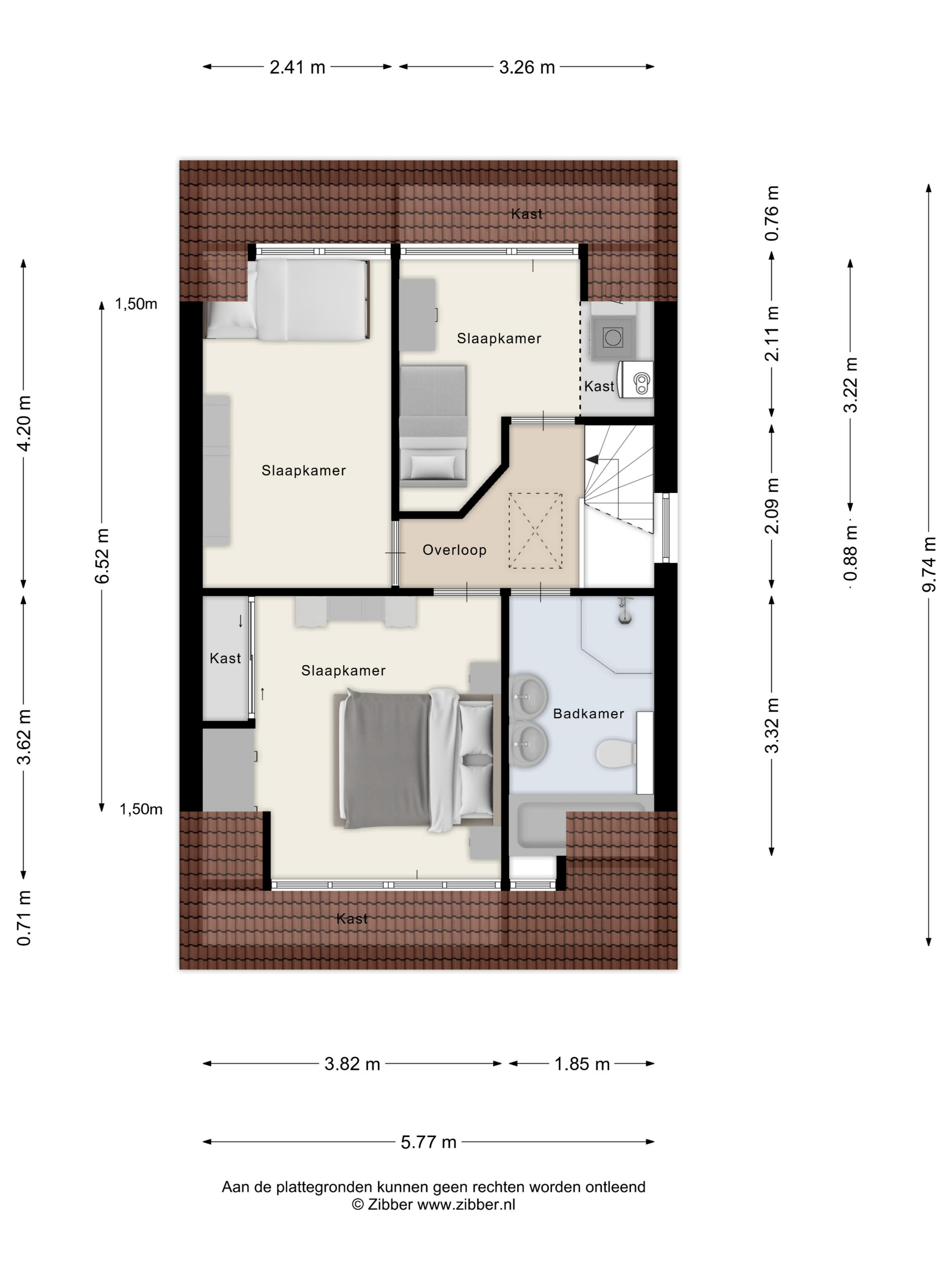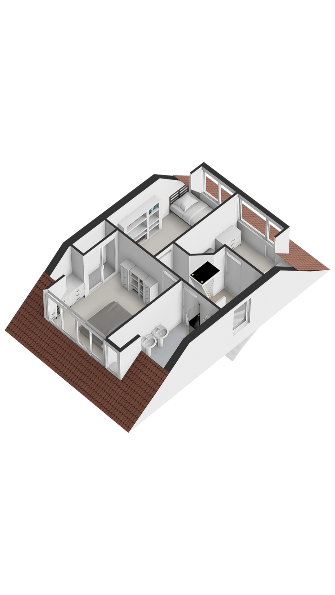 Slaapkamers: Slaapkamer 1 (hoofdslaapkamer): aan de voorzijde, met dakkapel. Slaapkamer 2: aan de achterzijde, eveneens met dakkapel. Slaapkamer 3: compacte (logeer)kamer met dakkapel aan de achterzijde, in gebruik als wasruimte met aansluiting voor wasmachine en droger en opstelplaats voor de cv-ketel (binnenwerk vernieuwd in 2019).