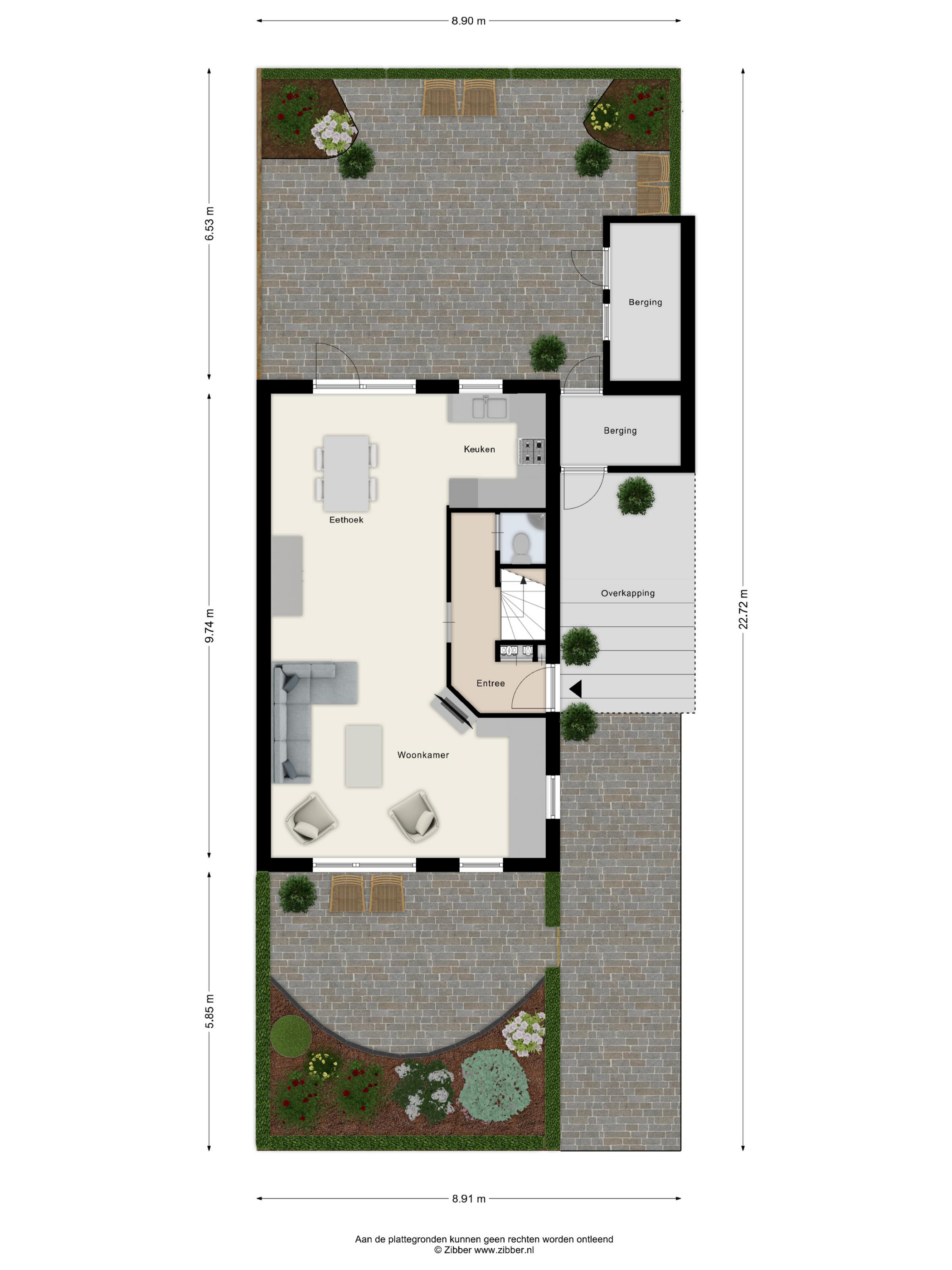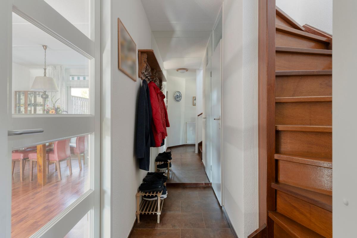 Begane grond: Hal: We beginnen aan de voorzijde, waar een fraai aangelegde voortuin met sierbestrating en groenpartijen direct een verzorgde indruk maakt. Hier is het heerlijk zitten in de zon. Aan de zijkant bevindt zich de overdekte entree. In de hal treffen we de meterkast, het moderne zwevende toilet met fonteintje en de trapopgang naar boven.