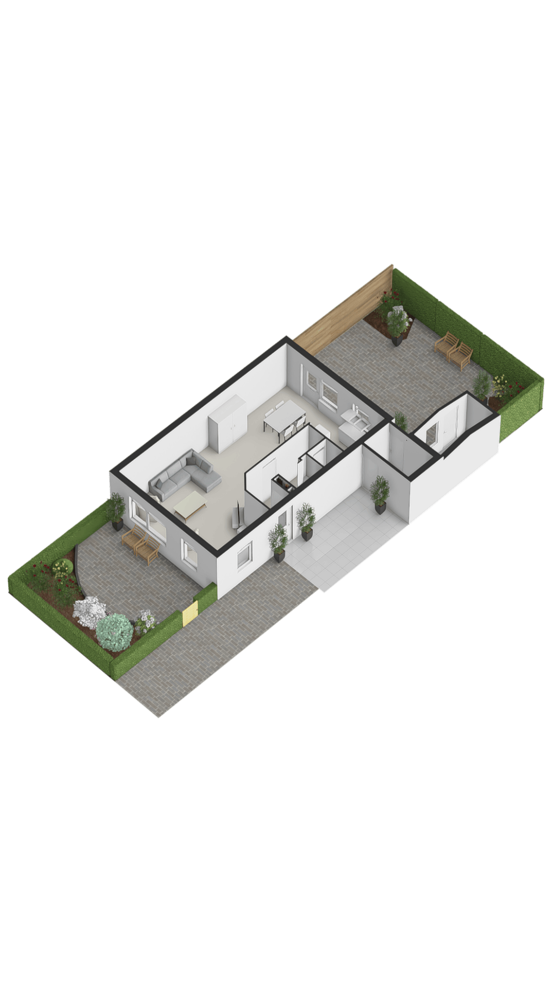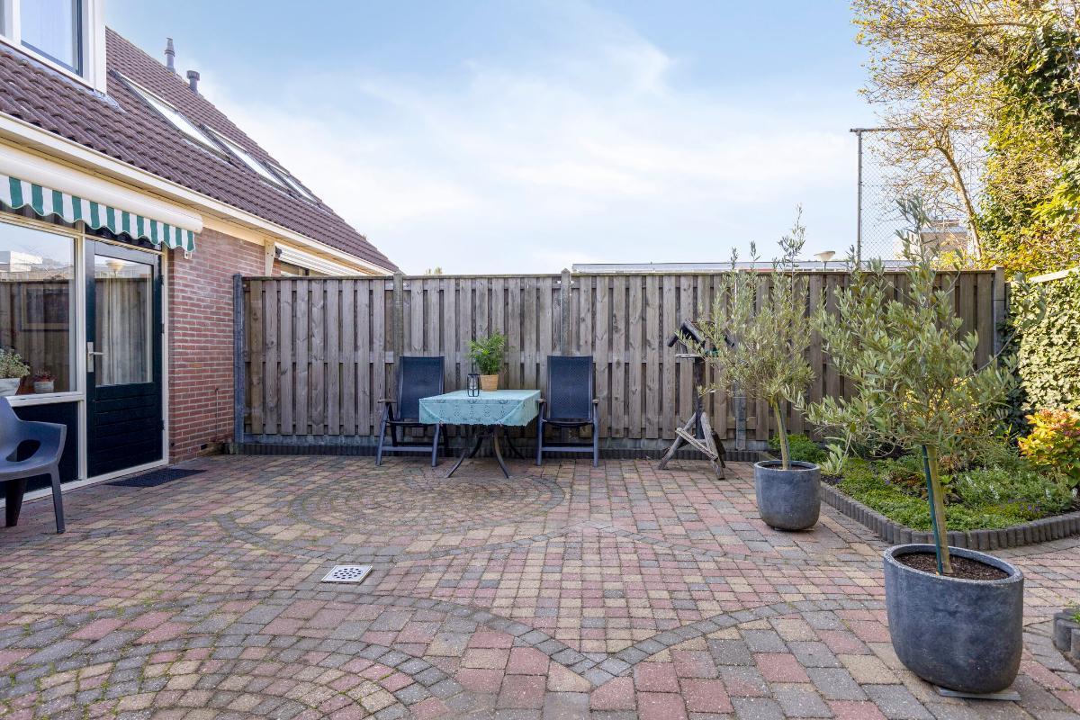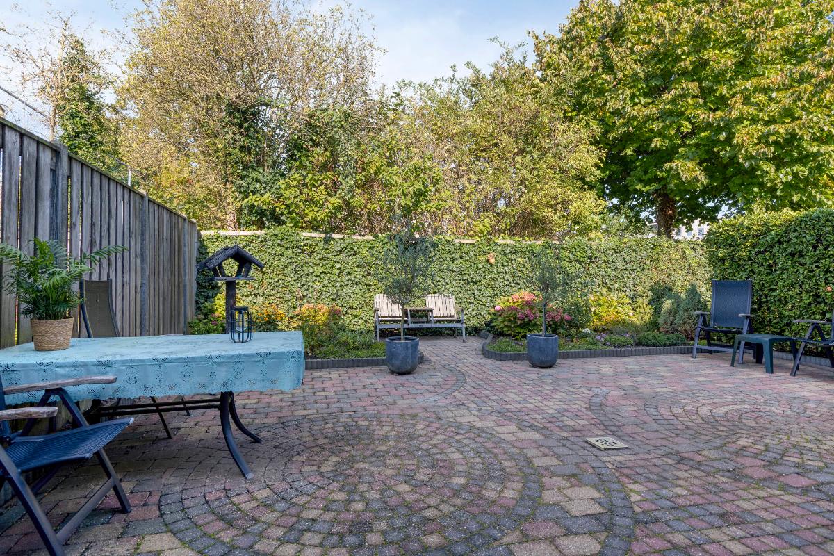De achtertuin, gelegen op het noordwesten, circa 6,5 x 9 meter (feitelijk ca. 8 meter diep dankzij een strookje grond van 16 m² in bruikleen van de gemeente). De tuin is ingericht met sierbestrating en een gazon en biedt in de zomer zon tot ongeveer 19.30 uur. Dankzij het elektrische zonnescherm creëert u eenvoudig schaduw waar gewenst. Achterin grenst de tuin aan een speelveld — vrij en groen uitzicht dus!
