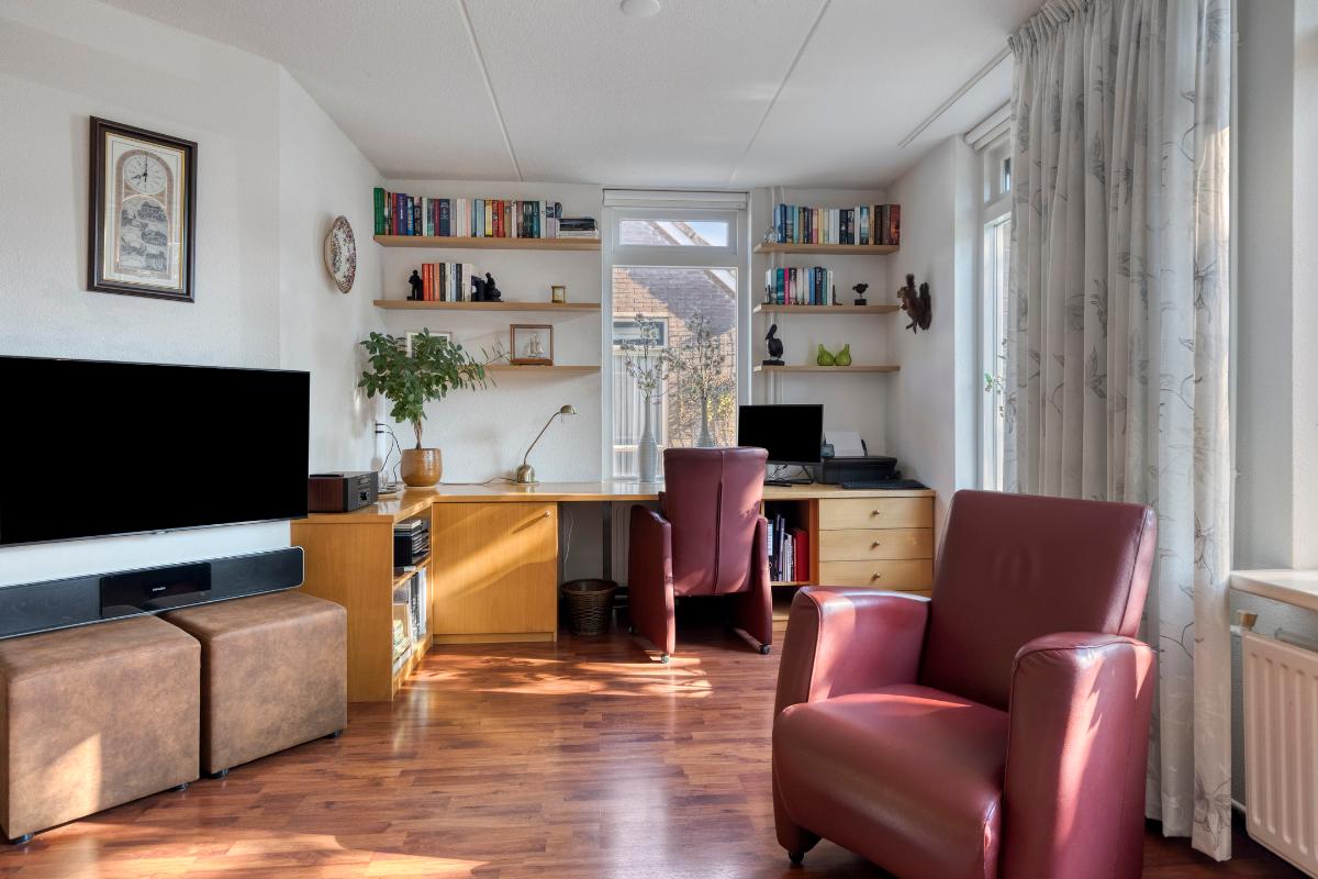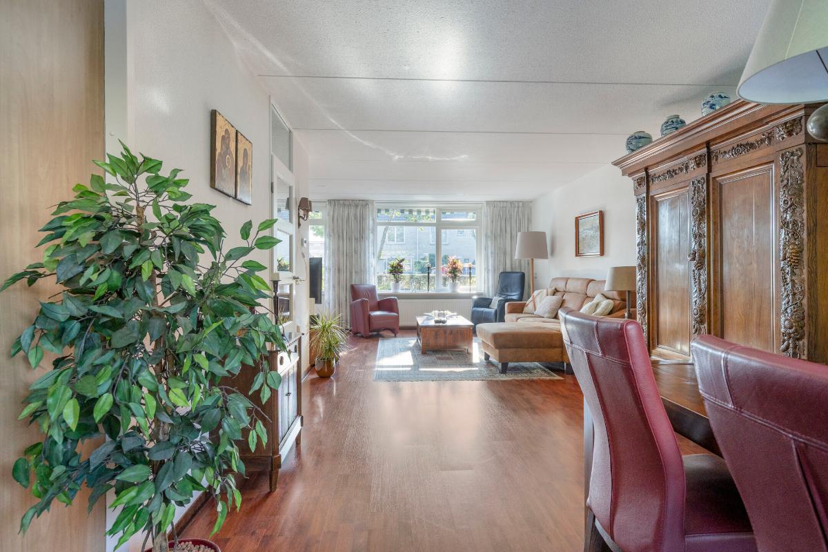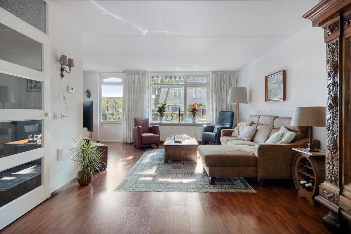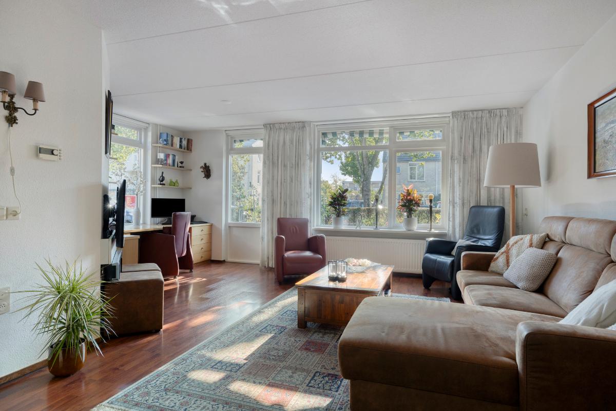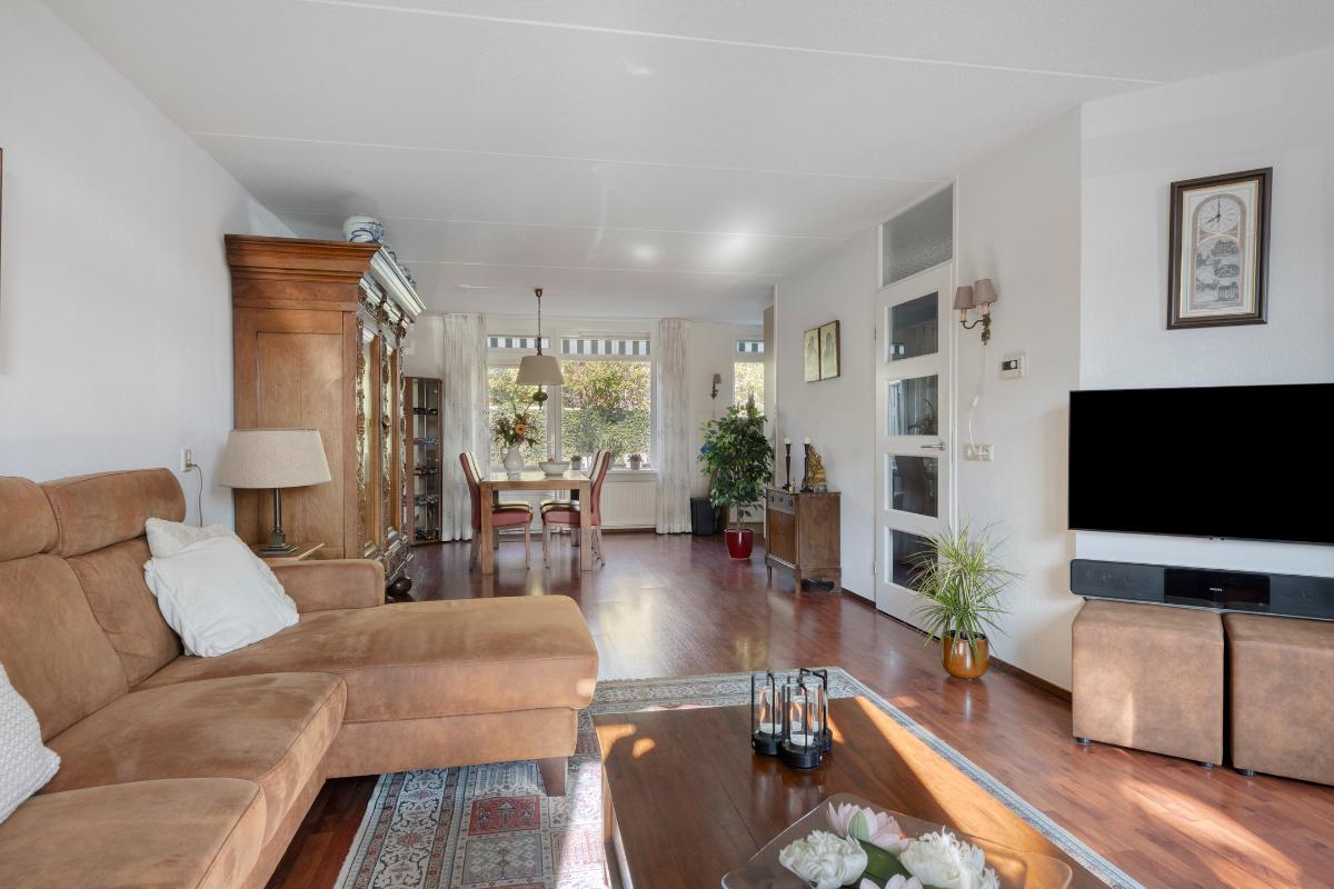 Woonkamer: Via de hal stappen we de royale, lichte woonkamer binnen — een sfeervolle ruimte van circa 40 m² in L-vorm (ca. 10,00 x 6,00/3,75 m). De grote ramen en het extra zijraam zorgen voor veel daglicht en een prettig ruimtelijk gevoel. Aan de voorzijde kijkt u fraai uit over de laan en de voortuin; aan de achterzijde geven openslaande deuren toegang tot de tuin. De vloer is afgewerkt met laminaat, de wanden met spuitwerk.