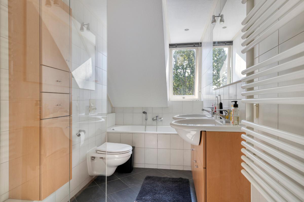 Badkamer: De nette, complete badkamer beschikt over een ligbad, inloopdouche, dubbele wastafel met meubel, handdoekradiator en tweede toilet.