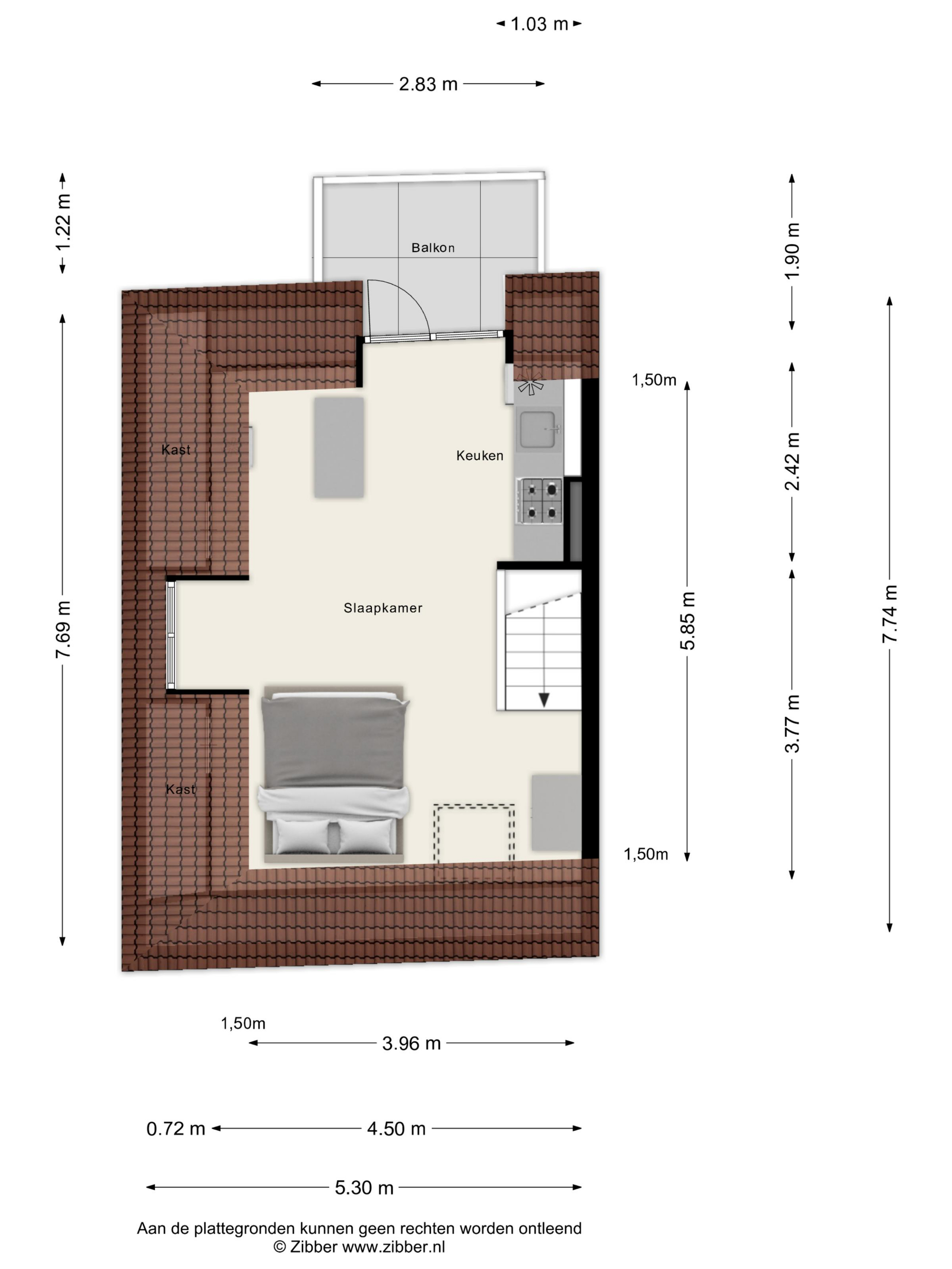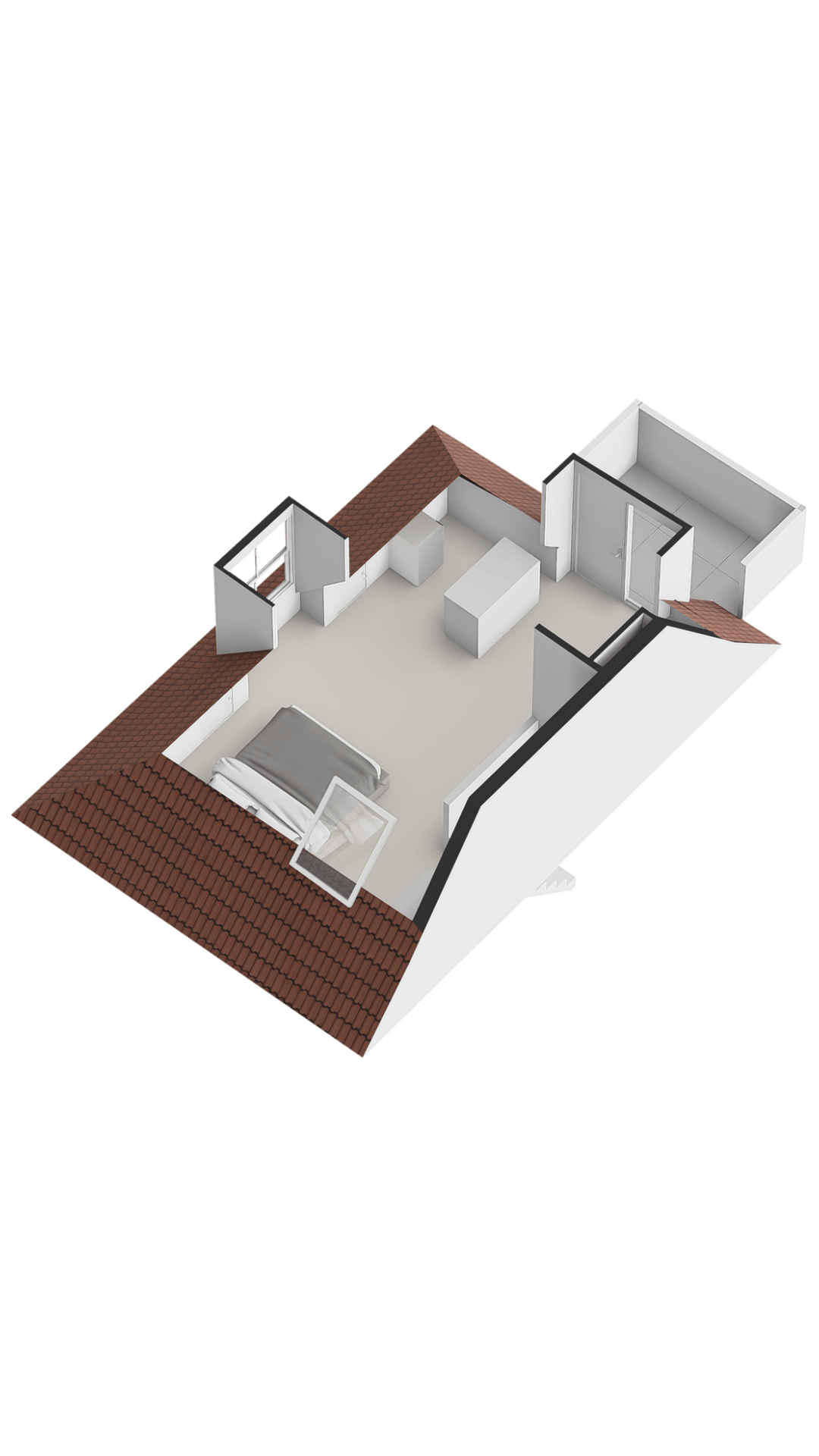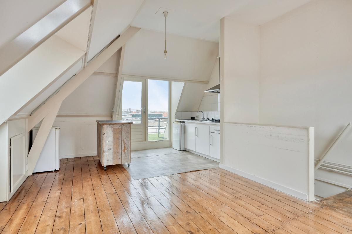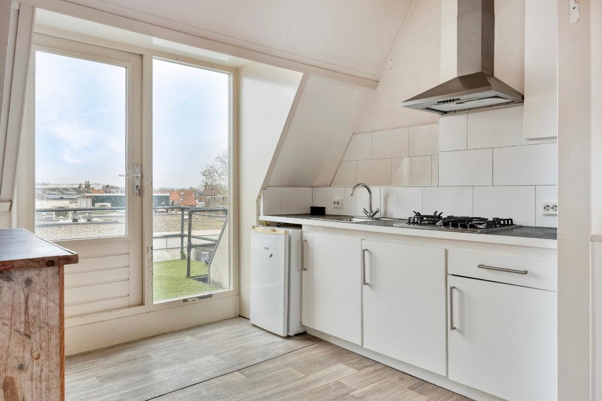 Slaapkamer 4 Via de trap bereikt u de derde verdieping. Deze gezellige ruimte werd eerder gebruikt als tweede woonkamer en beschikt over een eenvoudige open keuken. Vanuit deze ruimte heeft u toegang tot het balkon.