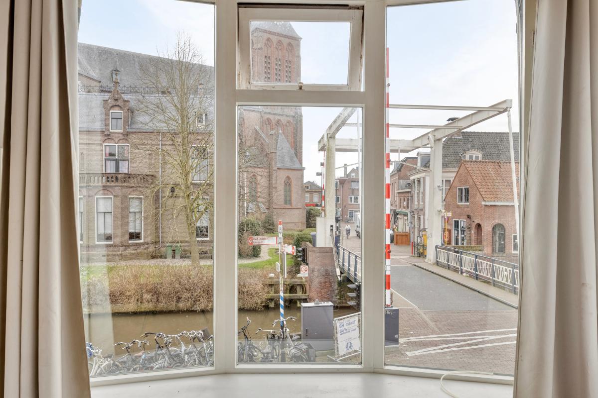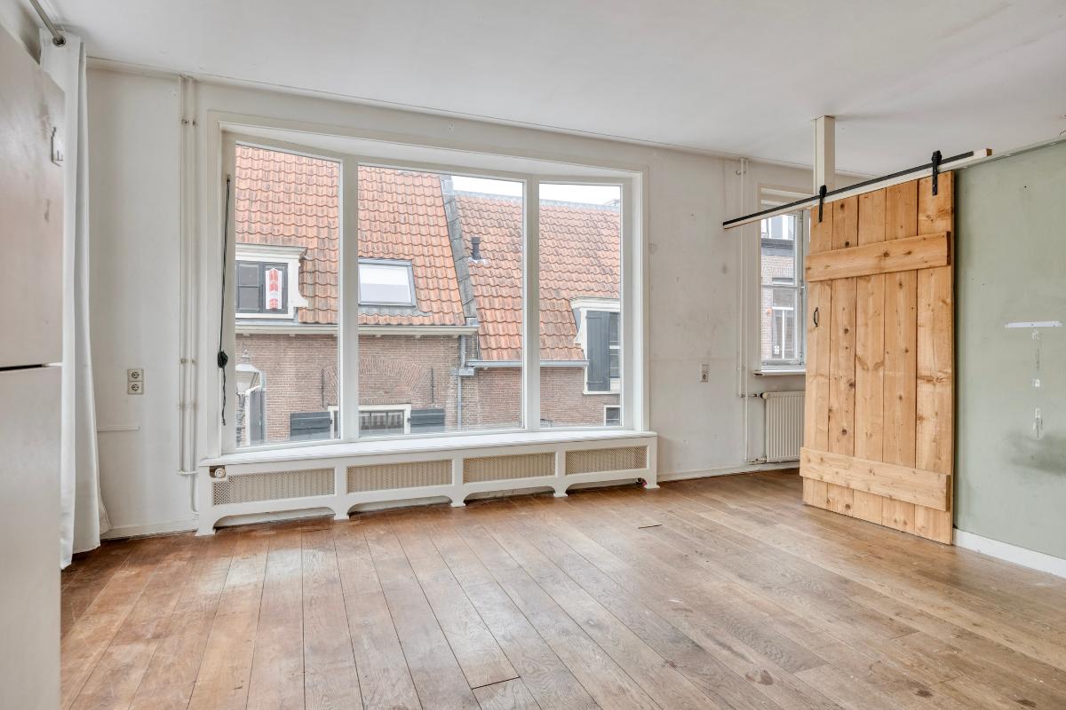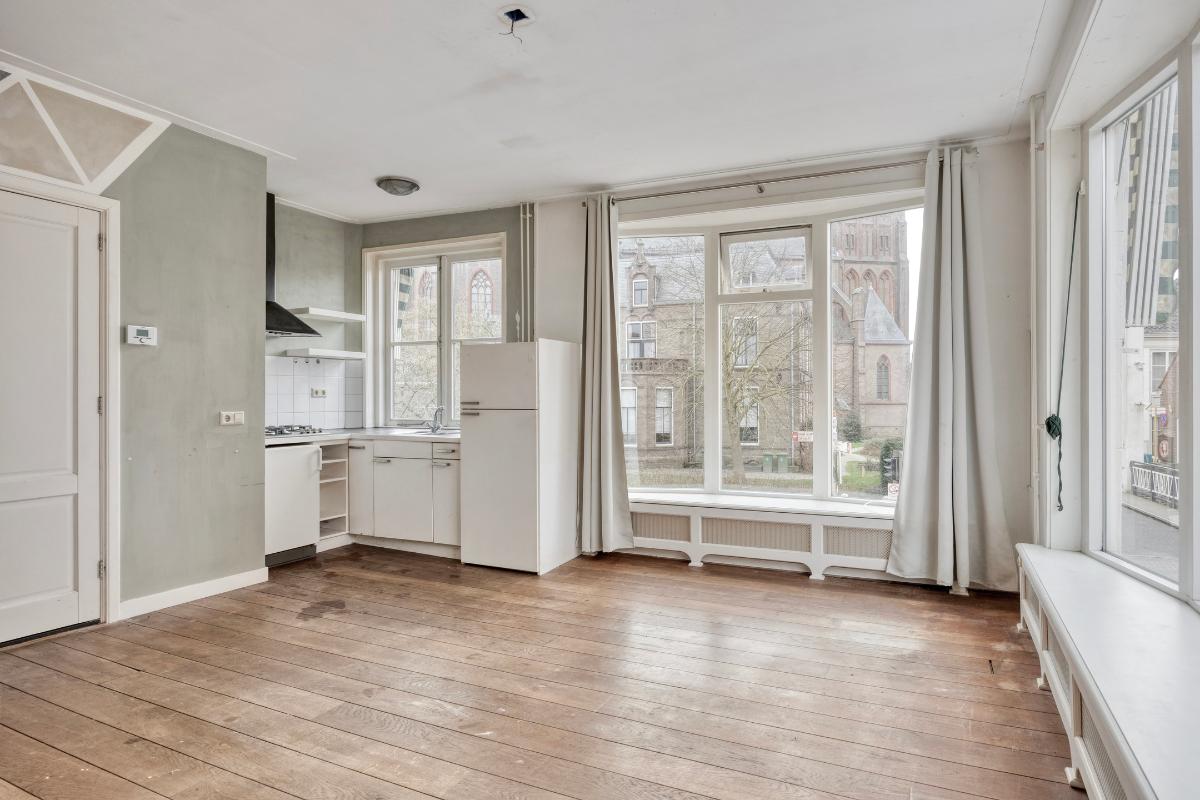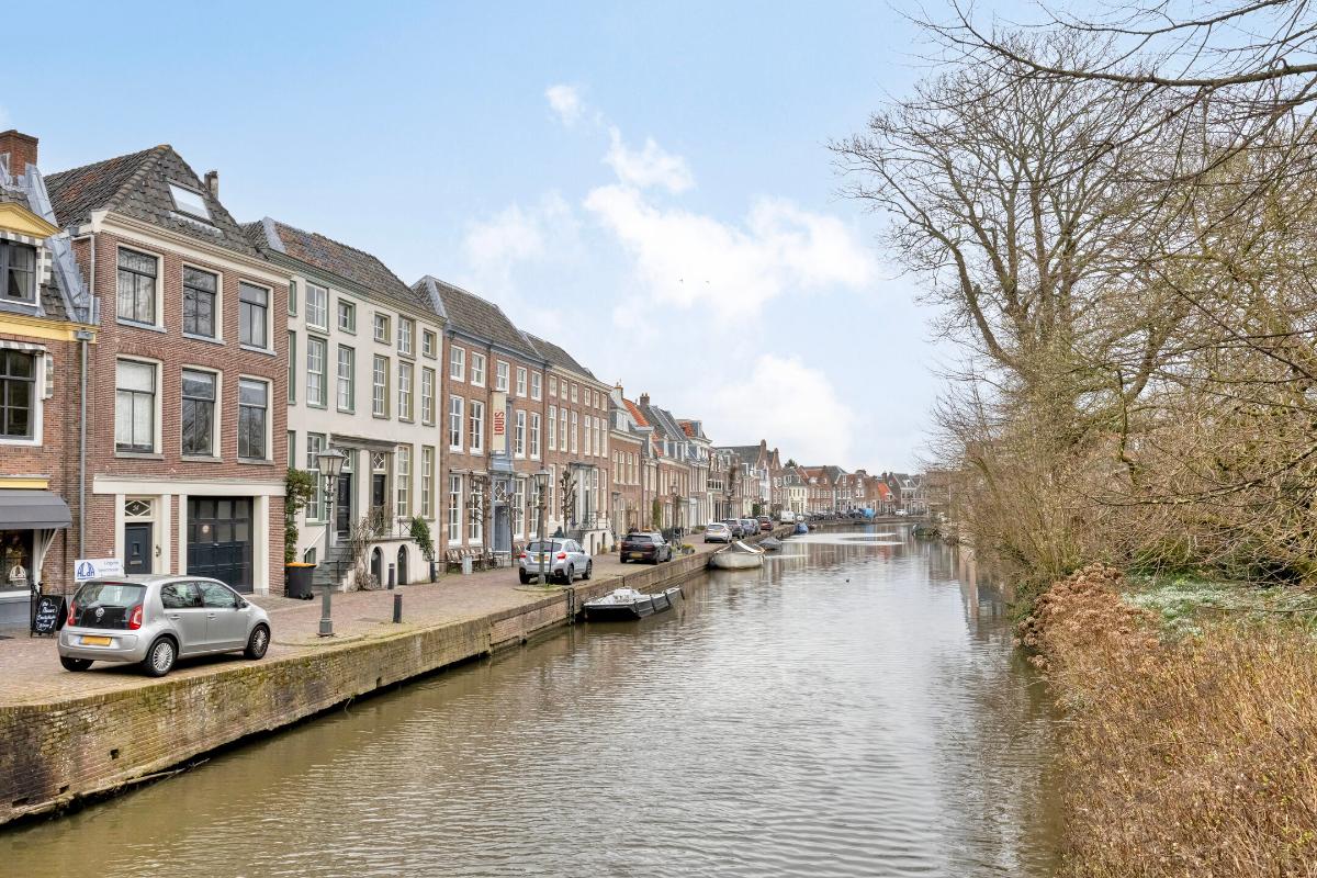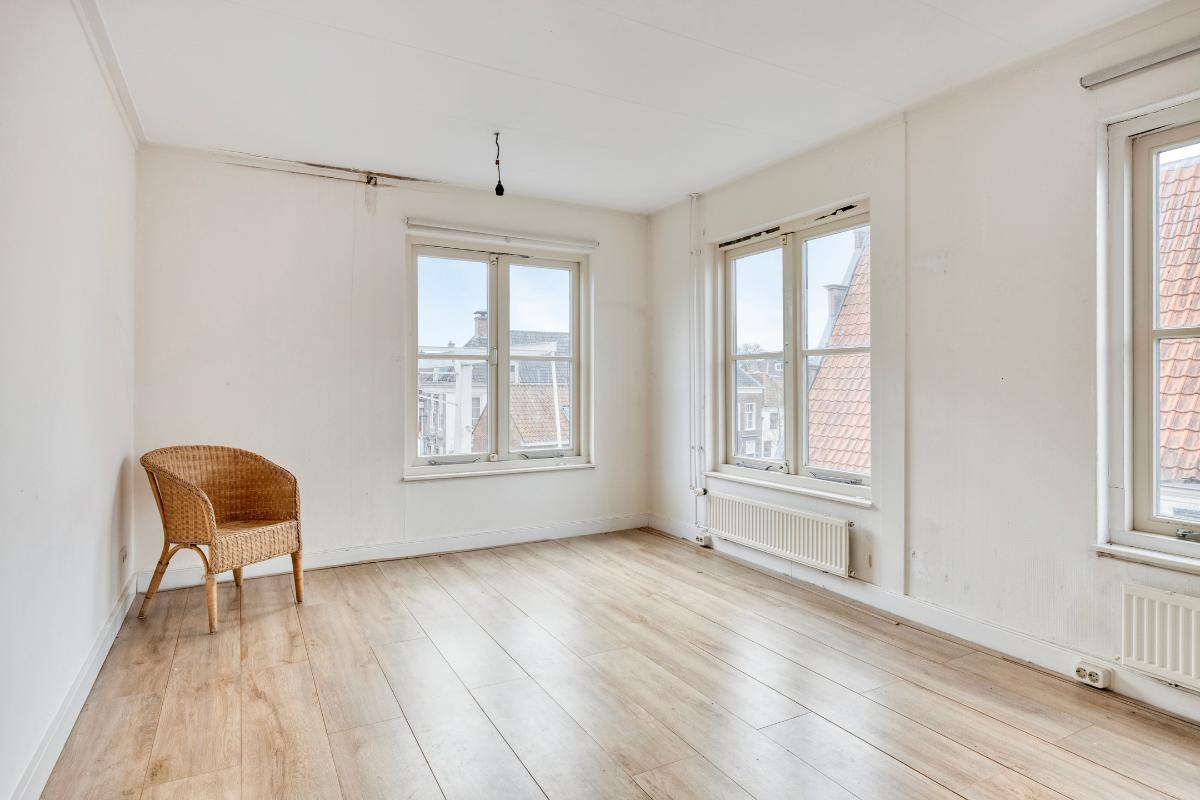 Woonkamer Via de overloop bereikt u de woonkamer. Bij binnenkomst in deze ruime en zonnige kamer valt direct het geweldige uitzicht op. Doordat het appartement op de hoek ligt, heeft u zicht op zowel de Langegracht aan de Vecht als op de Kaatsbaan. Een heerlijke plek om in de vensterbank met een boek te zitten en ondertussen het leven buiten te bekijken.