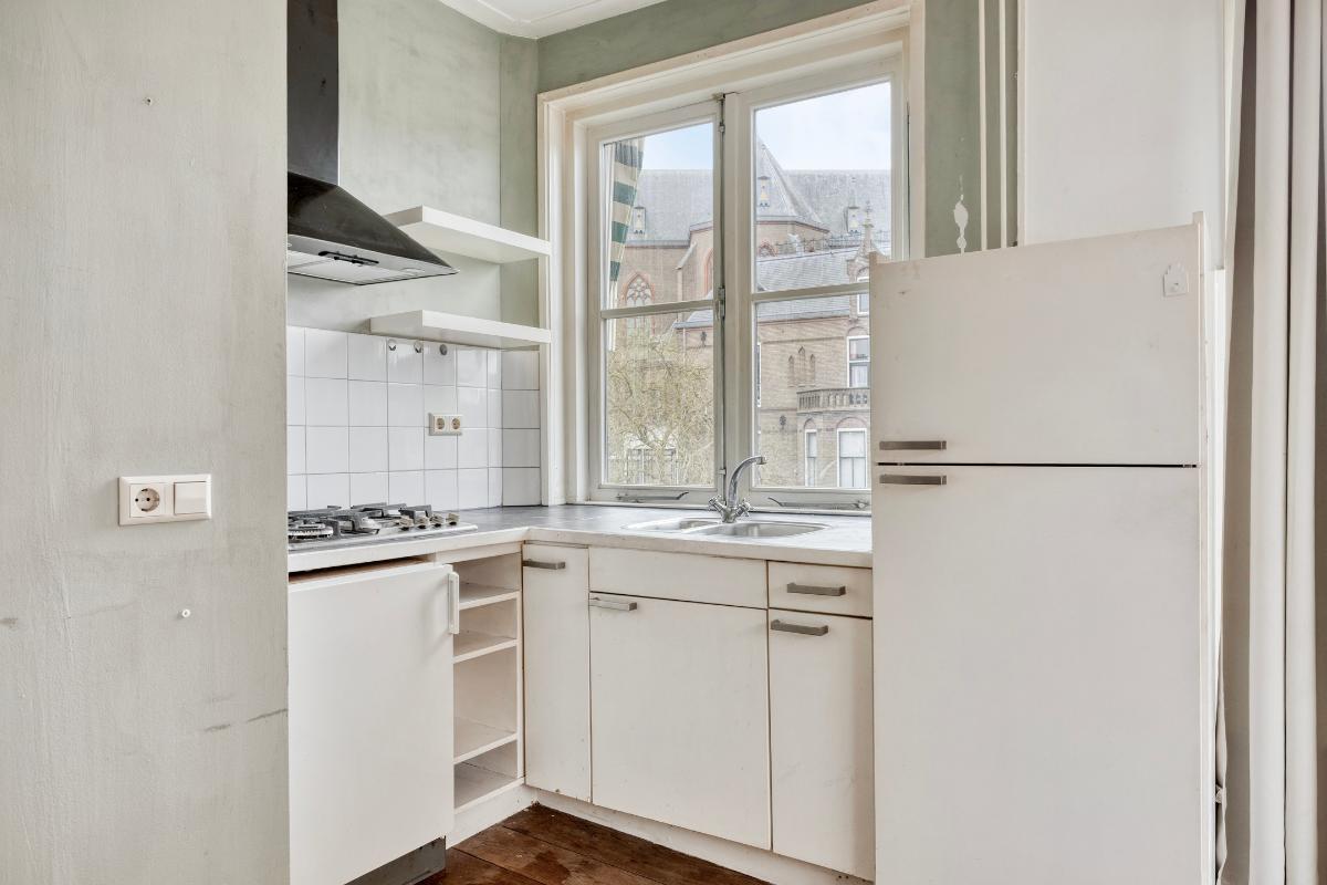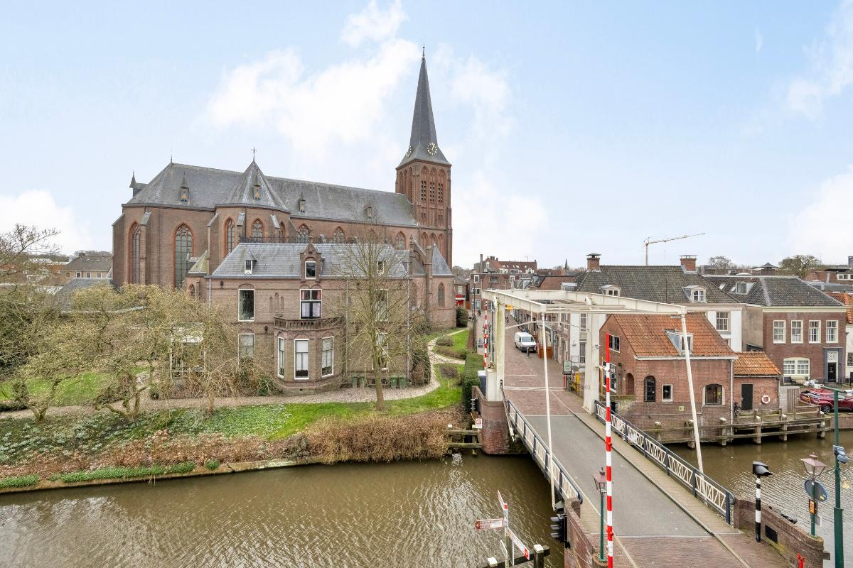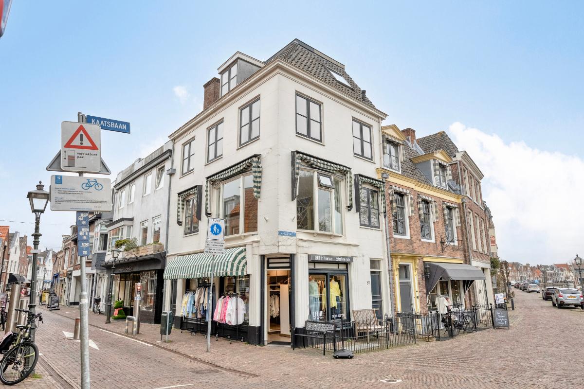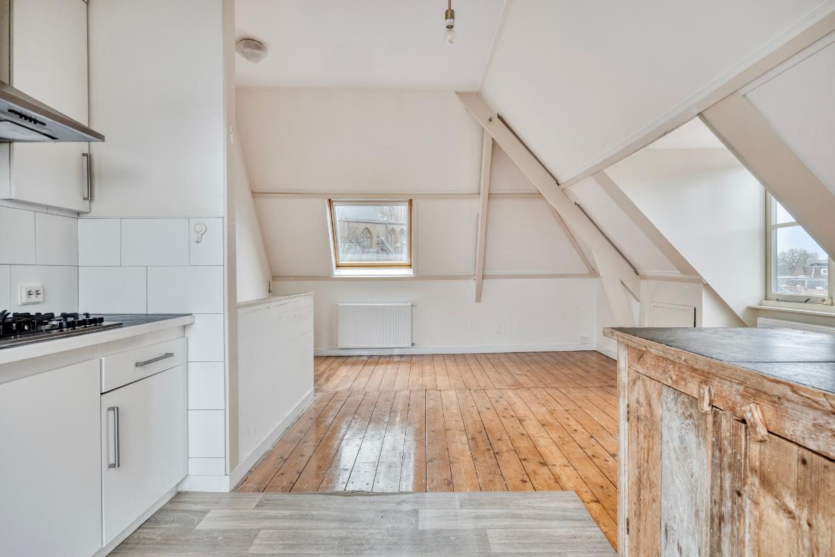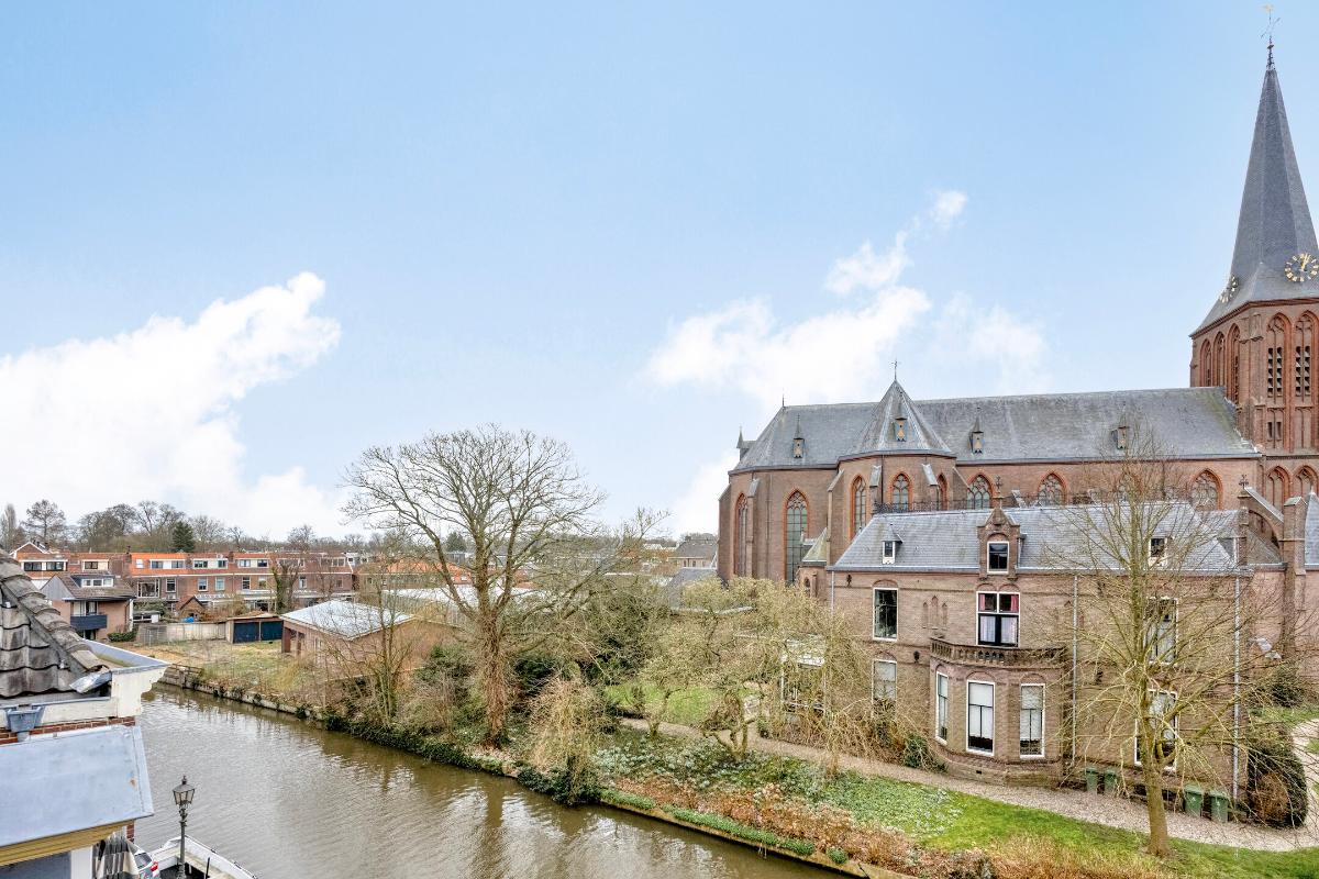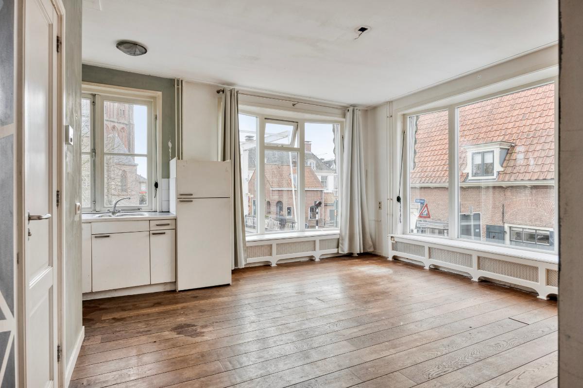 Woonkamer Via de overloop bereikt u de woonkamer. Bij binnenkomst in deze ruime en zonnige kamer valt direct het geweldige uitzicht op. Doordat het appartement op de hoek ligt, heeft u zicht op zowel de Langegracht aan de Vecht als op de Kaatsbaan. Een heerlijke plek om in de vensterbank met een boek te zitten en ondertussen het leven buiten te bekijken.